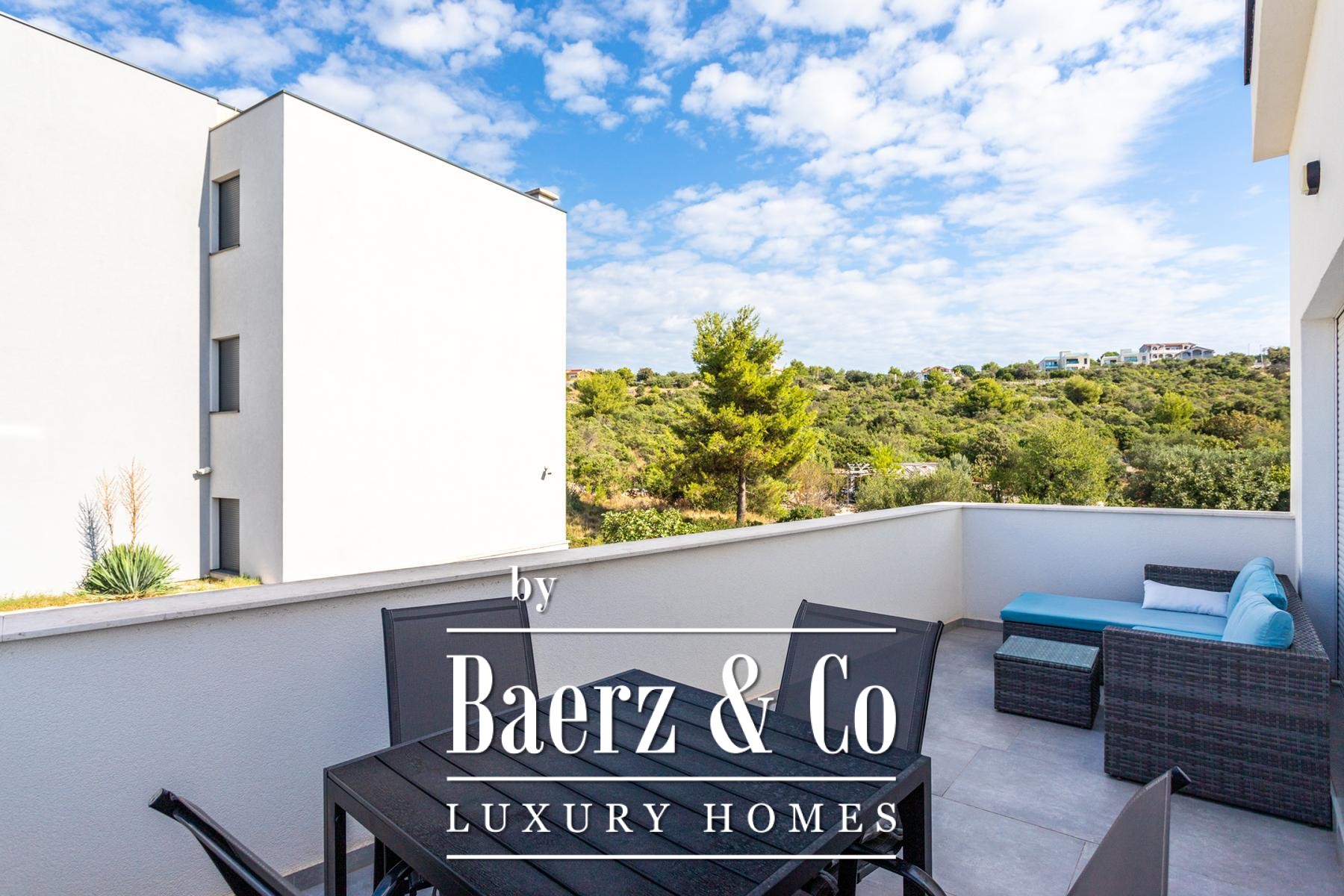 House Rogoznica stands just 90 meters from the Adriatic shore, offering 366.81 m² of considered design across four furnished apartments. This property invites both privacy and versatility, featuring eight bedrooms and eight bathrooms, all arranged to accommodate refined daily living or discreet vacation stays. \n\nThe spatial rhythm flows from a basement with a tailored apartment and four storage rooms, ascending by internal stairs to luminous upper levels. Each apartment consists of a living space with kitchen and dining area, two bedrooms, and a bathroom. Expansive terraces open southward, unveiling sea views that speak to Mediterranean serenity. \n\nBuilt on a compact 207 m² plot in Zečevo, the house is finished to demanding standards and includes three private parking spaces. The setting is quiet, removed from haste, yet the coastline and beaches remain a brief walk away. For those seeking a coastal property with architectural clarity and utility, this house in Rogoznica offers a poised retreat on the Croatian coast.