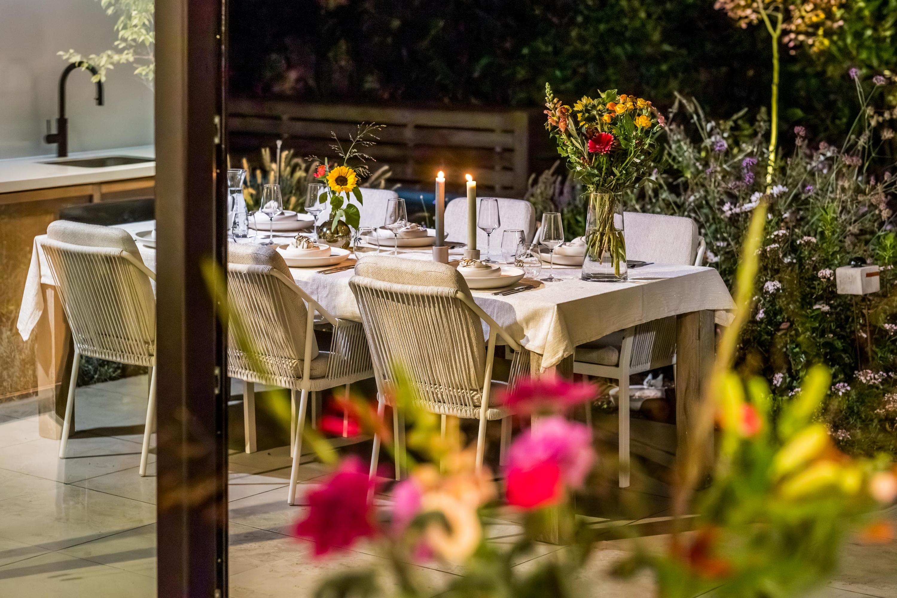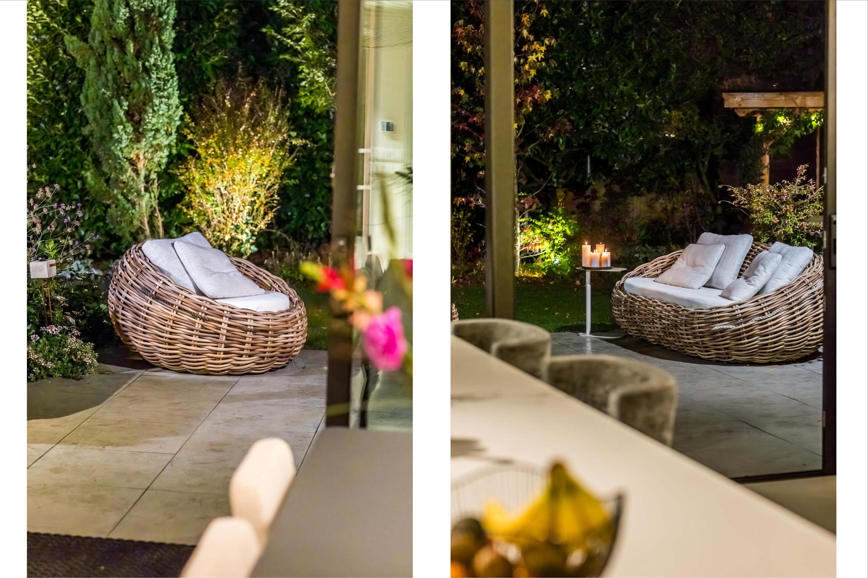 Spatial clarity is expressed through the garden-facing kitchen and living room, anchored by a sleek cooking island and fireplace, with sliding doors that open the space to sunlight and nature. Upstairs, the mezzanine connects four bedrooms, several with air conditioning and bespoke vanities, and a wood-burning fireplace in one suite.