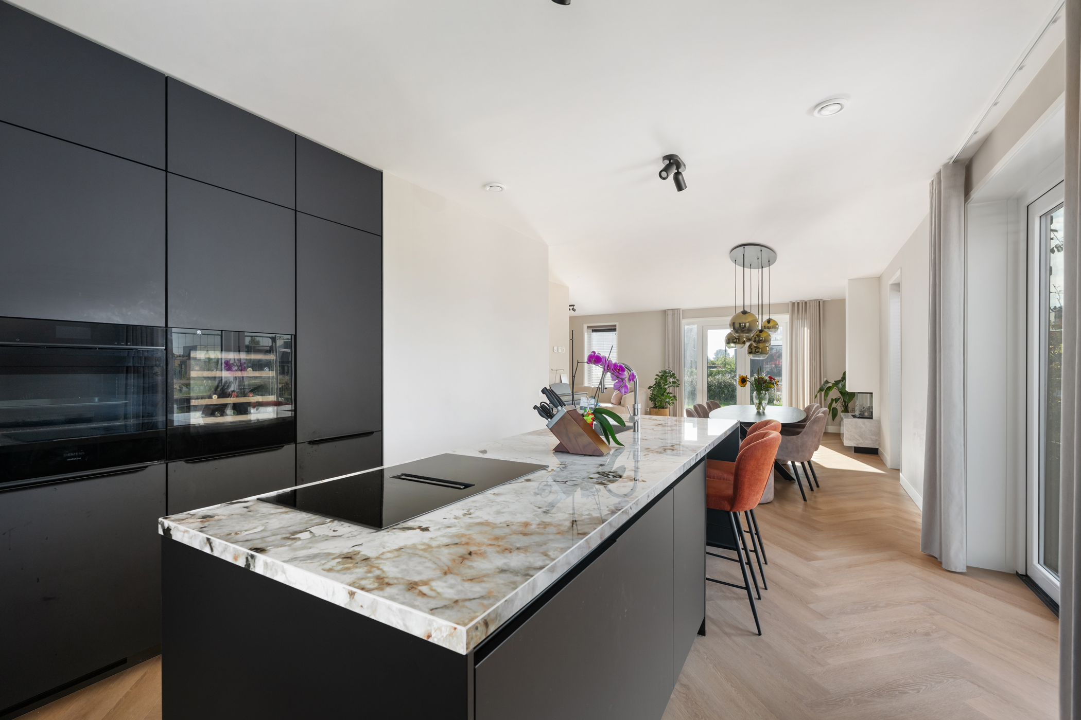 The kitchen is fully equipped with high-quality built-in appliances, including an induction hob with integrated extractor, combination steam oven, refrigerator, freezer, dishwasher, wine cooler, and Quooker (instant boiling water tap).