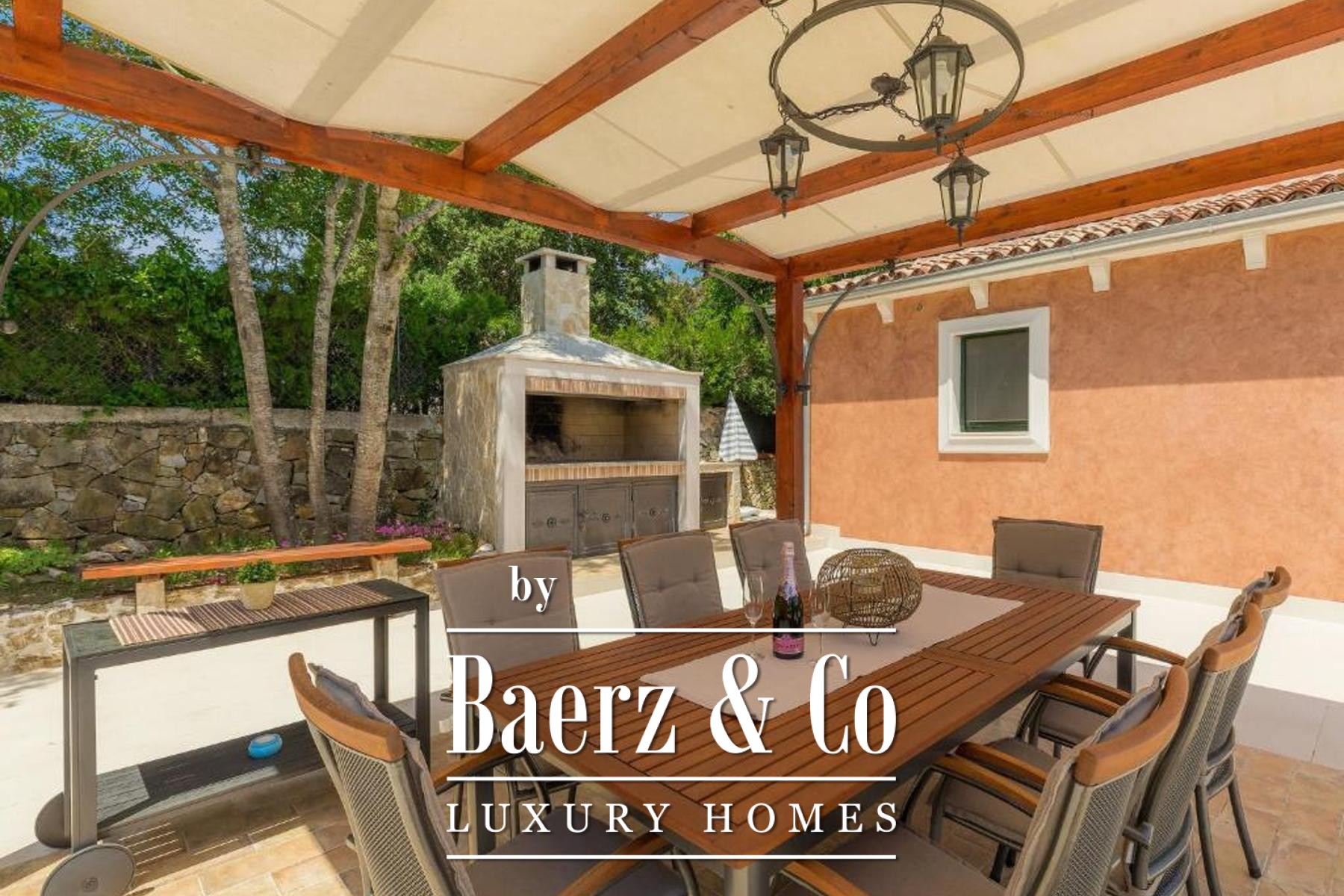The guest house offers a private living room with kitchen, a separate bedroom and bathroom, ensuring autonomy within the estate. Outdoors, a saltwater swimming pool of 32 m² is framed by sun terraces. A pergola-shaded dining area and a large open fireplace invite gatherings, while the fully fenced landscaped grounds are served by an automatic irrigation system from a private well.
