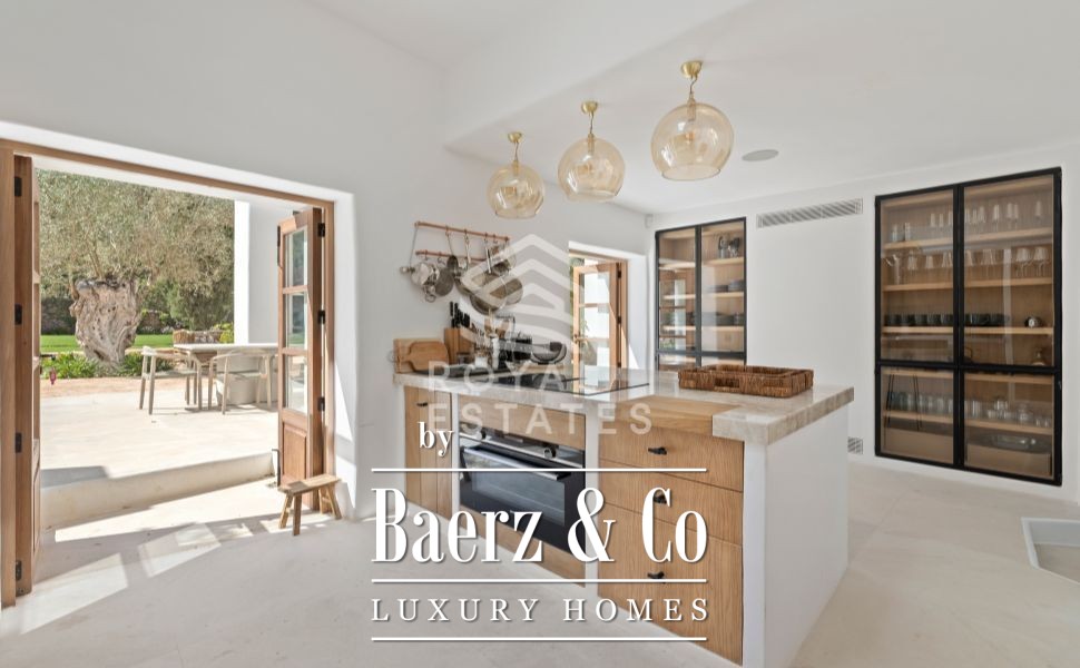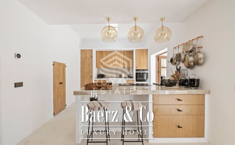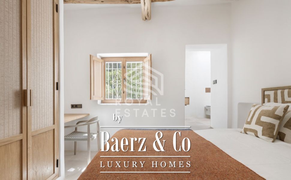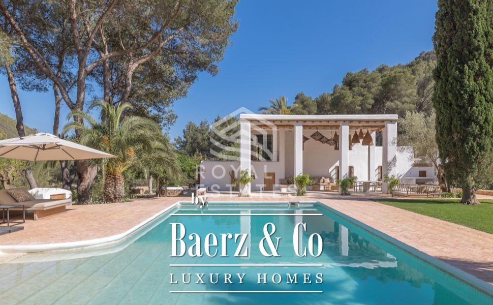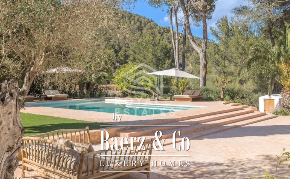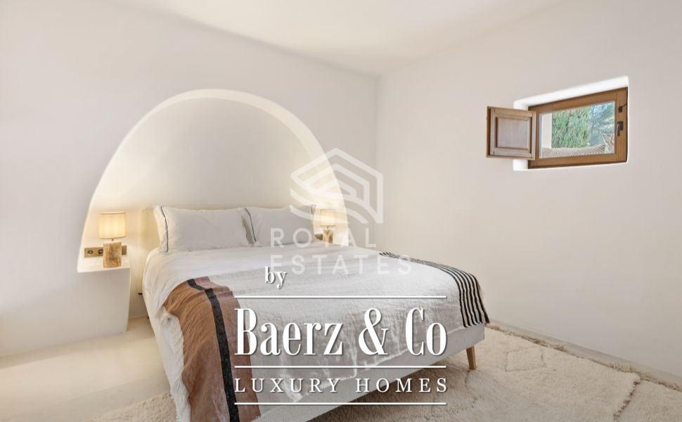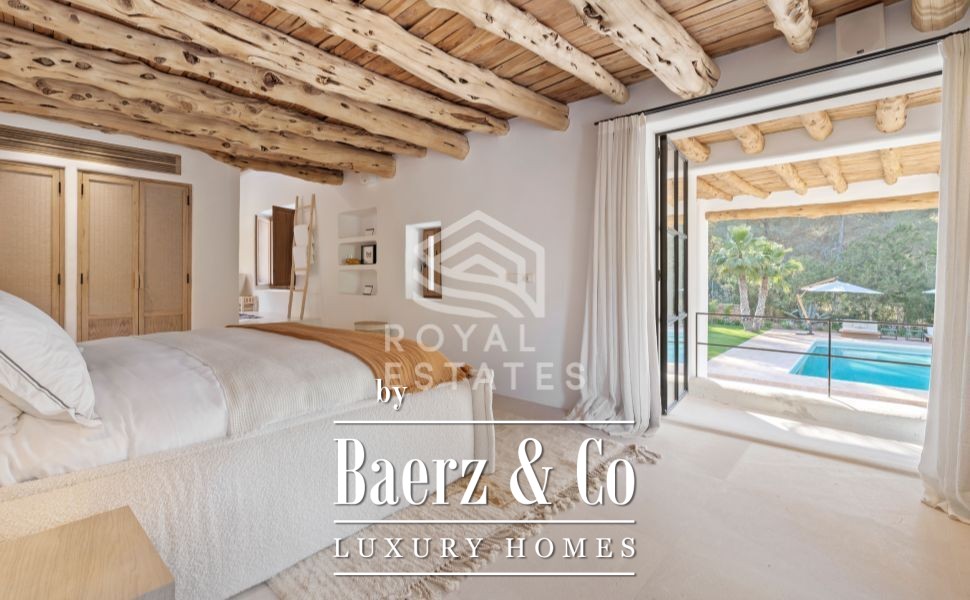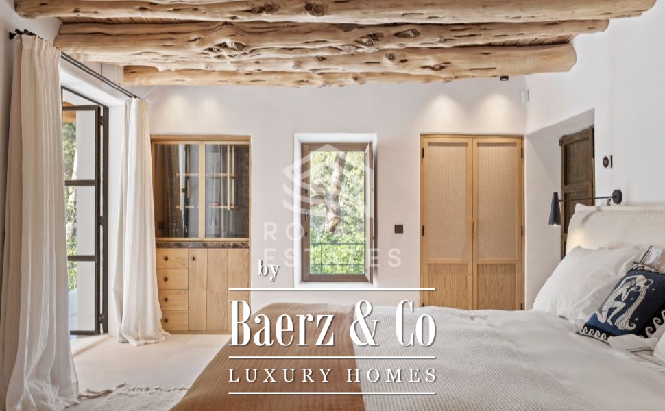 Set within pine forests just outside Ibiza Town, escapism comes naturally at this five-bedroom finca for sale with design by Bloom Studio. Taking inspiration from the lush panorama, organic forms and natural materials define the interiors, designed by island-based practice Bloom Studio. Whitewashed walls and stone floors create calming, understated backdrops. In the living space, custom-made integrated seating is crafted from plaster and curls around the circumference of the room. Straight lines and angles have been softened throughout: practical shelving has been carved into the walls while knotted Sabina wood ceilings preserve a sense of the building's heritage. This pared-back aesthetic continues in the kitchen. A light and airy space, wooden cabinets and marble surfaces bring a polished yet rustic finish that's elevated with integrated appliances, floor-to-ceiling display cabinets and a breakfast bar. For al fresco meals, there's an external pizza oven. From here step out onto the dining terrace, a phenomenal double-height area crowned with a Sabina wood roof. The sheer expanse of the space mirrors the soaring trees in the distance and offers a shaded spot for entertaining or kicking back. A manicured lawn and 10-metre pool complete the outdoor line-up. Calm