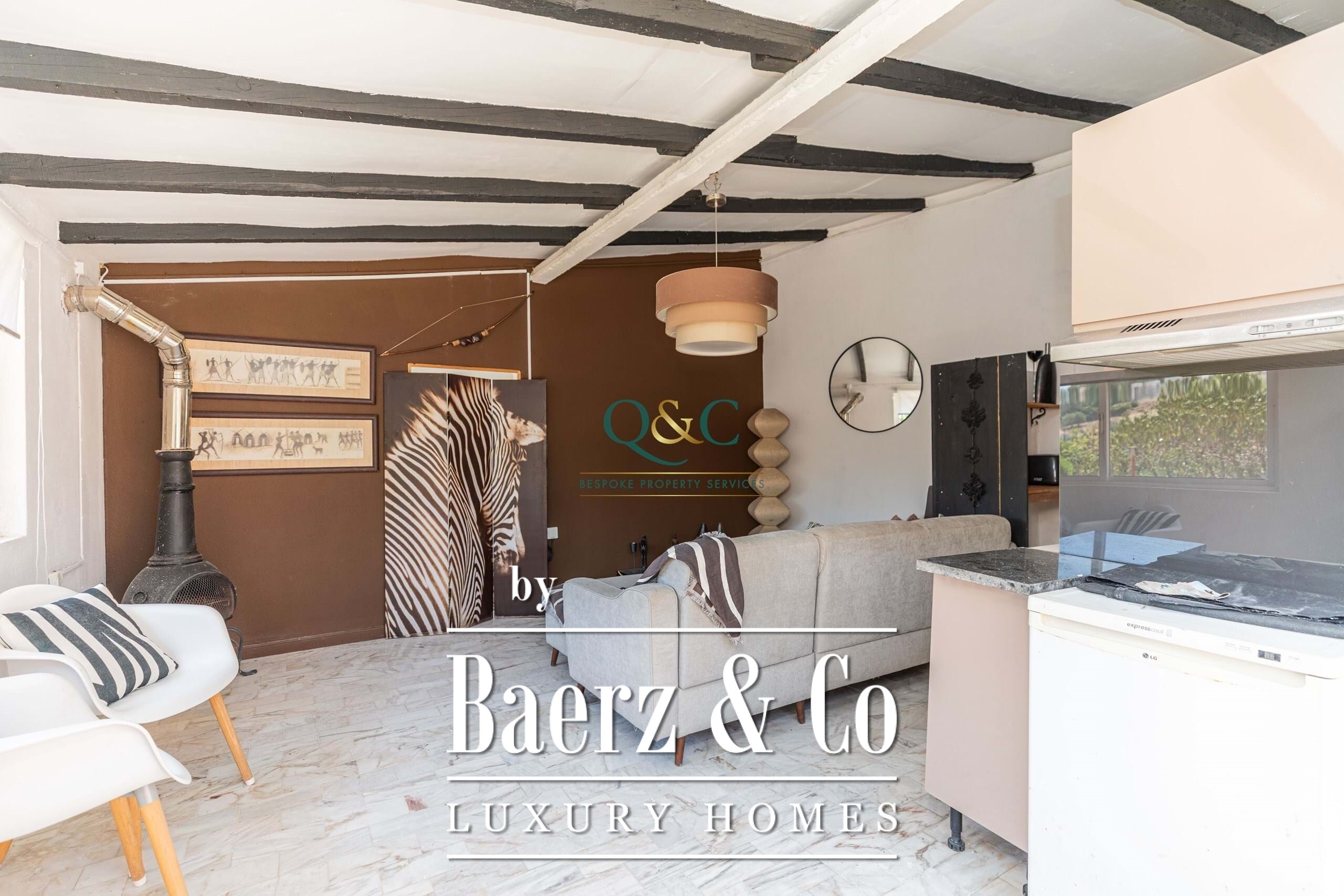 Set behind electric gates, the fully enclosed gardens provide a variety of inviting spaces for both relaxation and entertaining. From the driveway with ample parking, steps lead up to a covered main terrace and double doors opening into a grand entrance hall. This flows into a bright sitting room with fireplace and sliding doors back onto the terrace, as well as a semi-open dining room. A sweeping staircase adds a touch of grandeur, leading to the upper floor.
