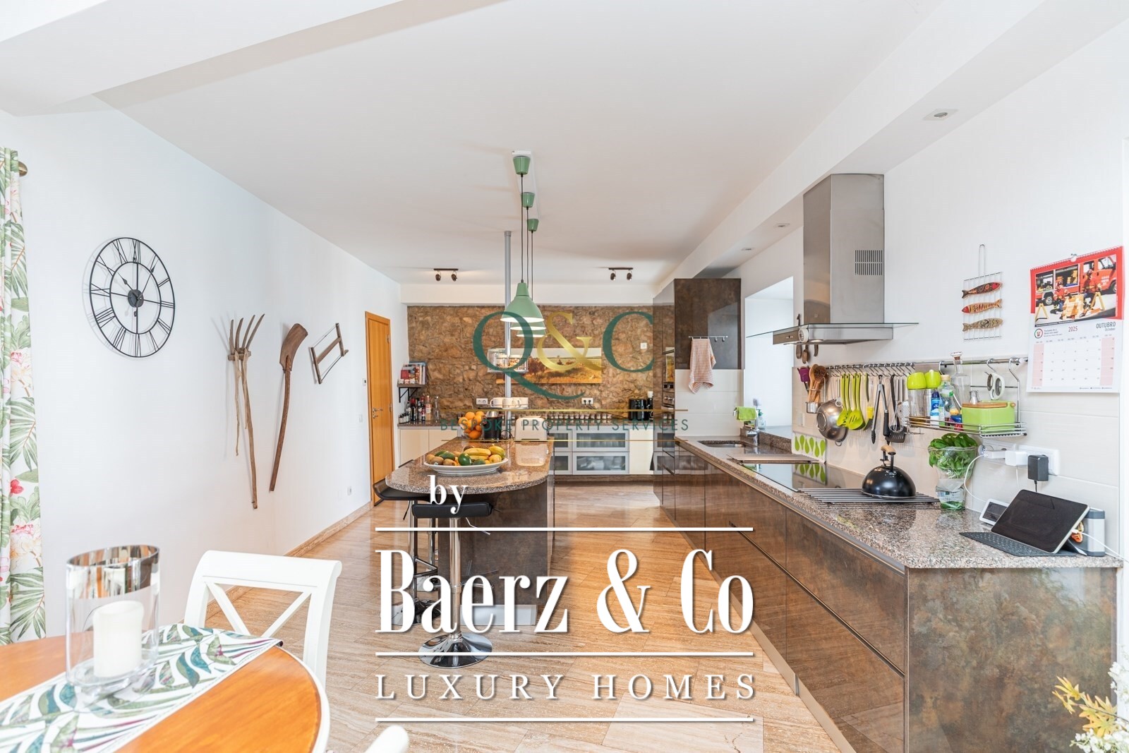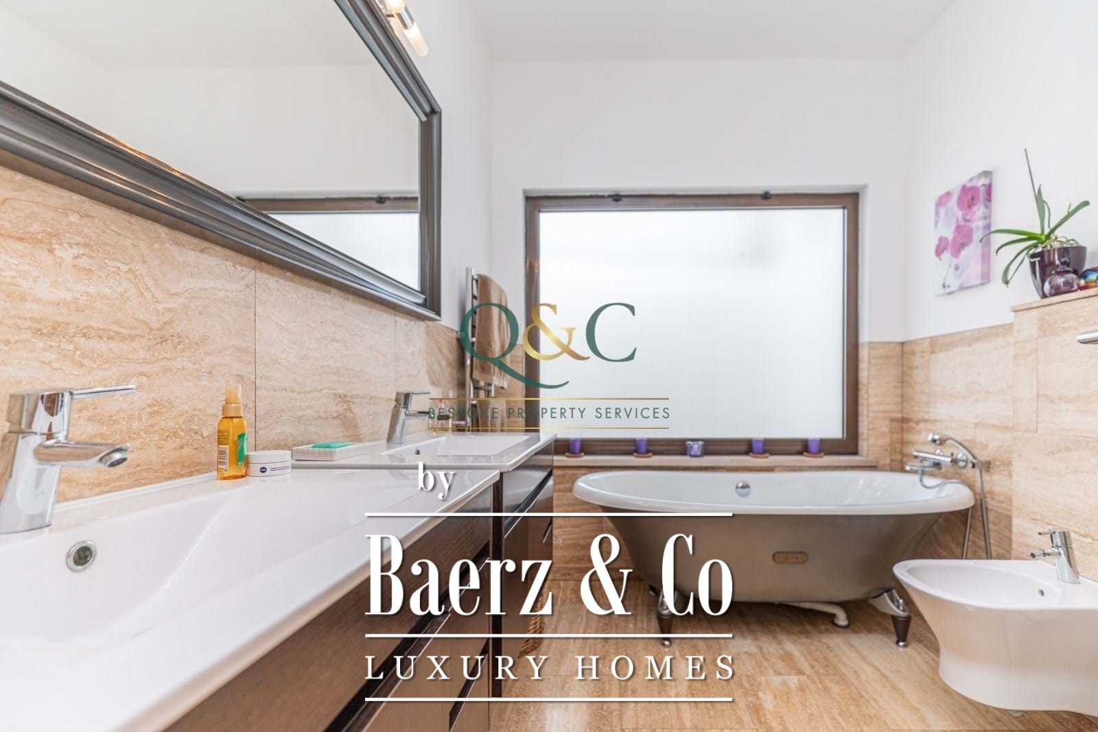 The rear garden is fully walled, providing privacy and a sunlit setting for the 8 x 3 m heated infinity pool and covered alfresco dining areas. Mature, low-maintenance landscaping and calçada stone pathways unify the outdoor experience. Features such as Daikin air conditioning, electric underfloor heating, solar hot water, PV panels generating 6.5 kW with a 12 kW battery system, and mains water enhance comfort and efficiency.