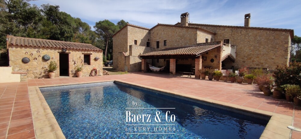 Stone farmhouse Santa Cristina d´Aro sits quietly in the heart of the Empordà countryside, blending authentic Catalan architecture with a pace of life shaped by the land. The farmhouse stands on a 19,000 m² estate with sweeping country and hill views, only ten minutes from famed beaches and golf courses along the Costa Brava.