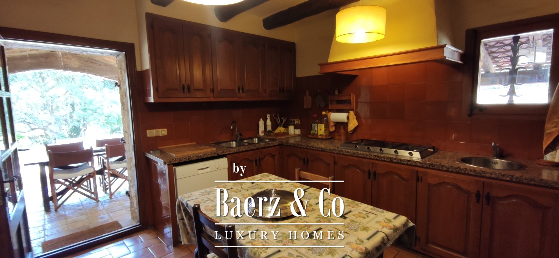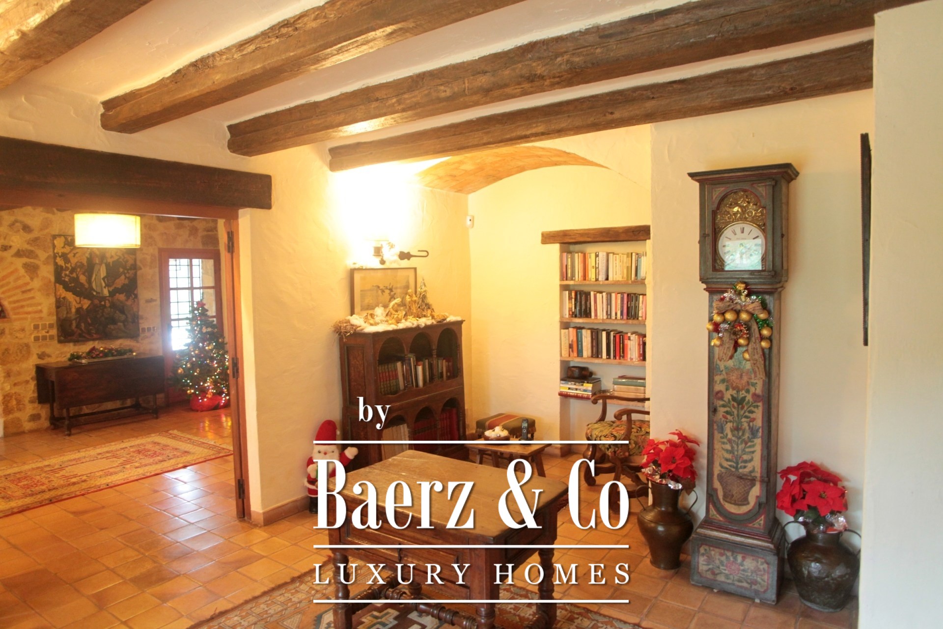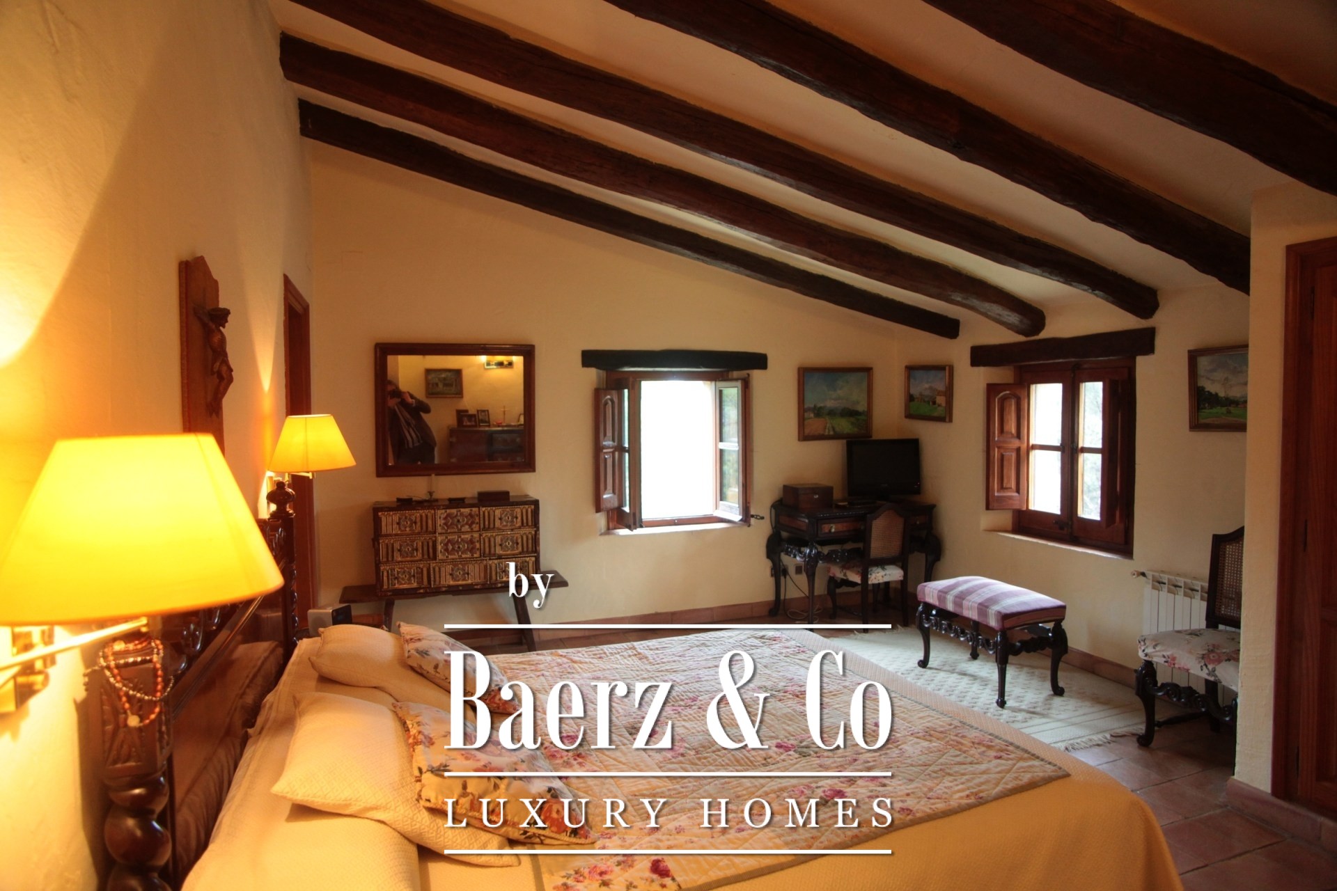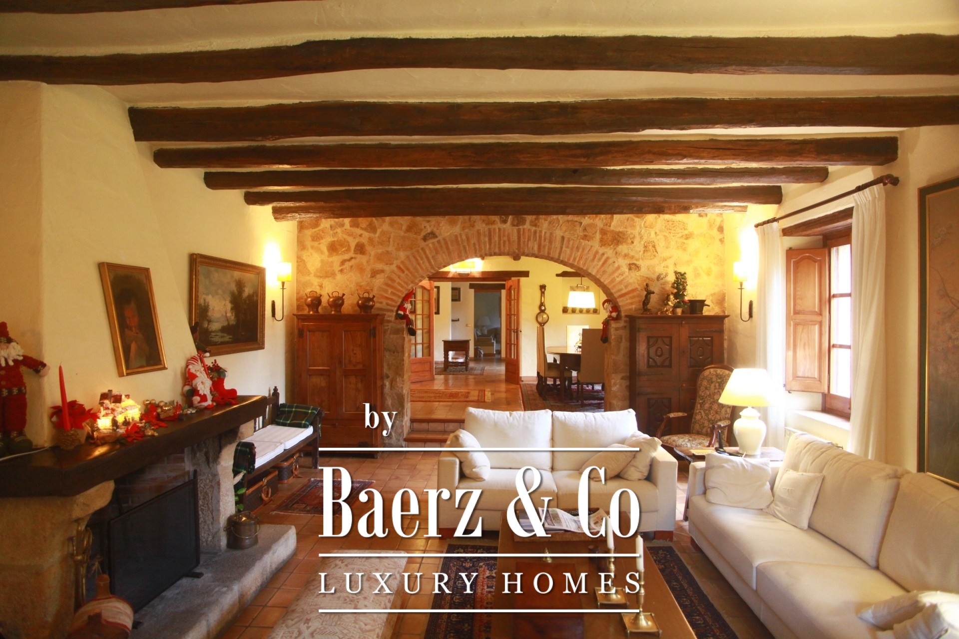 Composed across 513 m² of built space, the residence retains its original beamed ceilings, traditional stoneware floors, and a harmonious mix of whitewashed walls and natural stone. Its arrangement spans nine bedrooms and six bathrooms, flowing through three distinct kitchens, three living rooms, a dining room, and a dedicated office. This flexible configuration invites both family life and quiet retreat, or a sophisticated hospitality project reflecting true Catalan spirit.