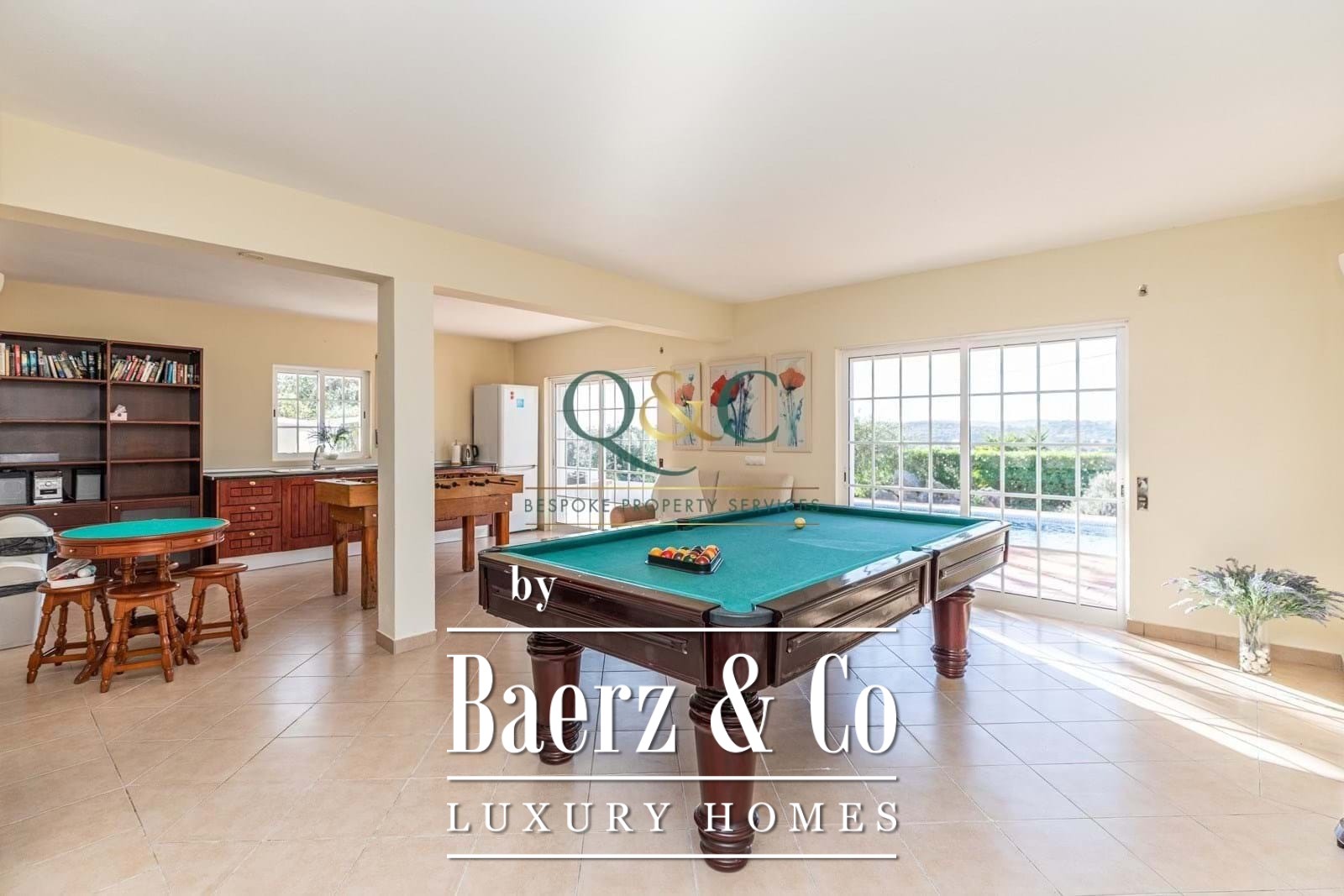 Stairs descend to a substantial games room with its own kitchen and bathroom, adaptable as a fourth bedroom or an independent apartment. Terraces, a roof level with broad vistas, mature gardens, and an expansive pool create opportunities for calm, conviviality, or discreet retreat. Features include air conditioning throughout, double glazing, barbecue, irrigation system, drive way parking, and mains water. This villa offers immediate connection to the rhythms of Algarve country life within reach of urban necessities.