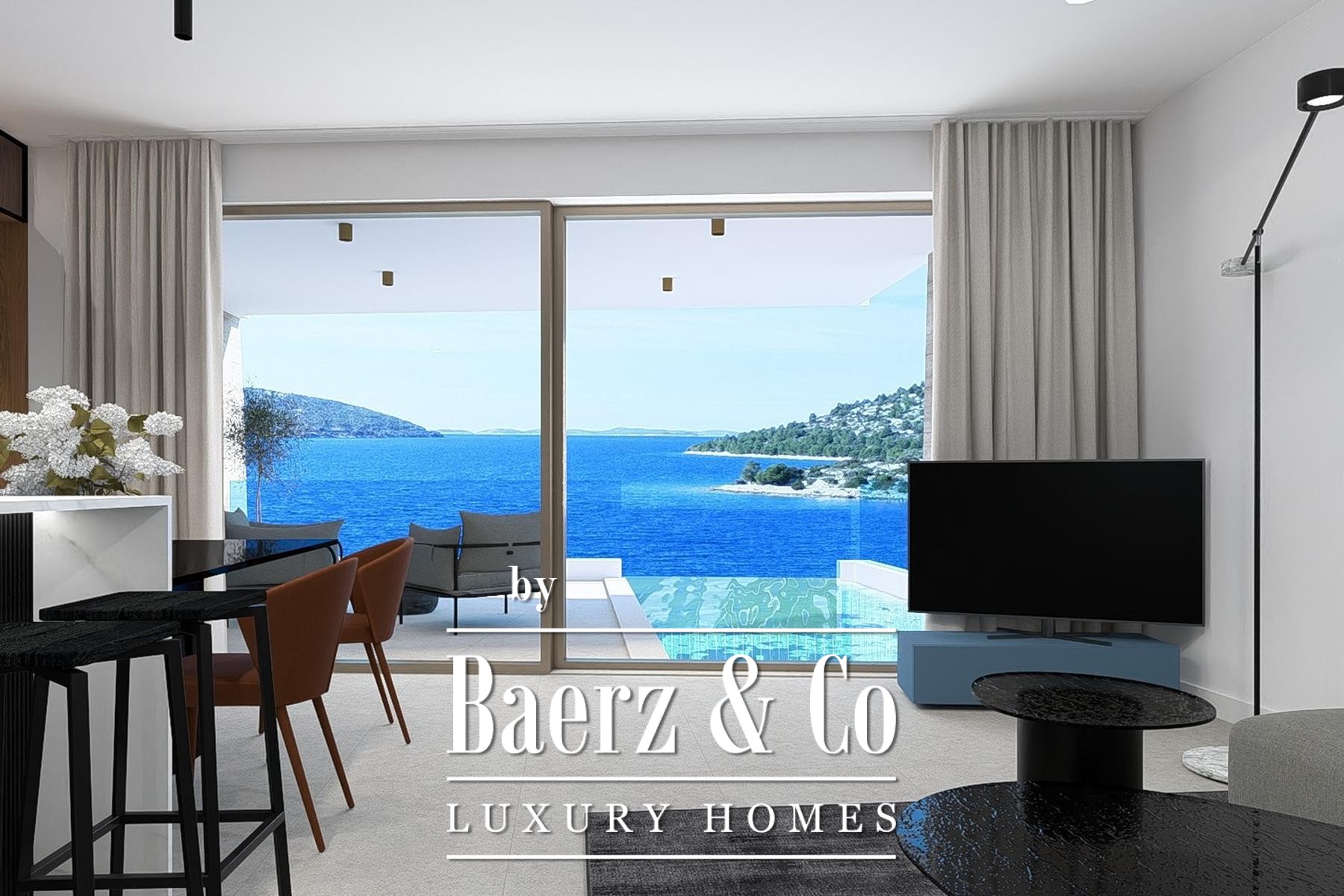 one of which has access to a balcony, a bathroom, a toilet, and a spacious terrace with a sea view. Above the apartment is a large terrace that extends across the entire roof and has a swimming pool and a sunbathing area. Each room has air conditioning, and the apartment also has underfloor heating.The building is located only 40 meters from the sea. This is a luxury project consisting of two buildings, with a total of 9 apartments, where each apartment has a private pool.We are at your disposal for all other information.