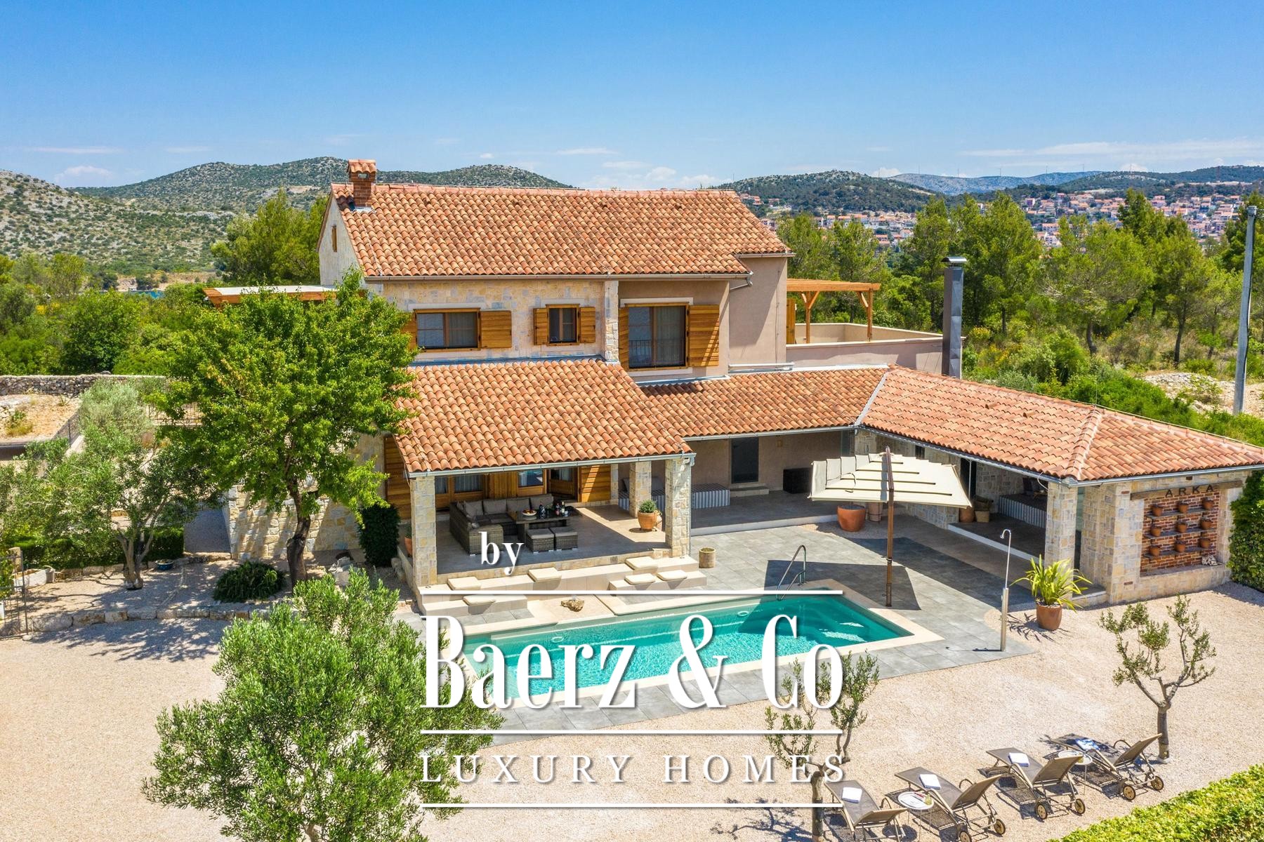 Šibenik, Martinska, beautiful stone villa with a swimming pool, garden and playground renovated in 2015. The size of the villa is 315.62 m². It is secluded in a protected area, which guarantees privacy now and in the future.It is built on 2 floors on a plot of 3680 m². It consists of a ground floor with a living room with a dining room, a kitchen, a toilet, a laundry room and a bedroom with a private bathroom. The living room opens onto large covered terraces by the pool, sundeck and jacuzzi. Internal stairs lead to the first floor where there are 3 bedrooms, each with a private bathroom, a sauna and two terraces covered with a pergola. Next to the house there is also a machine room, a tavern with a fireplace and a room with billiards