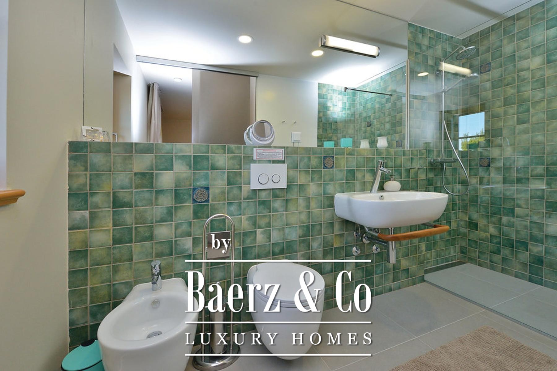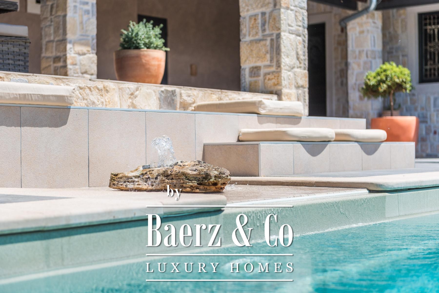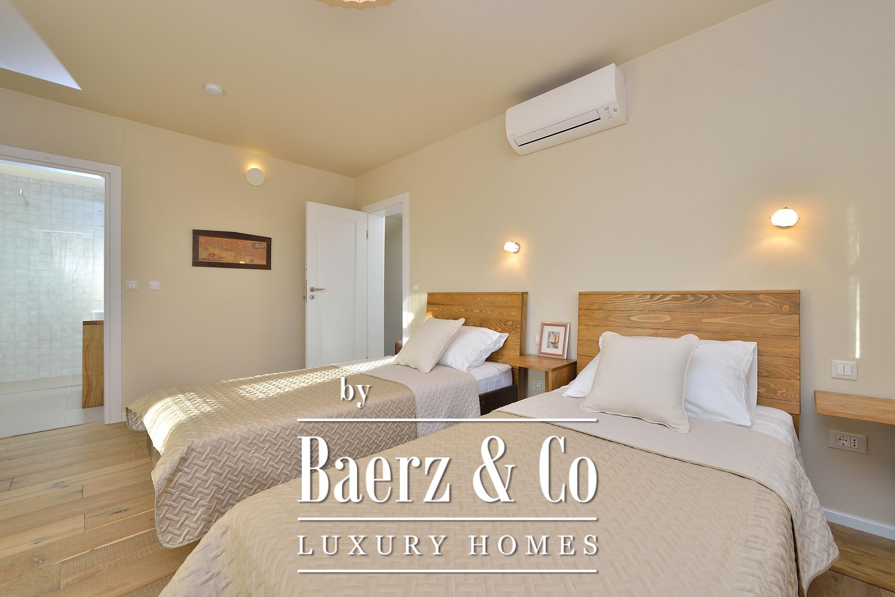 and a sliding glass wall, which allows it to open towards the pool. The complex also includes a sports field with artificial grass, designed for small football, volleyball or badminton, a bocce court, a Mediterranean garden with about 30 olive trees, fruit trees and herbs, and covered parking for 3 cars.The villa is built to top standards and is equally well equipped. Each room has air conditioning, and the bathrooms have underfloor heating. It is also equipped with top-of-the-line kitchen appliances, video surveillance, an automatic irrigation system, an anti-burglary system, 5G internet and a top-of-the-line sound system. It is located in a prime location, less than 150 meters from the sea.All other information on request.