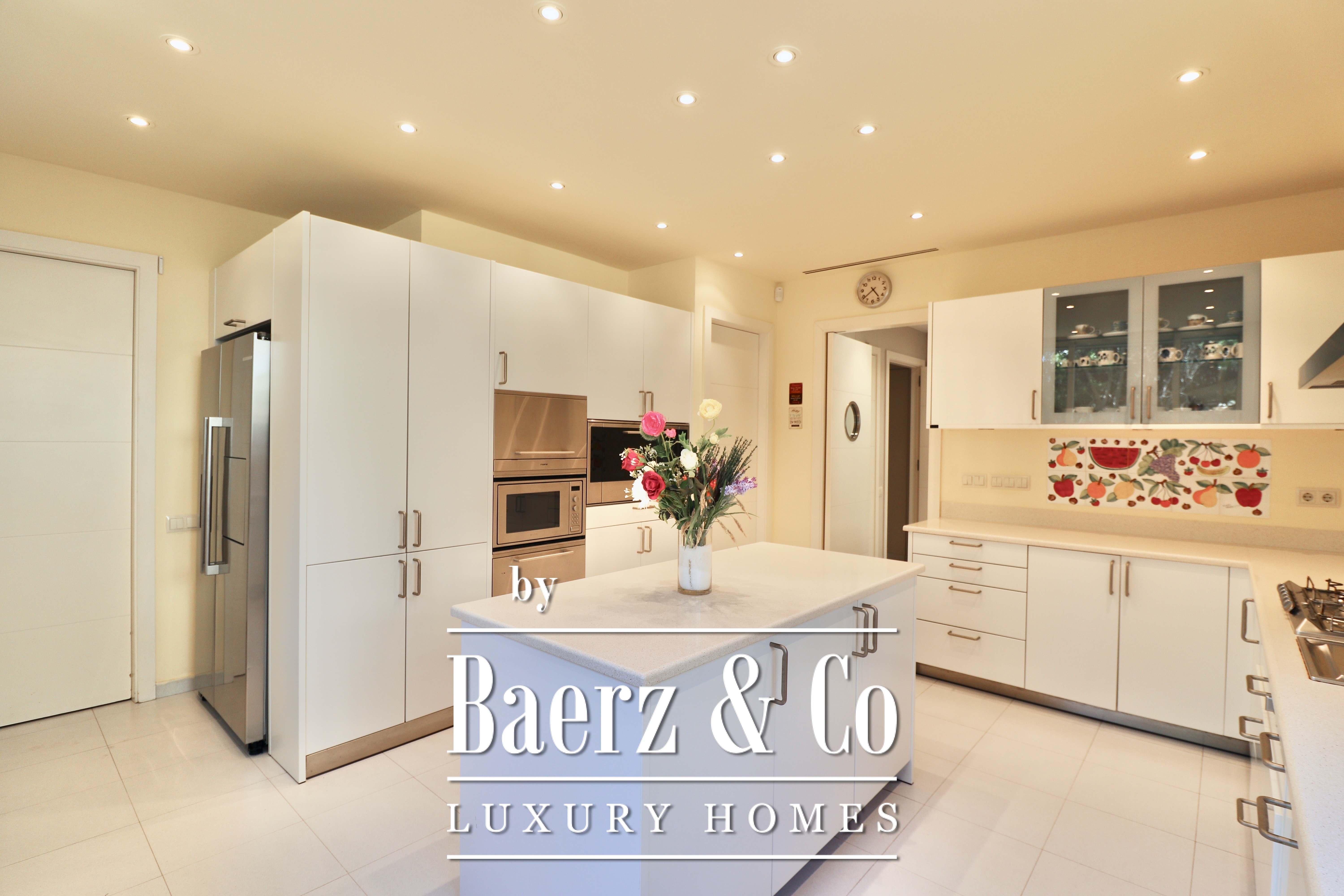Designed for discretion and comfort, the villa unfolds across three levels, connected by a private lift. The main level opens with a refined entrance hall leading to a fluid living space, including living and dining rooms, a media zone, and a fully equipped kitchen with an adjoining service area and dedicated office. Five bedrooms and eight bathrooms allow for both family intimacy and entertaining on a generous scale.