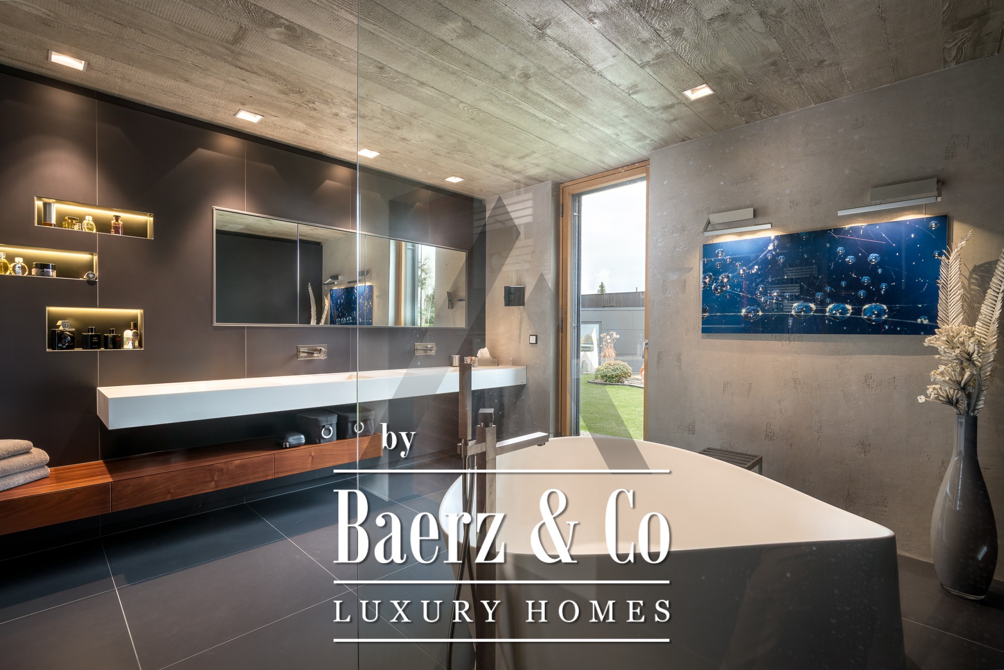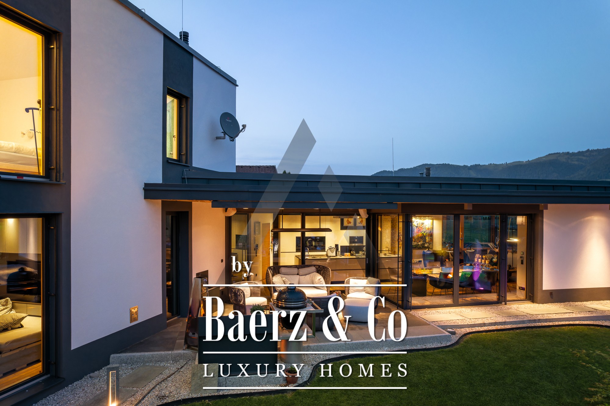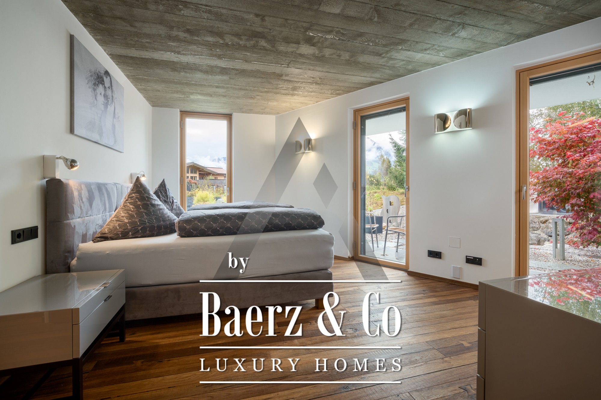 Detached house St. Johann in Tirol is set in a tranquil, sun-drenched position, offering sweeping views of the Kitzbühel Horn and Wilder Kaiser mountains. This contemporary property, offering 418 m² of living space on a 1,186 m² plot, captures the essence of refined alpine living. An idyllic landscape unfolds with a pond, landscaped streams, expansive terraces, and panoramic mountain vistas. The outdoor realm is enhanced by a stainless steel pool, a Treesse designer whirlpool, and a sauna, inviting leisurely mornings and restorative afternoons.