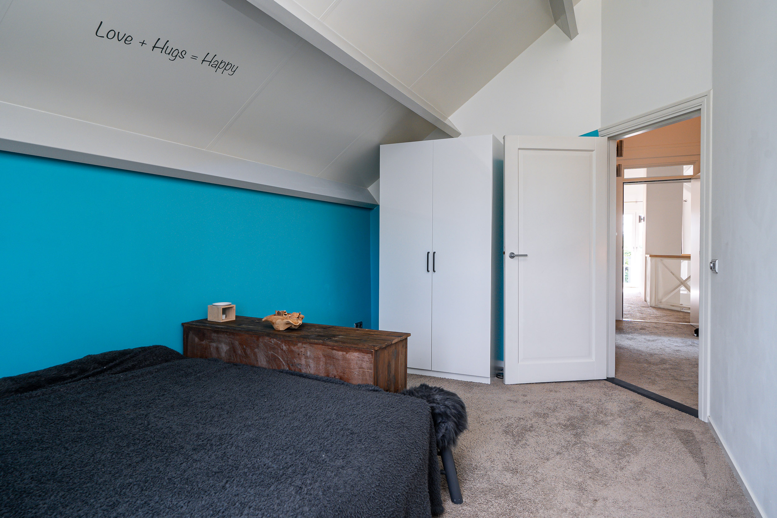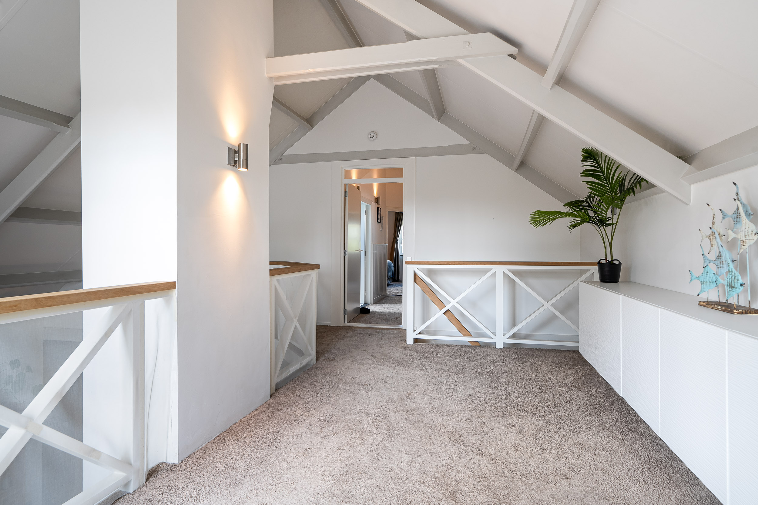 A door separates the landing from the bedrooms and bathroom. There are three generously sized bedrooms on this floor and a second spacious bathroom with underfloor heating, a double sink vanity, a walk-in shower, and a toilet. There is ample built-in storage in all rooms and along the sloped ceilings of the landing. Heating is provided through a warm air system.
