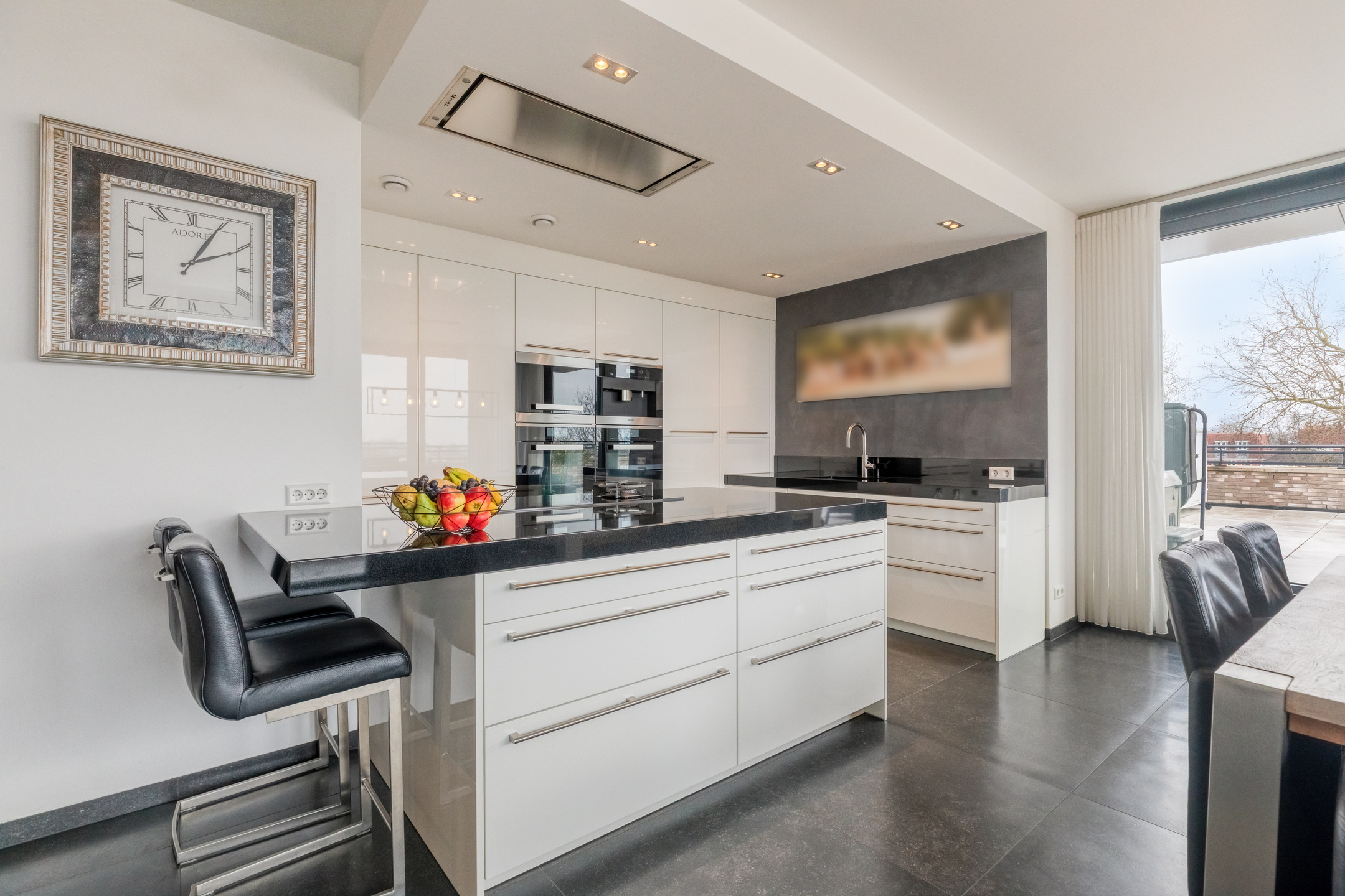 The modern open kitchen is finished with a tiled floor, plastered walls, and a plastered ceiling with recessed lighting. The luxury kitchen setup includes a high-quality granite countertop, sink, fridge-freezer combination, two electric ovens, coffee machine, high-pressure steam oven, dishwasher, extractor hood, and a cooking island equipped with an induction hob and a separate gas wok burner.