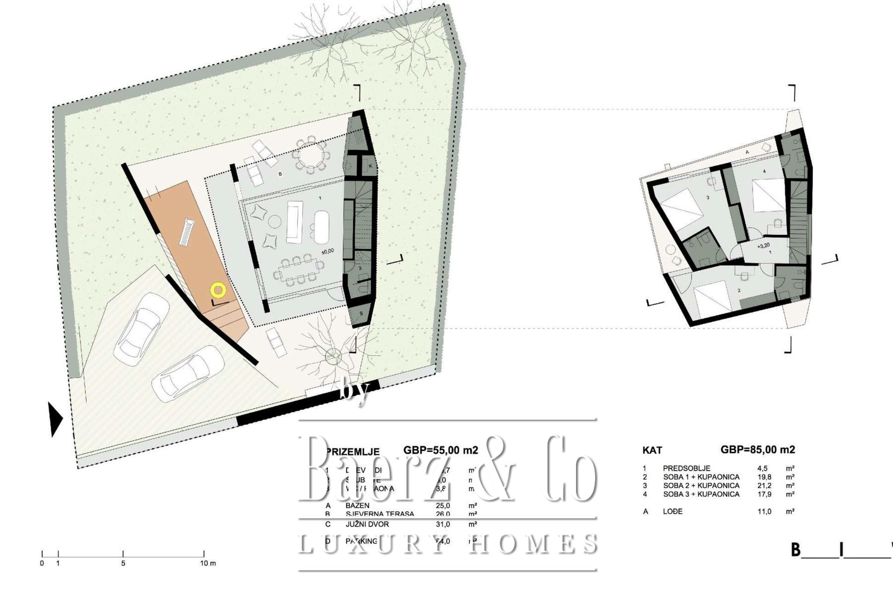 Luxury villa Sutivan with pool and sea view is positioned within an exclusive contemporary complex of 14 new-build residences in west Brač. The villa offers 140 m² of living area distributed across two carefully planned floors. The ground level reveals a spacious living room with expansive sea views, a refined kitchen with dining space, and access to a sun terrace with a swimming pool, inviting a seamless connection between interior and exterior. A guest toilet with laundry is also present on this floor.