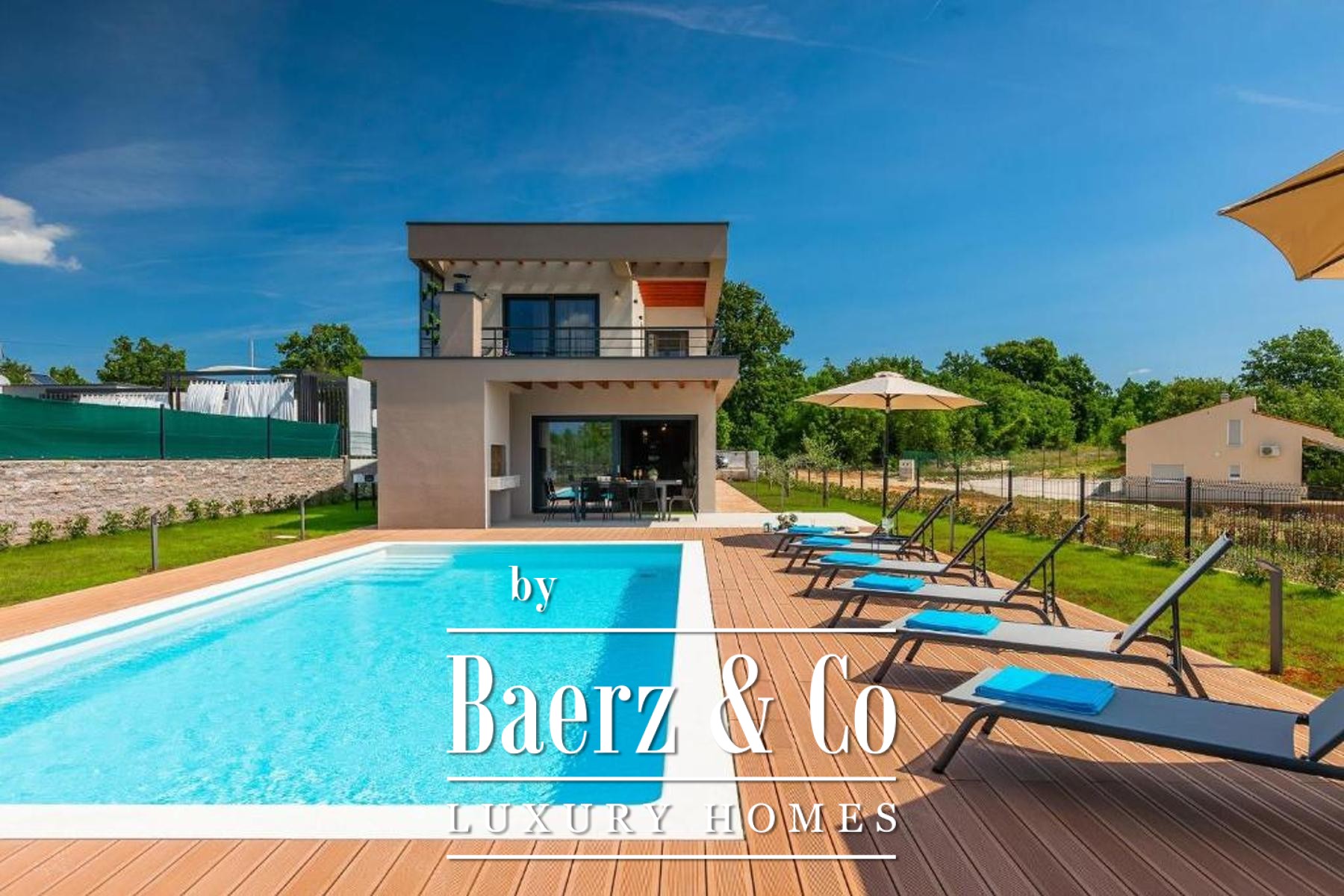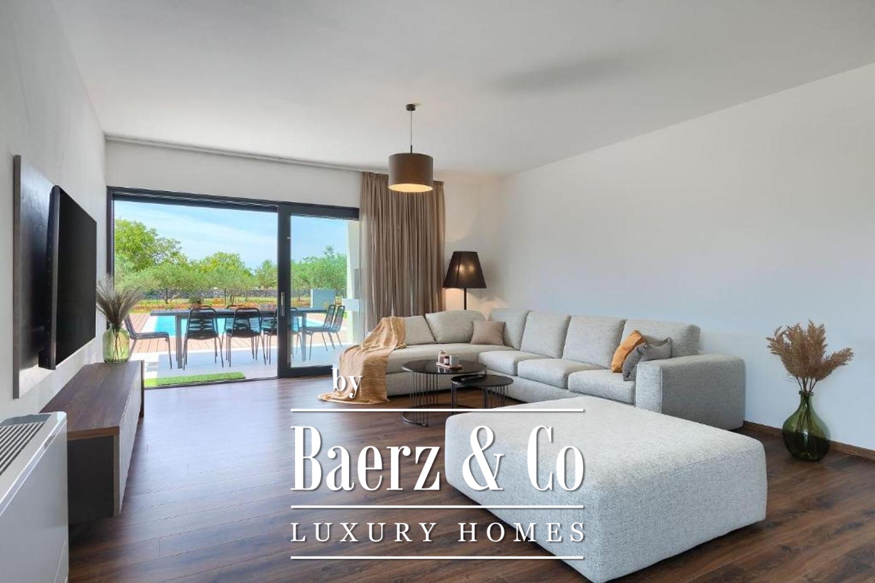 Outdoors, a fully fenced garden invites relaxation, its centrepiece a 50 m² heated pool finished in ceramic tiling and bordered by a tranquil sunbathing area. Modern heating and cooling systems throughout the villa underscore year-round comfort, whether for permanent residence, holiday retreat, or as a luxury villa for sale in Svetvinčenat. The environment, both natural and architectural, reflects an investment in privacy, quality, and the unhurried elegance of Istrian life.