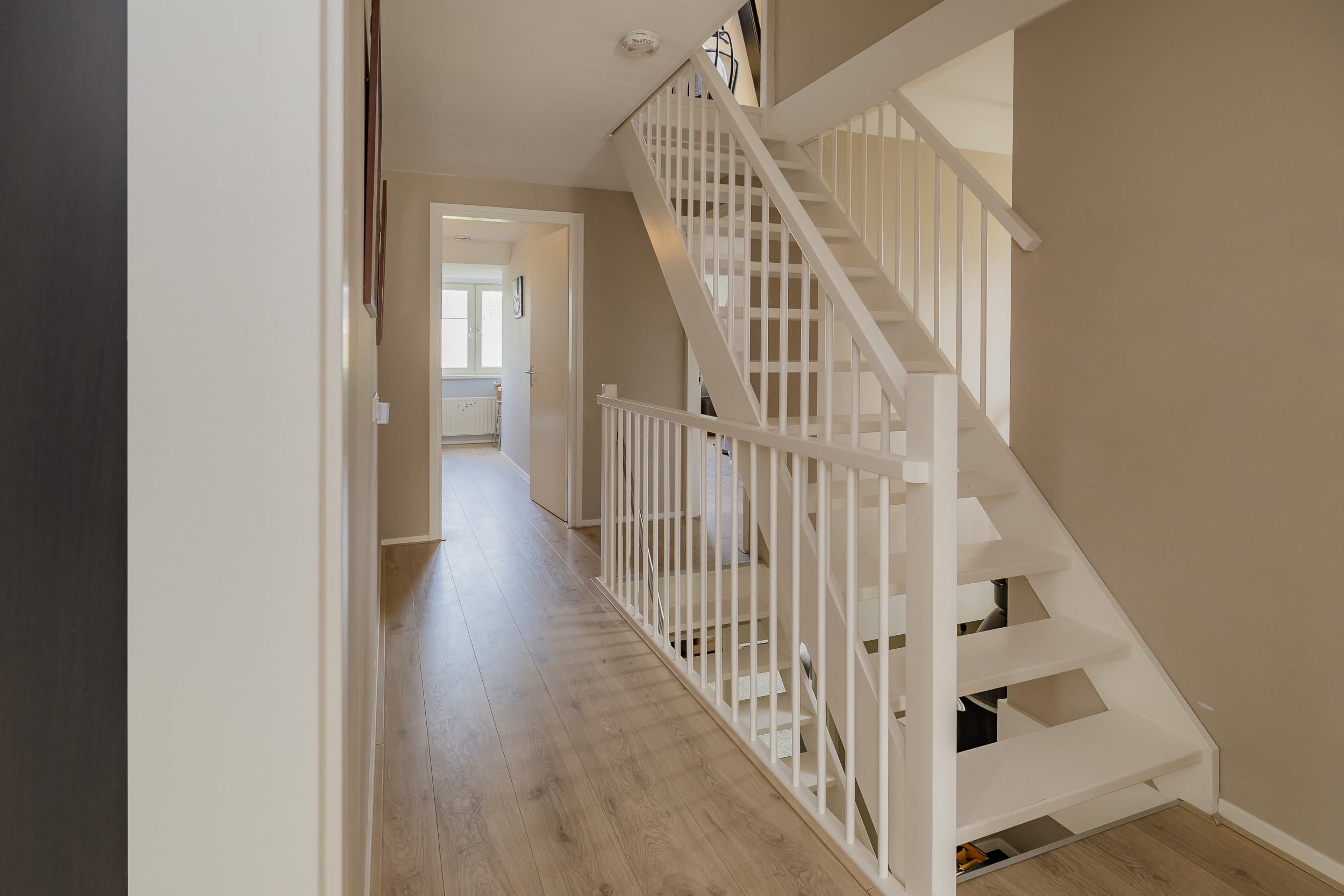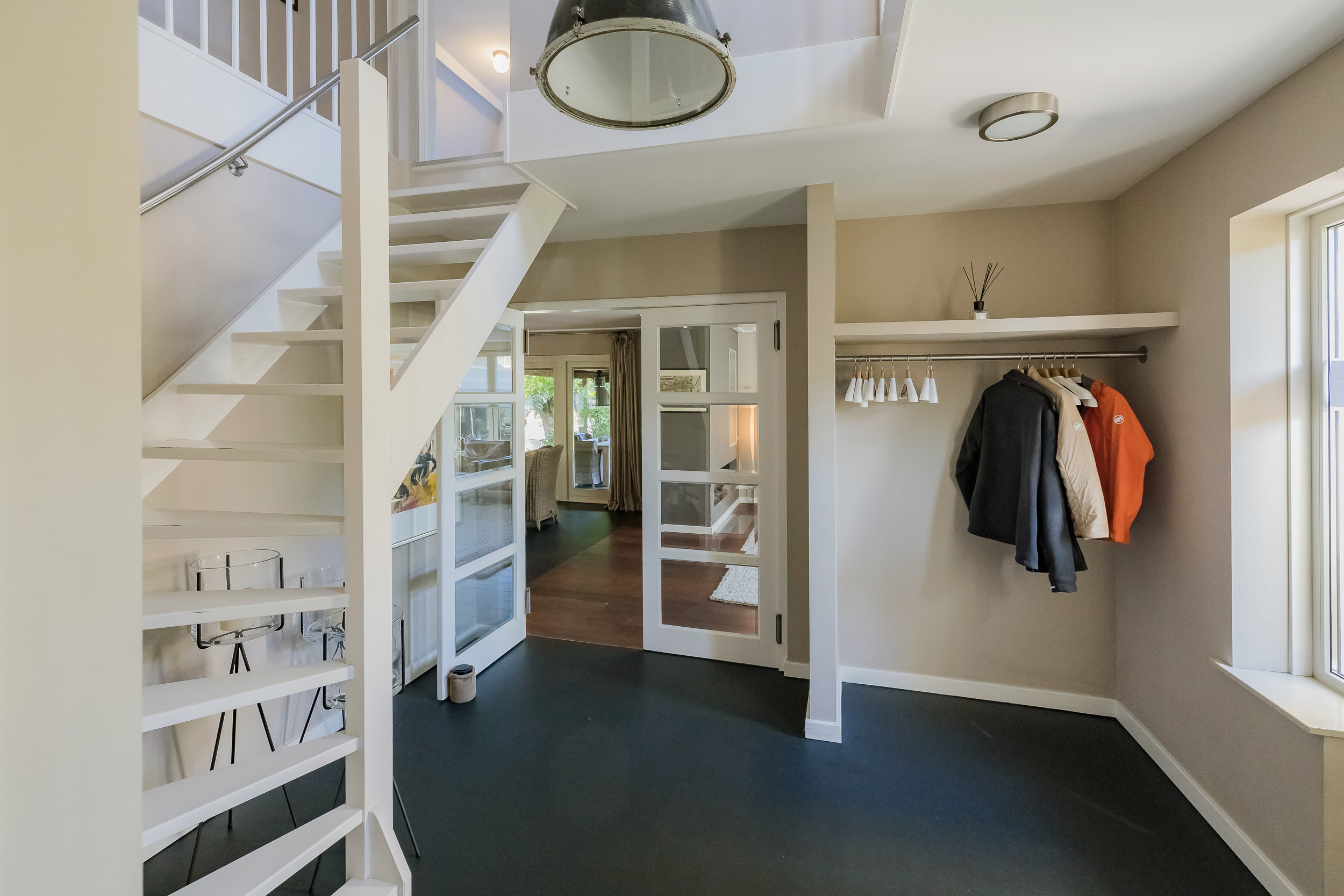 You enter a beautiful hall with a loft, which immediately gives a feeling of space. Here you will find the cloakroom, toilet, stairs, and access to the living room.