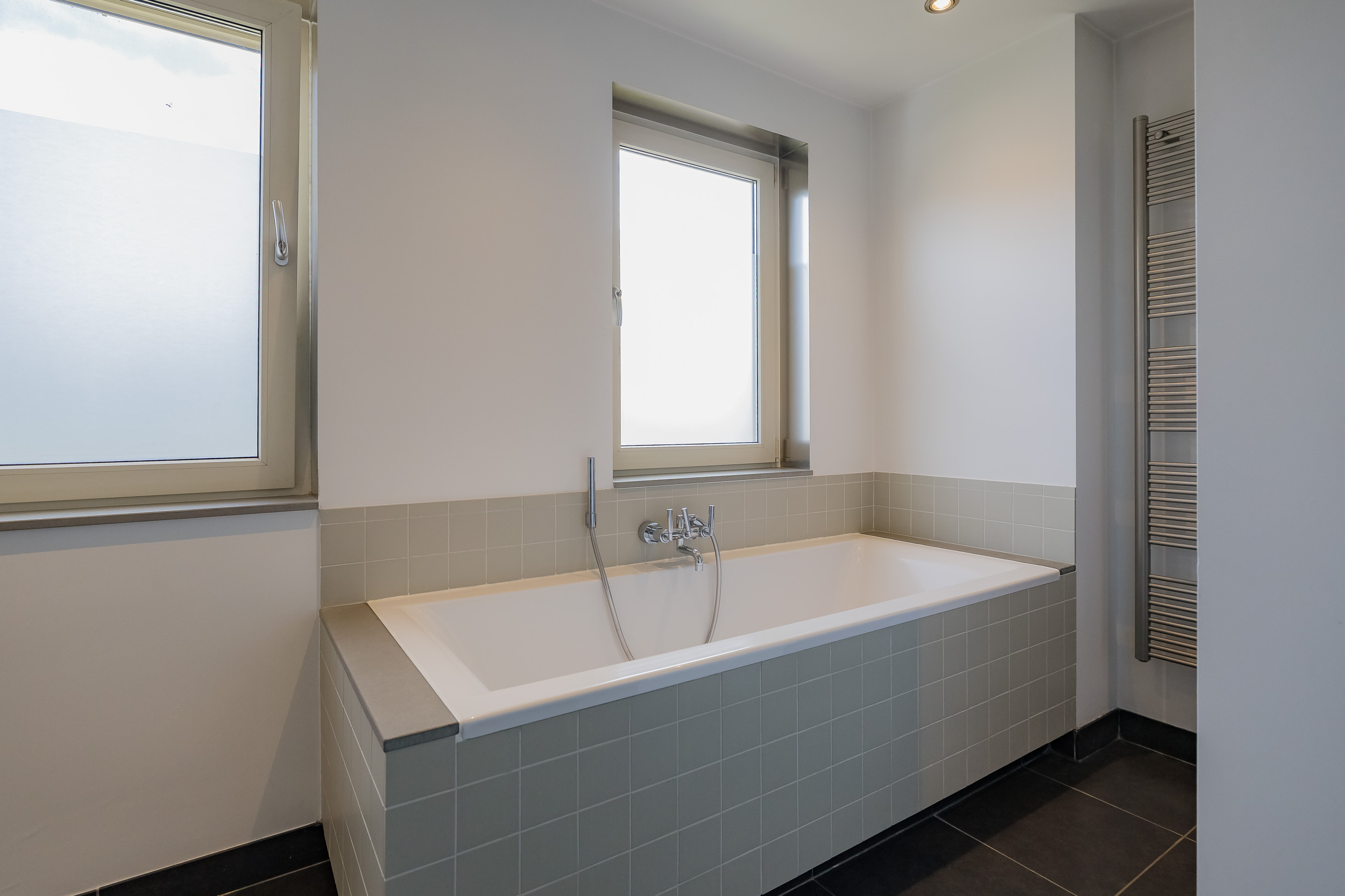 The modern open kitchen with cooking/sink island is fully equipped with high-quality Miele and Bosch appliances, including two ovens, a large freezer, and a large refrigerator. An added bonus: the kitchen has been enlarged by adding a room, which is equipped with an extra stainless steel worktop with sink.