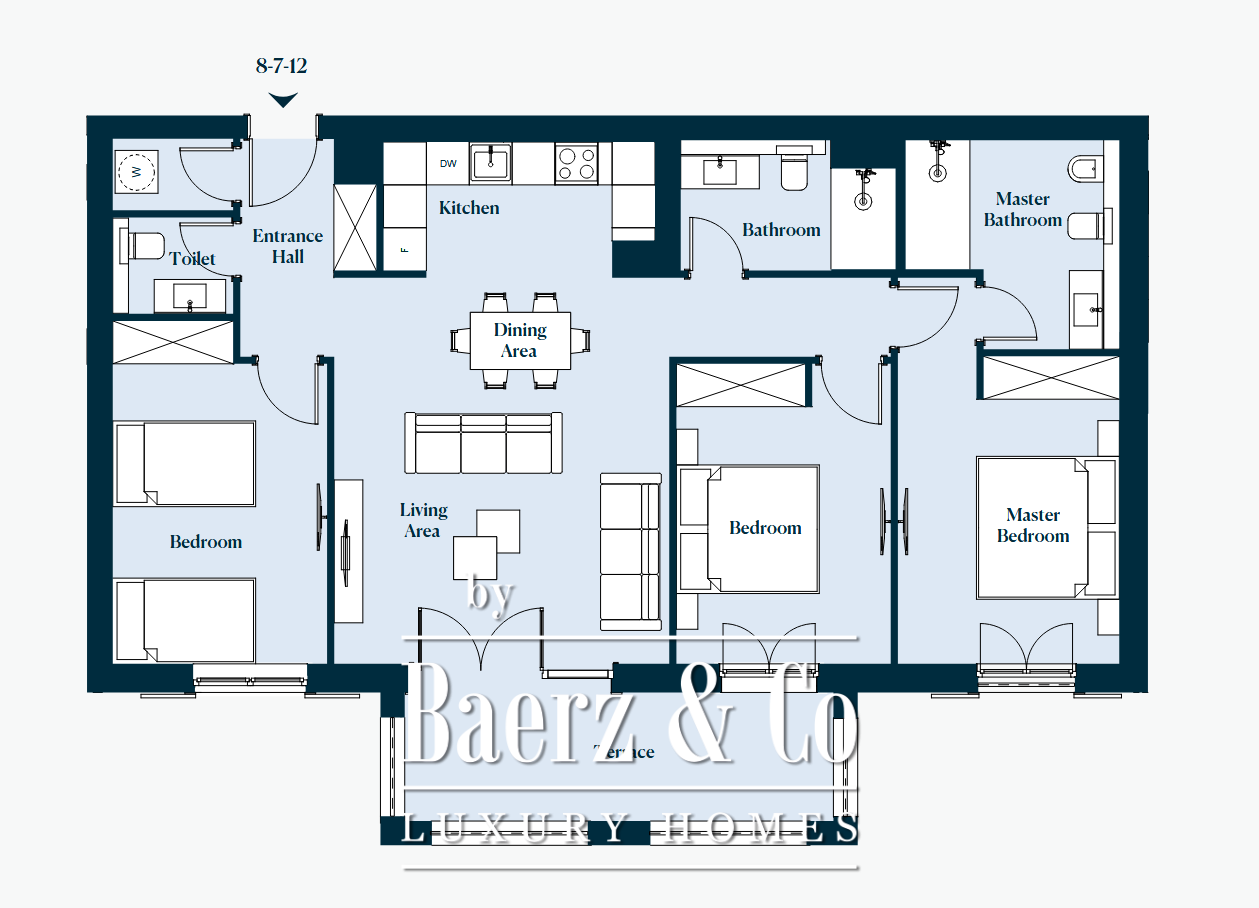 The layout supports both harmony and privacy with three bedrooms, two bathrooms, a separate toilet, and a fluid open-plan living and dining area. Floor-to-ceiling wardrobes, custom Nolte kitchens with fully integrated appliances, and underfloor heated bathrooms present a considered approach to daily life. Air flows quietly through a wind-free system, while video-enabled entry underscores privacy.
