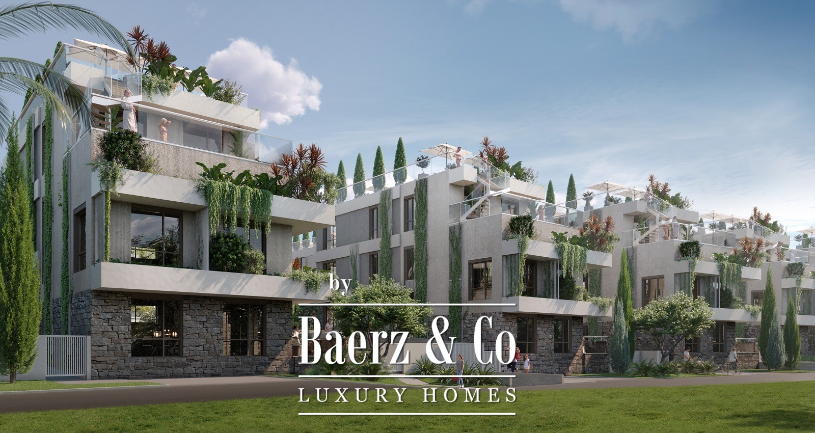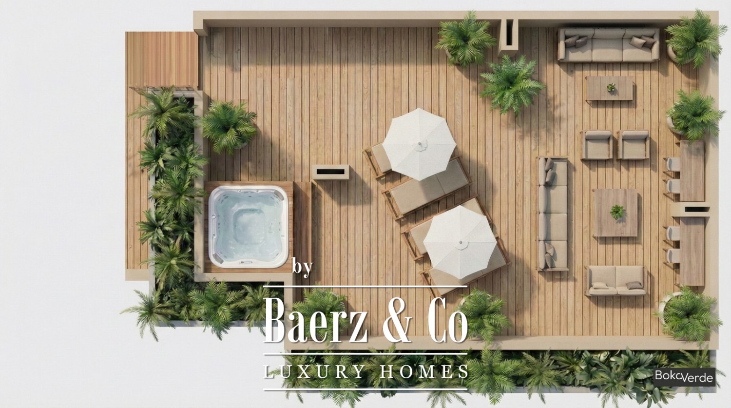 Set within a newly completed development of nine low-rise buildings, the residence combines intimacy with considered architecture. The apartment measures 122.38 m² and includes two bedrooms, one bathroom, a guest toilet, and a luminous living area that opens to a generous terrace. Above, a private rooftop terrace of 99.92 m² commands expansive views across the bay and mountains, inviting quiet moments and effortless entertaining. The flow between indoor and outdoor spaces is seamless, shaped by natural light and the textures of the landscape.