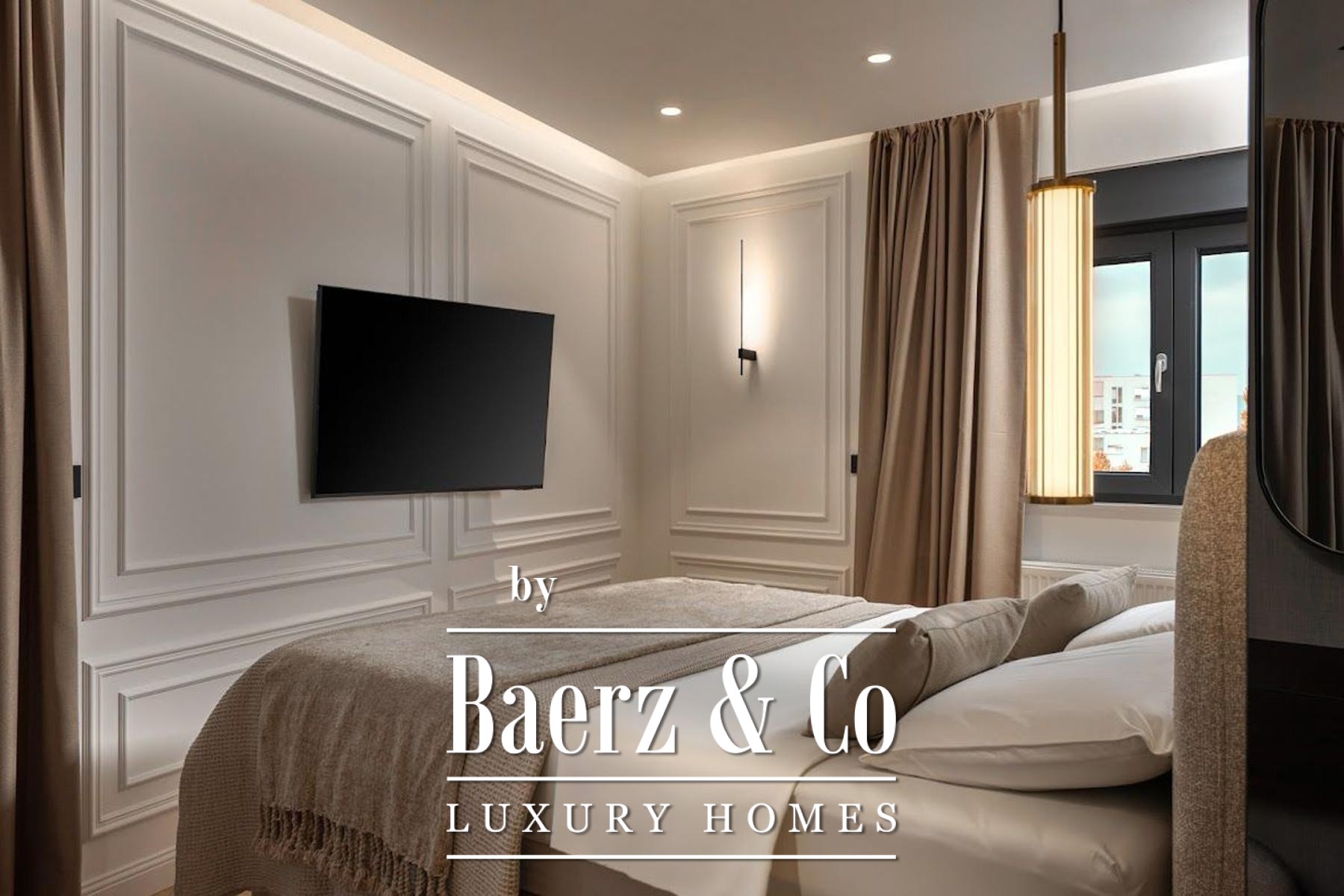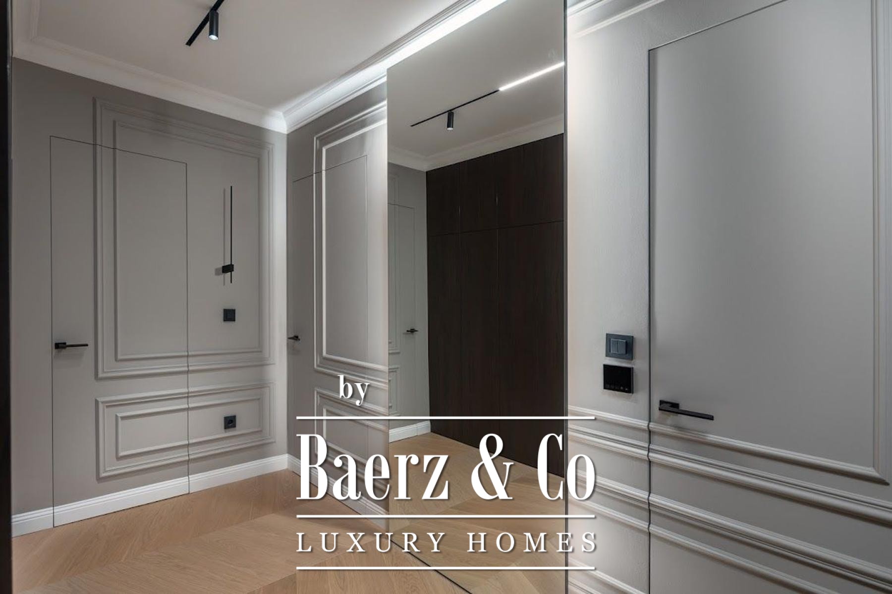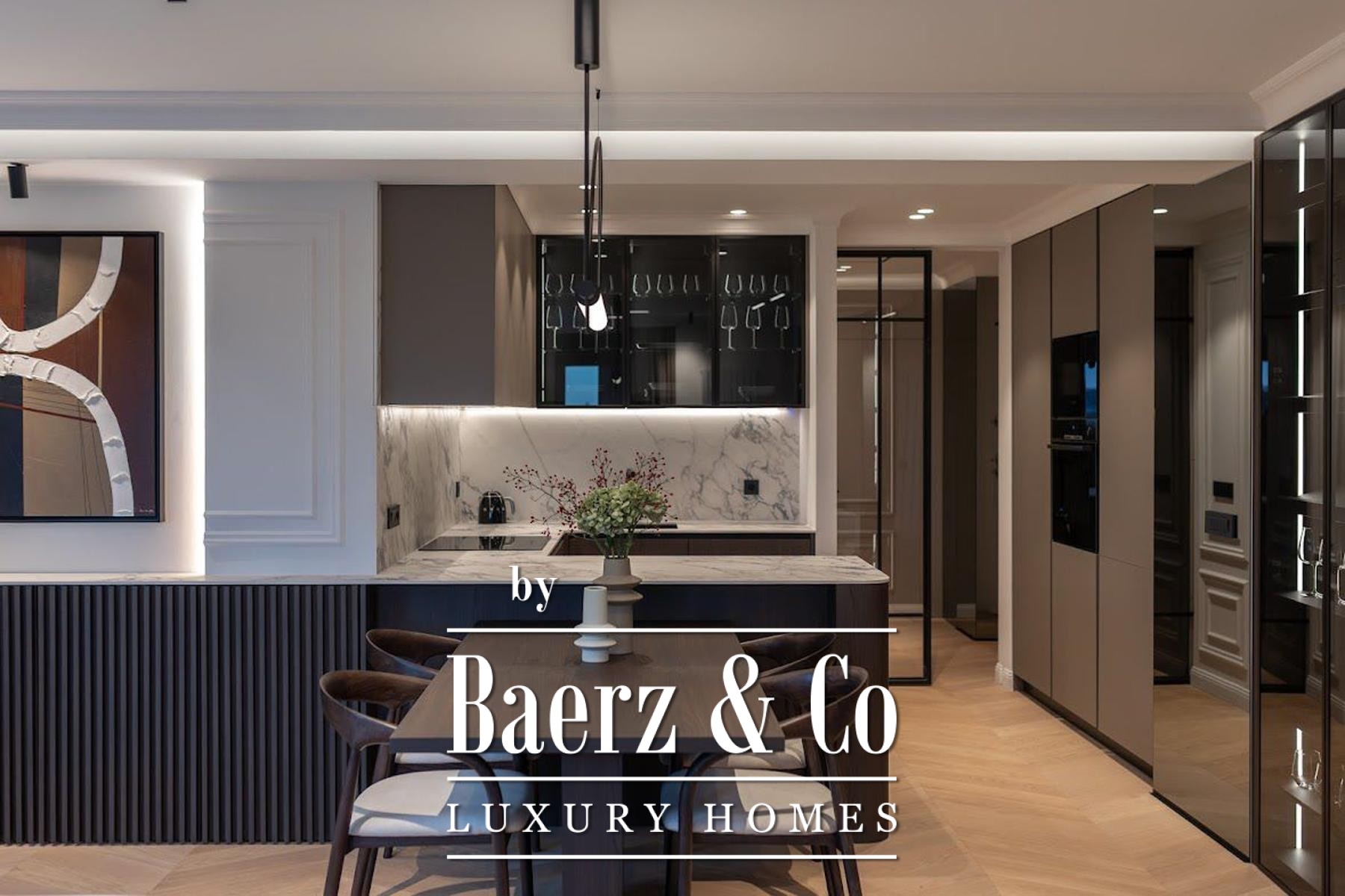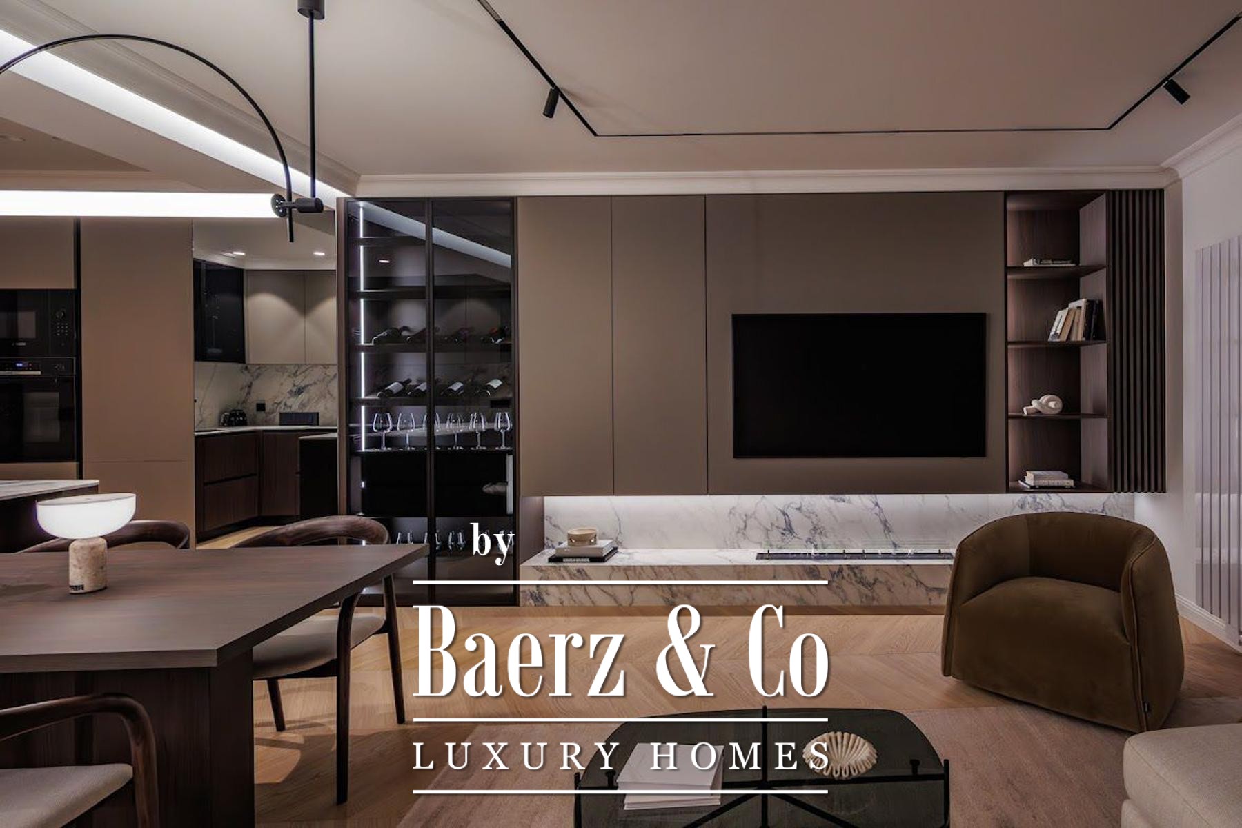 From the direct elevator entry connecting the underground garage to the private entrance, the penthouse signals rare intimacy and discretion. The residence features five bedrooms and five bathrooms, each with custom sanitary installations and underfloor heating. The living spaces are enveloped in light, with elegant Chevron Boen parquet, aluminum joinery, triple-glazed windows, and integrated LED illumination imparting a refined, welcoming ambiance.