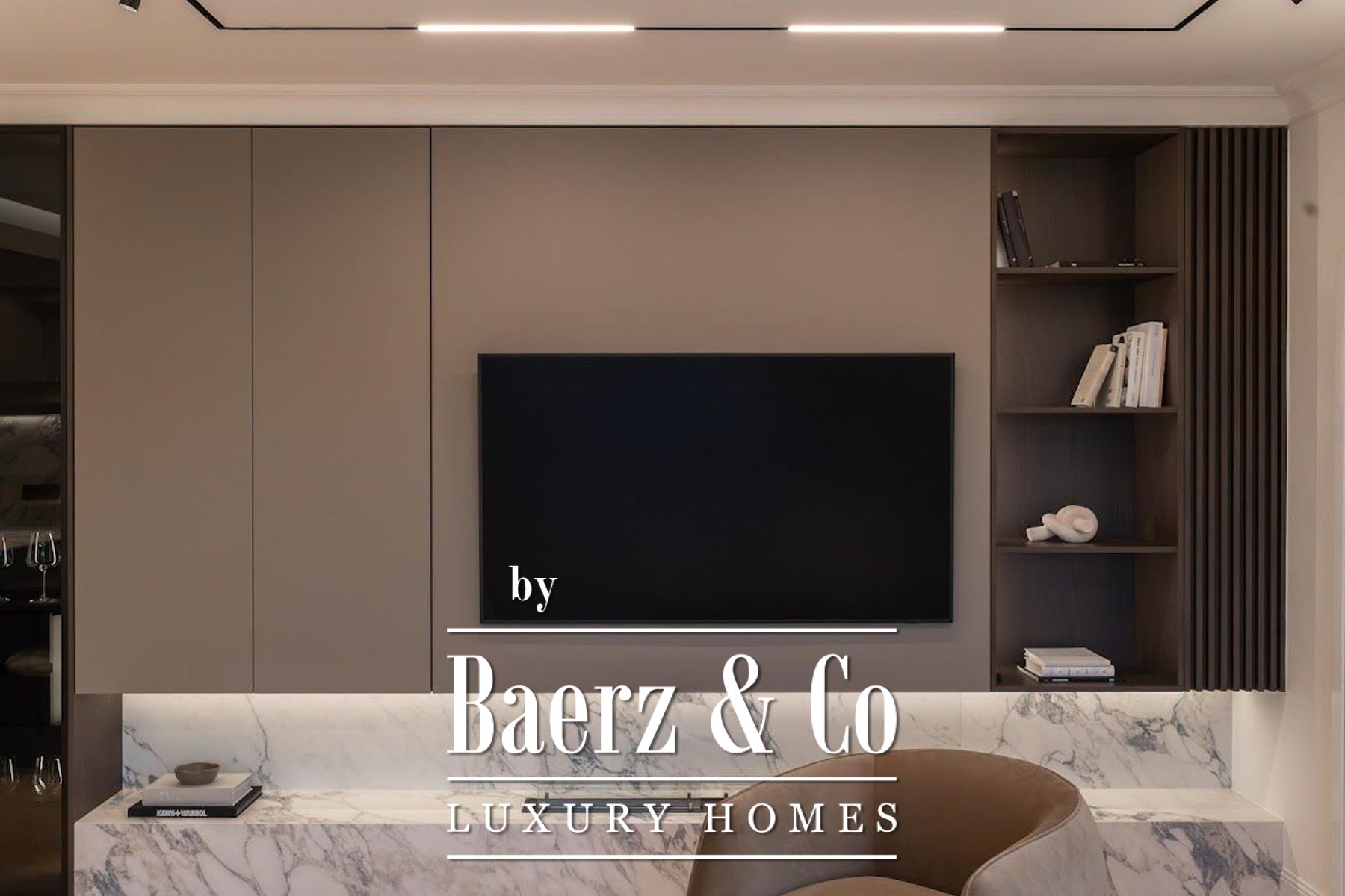 A modern bioethanol fireplace anchors the living area, while the master suite offers a generous walk-in closet, touch lighting, and carefully selected furnishings. Every room opens onto the surrounding terraces, blending natural airflow and outdoor access. Further distinctions include a storage room of 13.10 m², a designer kitchen with premium appliances, a 65" Samsung Frame TV, a wine cabinet, and curated art installations.