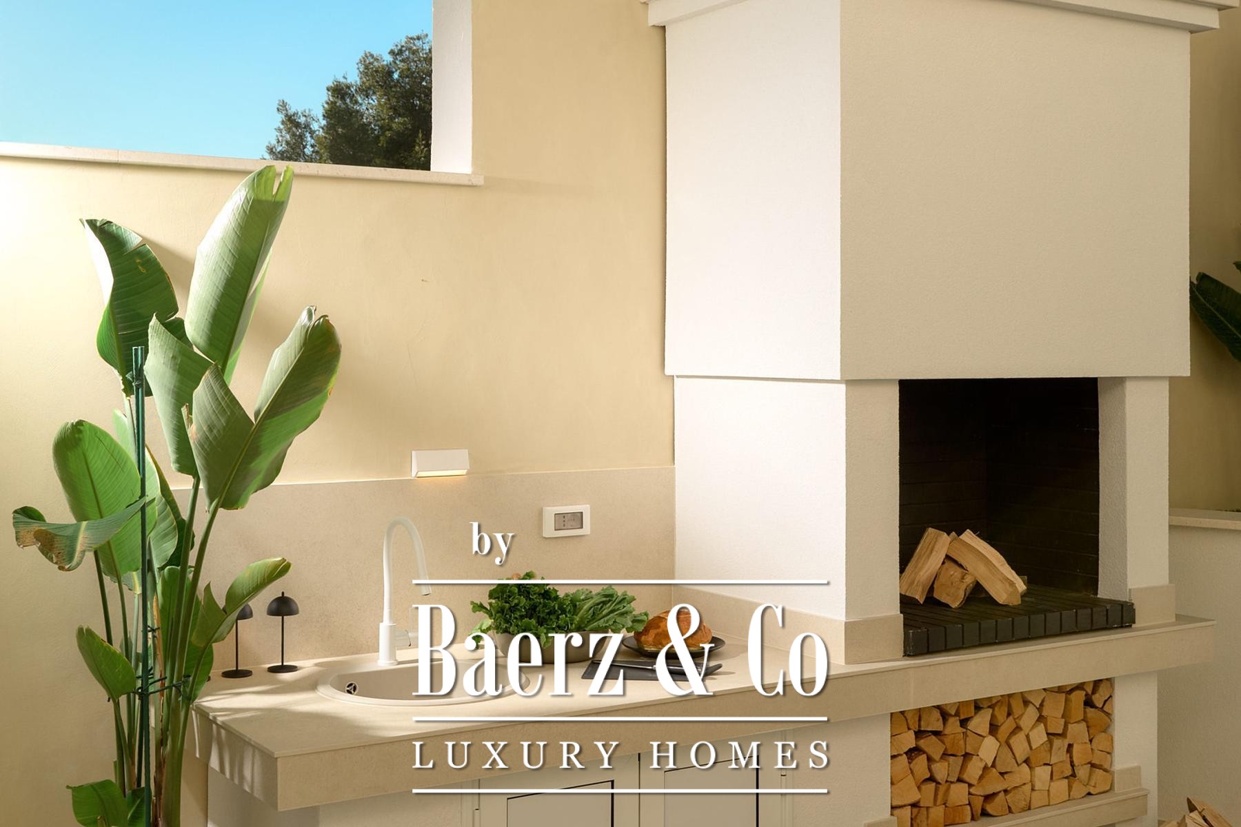 Construction standards are uncompromising, with ceiling air conditioning, underfloor heating powered by heat pumps, air recovery, thermal insulation, aluminum joinery, glass terrace railings, solar panel installations, automatic garden irrigation, and video surveillance providing technical excellence. Two uncovered parking spaces and Mediterranean-inspired landscaping further enhance the setting.