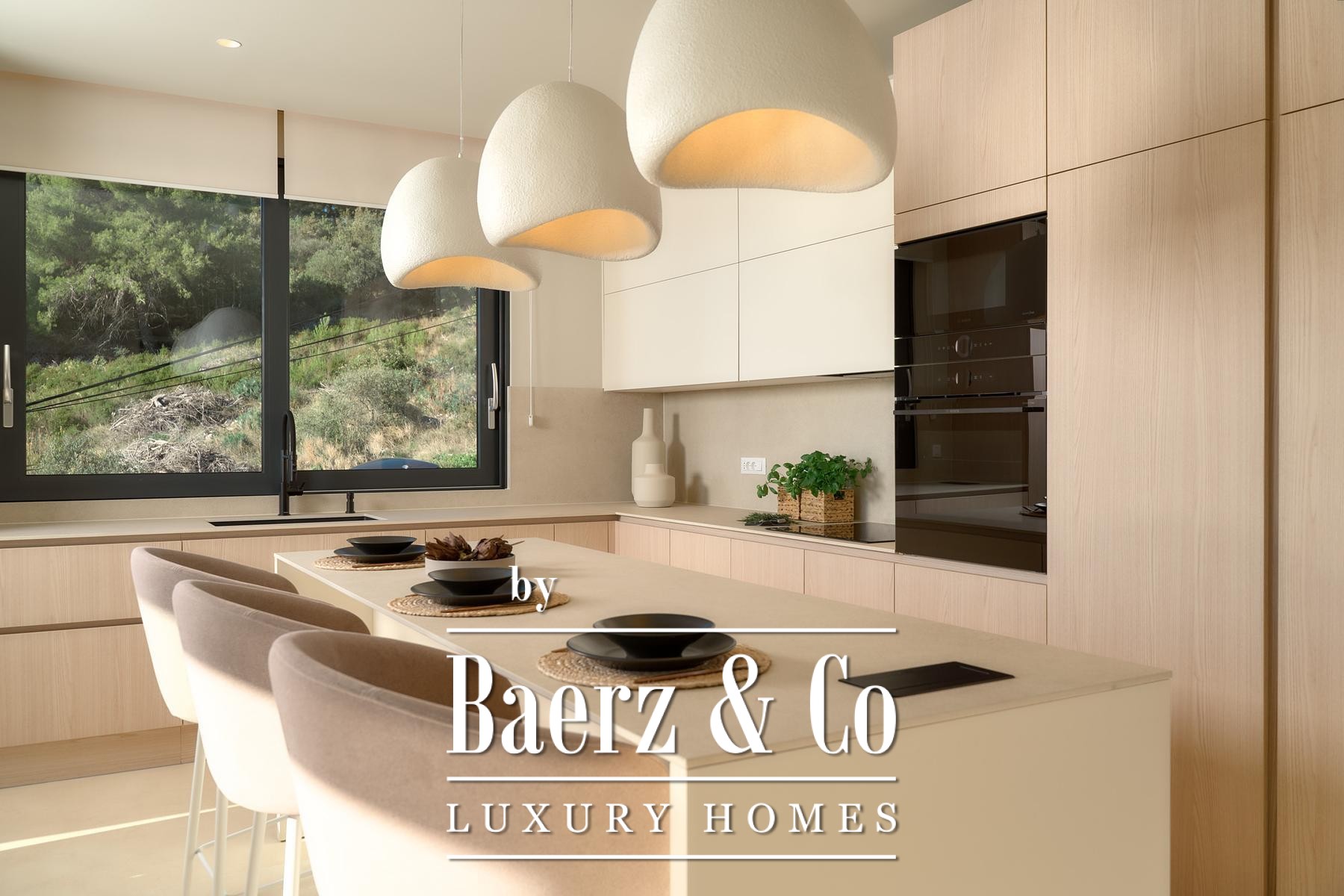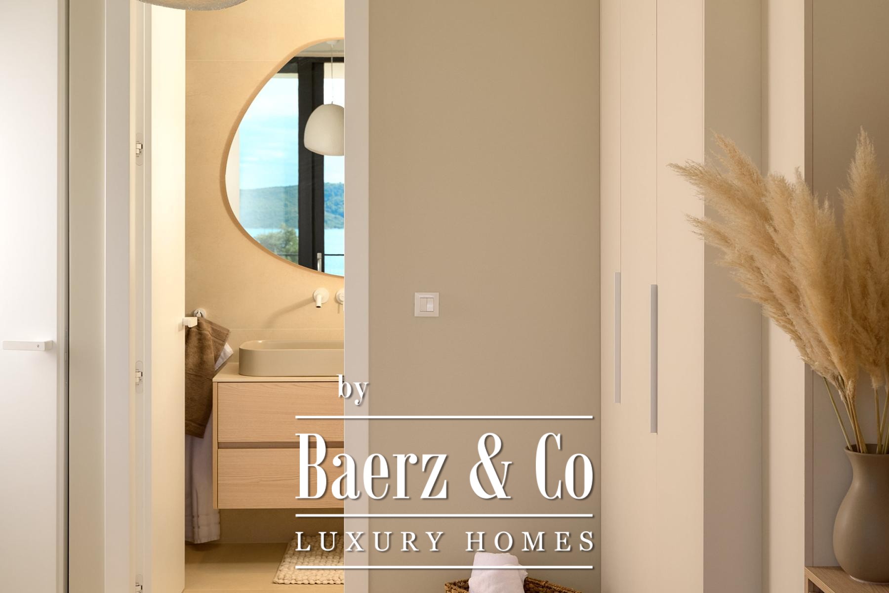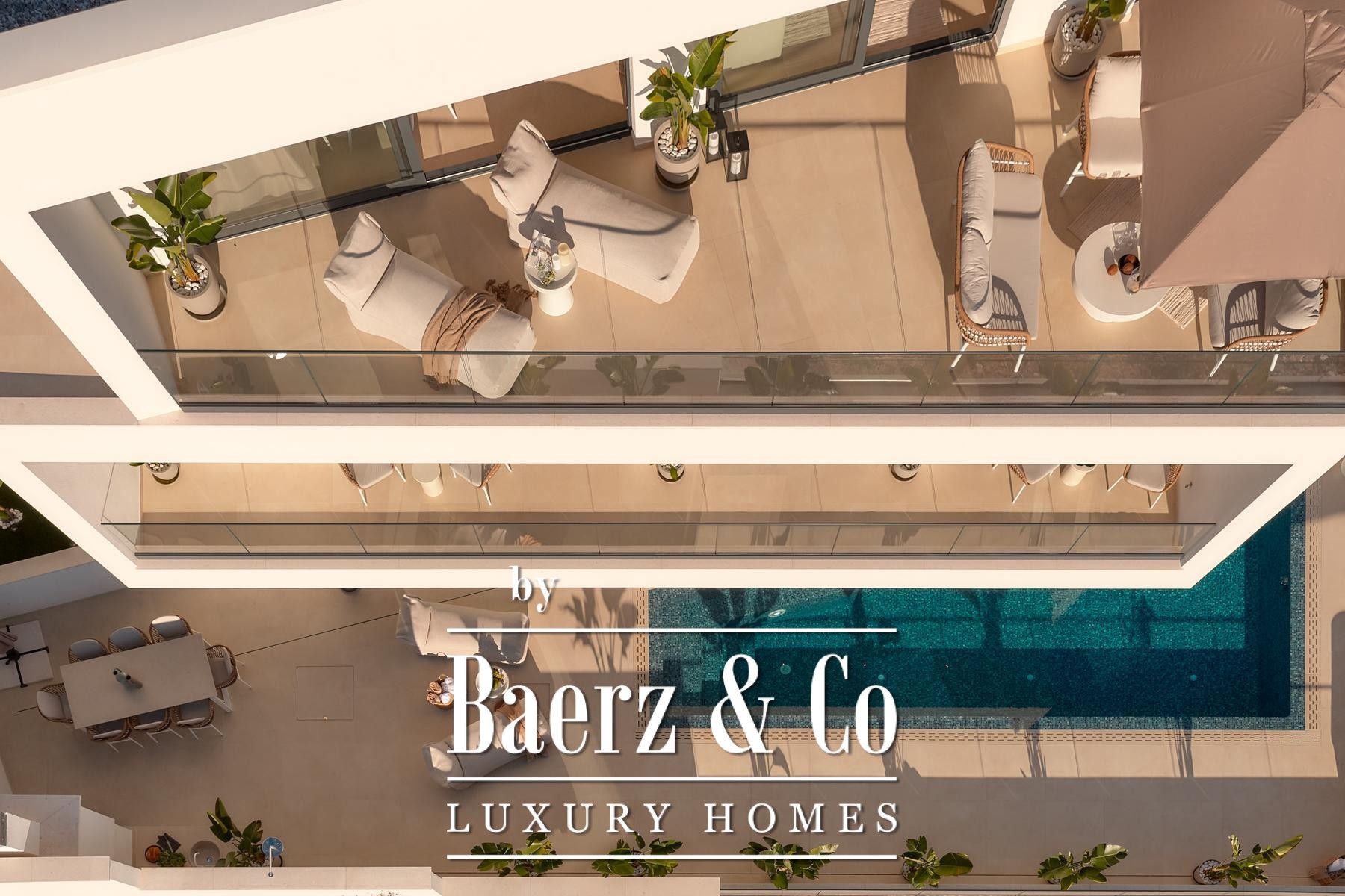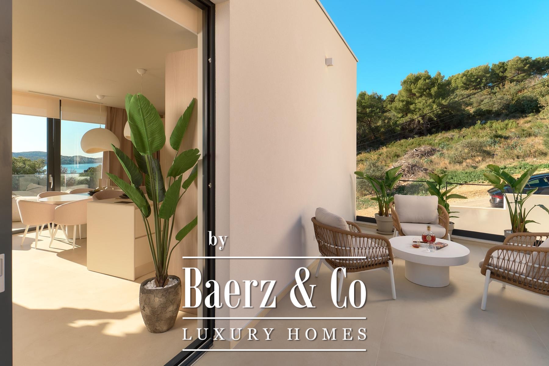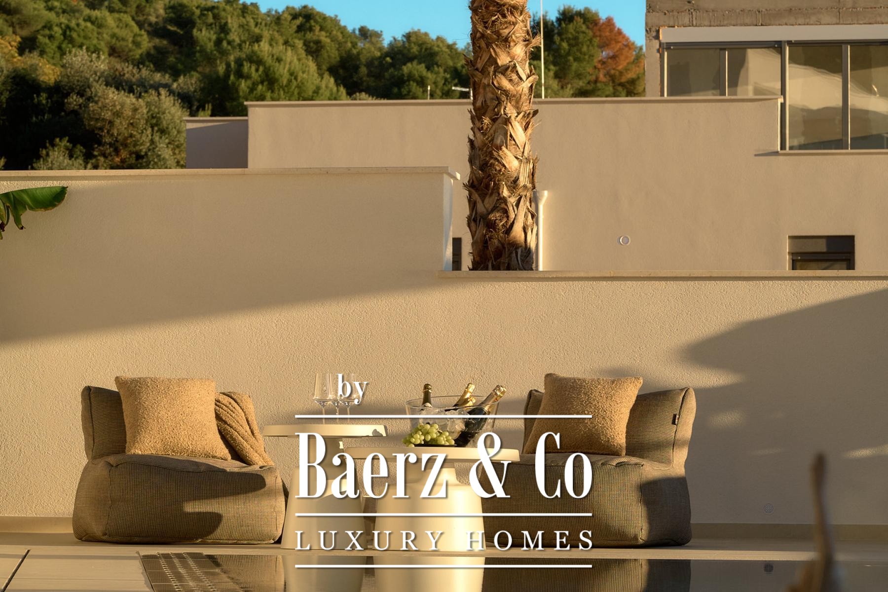 Three bedrooms with en suite bathrooms on the ground floor enjoy direct access to an 18.8 m² loggia. A private garage of 31 m², features electric vehicle charging. The first floor introduces a voluminous 52 m² living area, complemented by a fourth bedroom, additional bath, and expanses of terrace, each vantage point oriented toward the shimmering horizon.