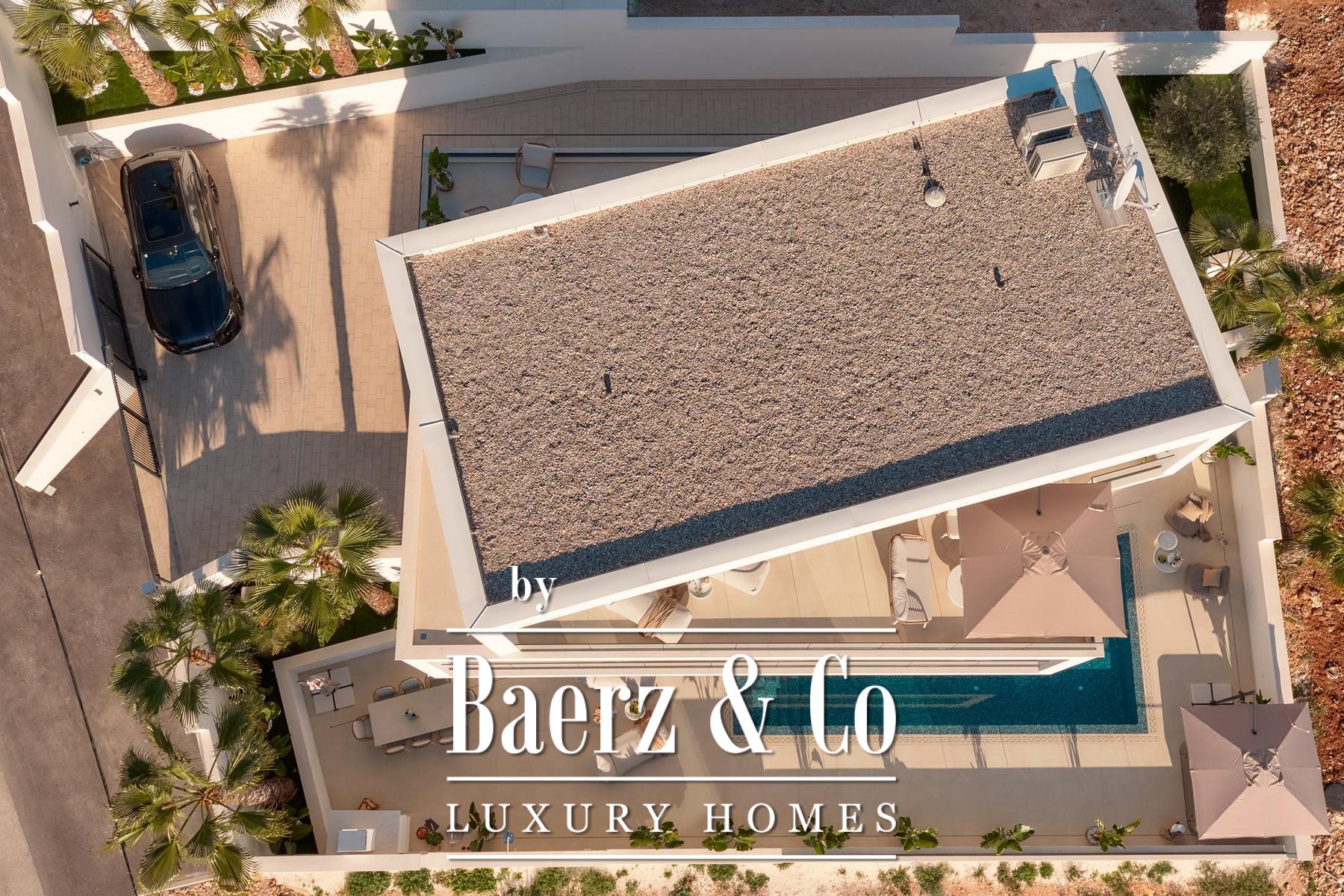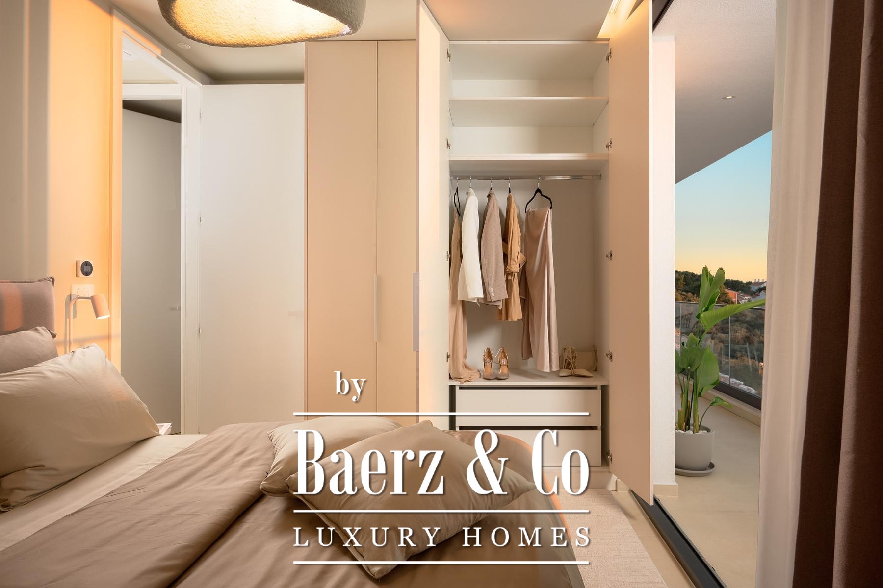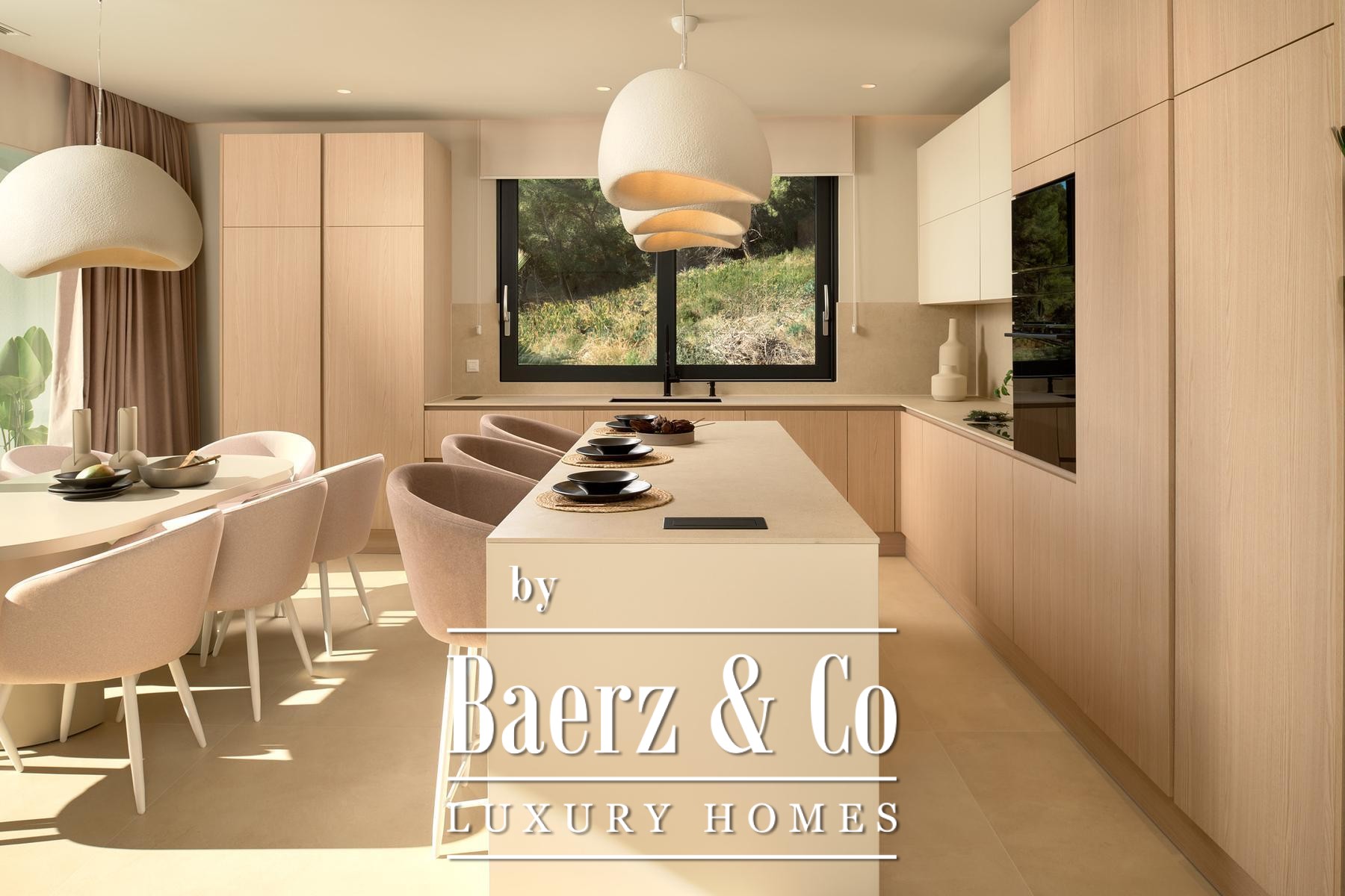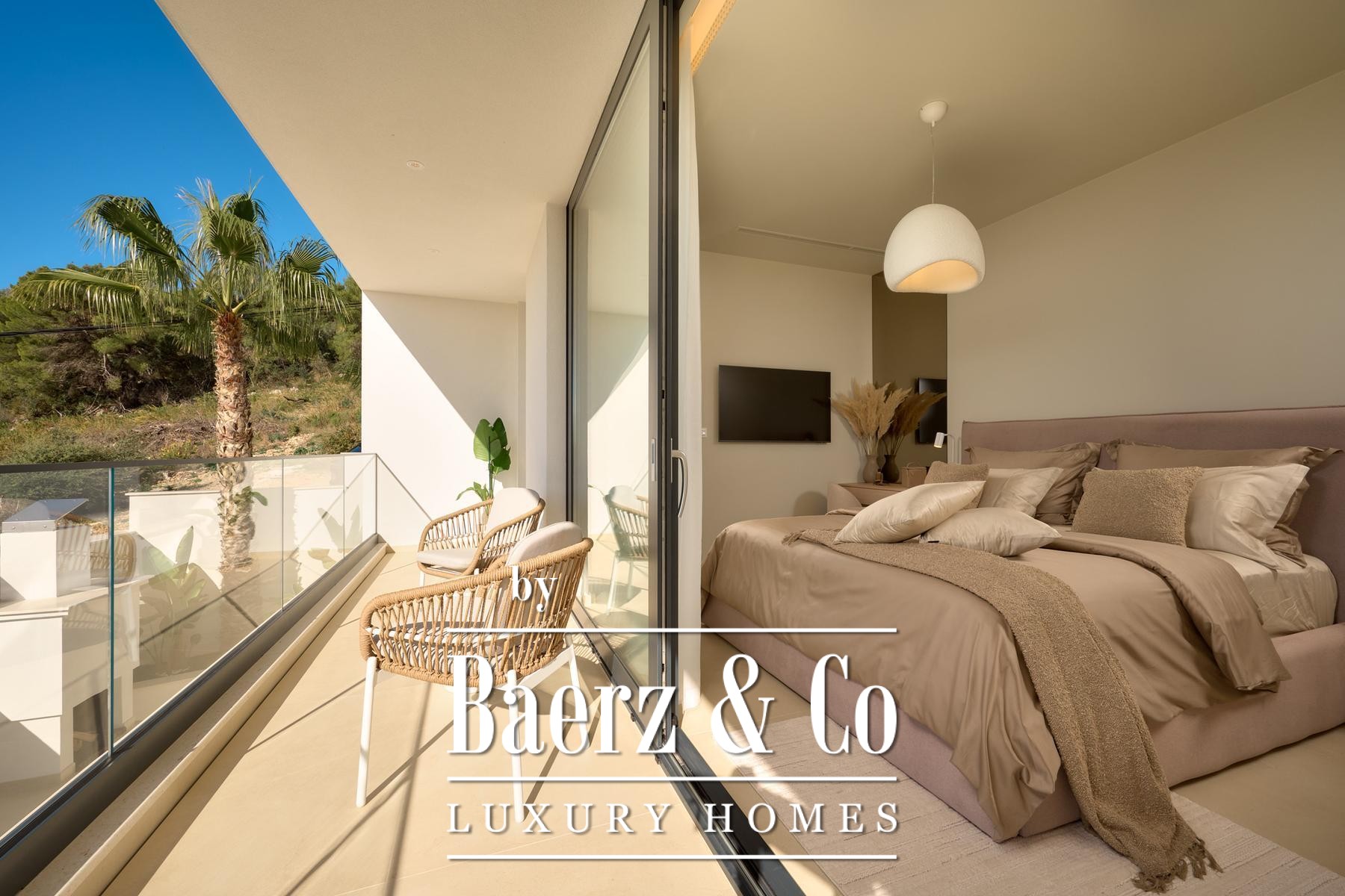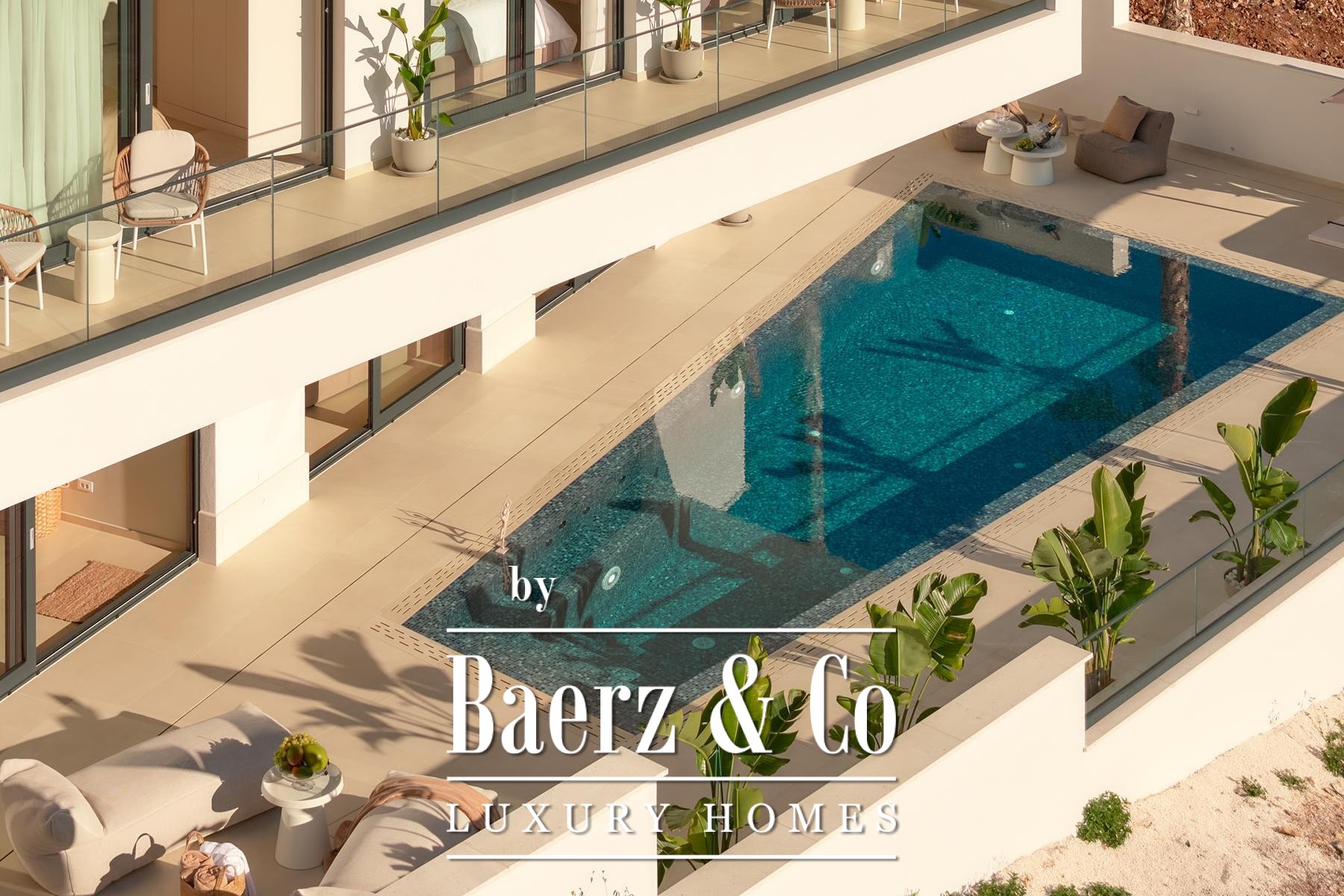 Three bedrooms with en suite bathrooms on the ground floor enjoy direct access to an 18.8 m² loggia. A private garage of 31 m², features electric vehicle charging. The first floor introduces a voluminous 52 m² living area, complemented by a fourth bedroom, additional bath, and expanses of terrace, each vantage point oriented toward the shimmering horizon.