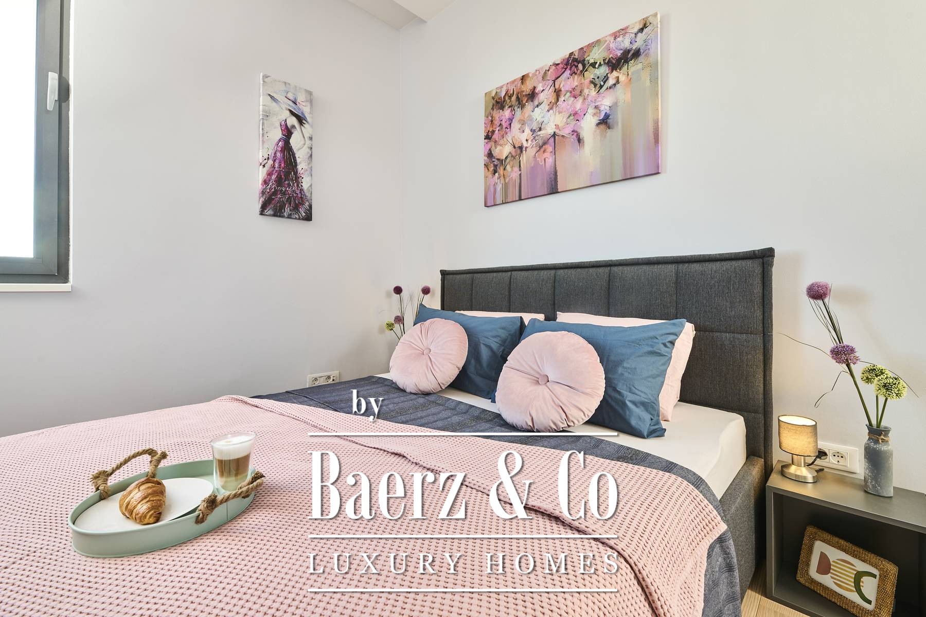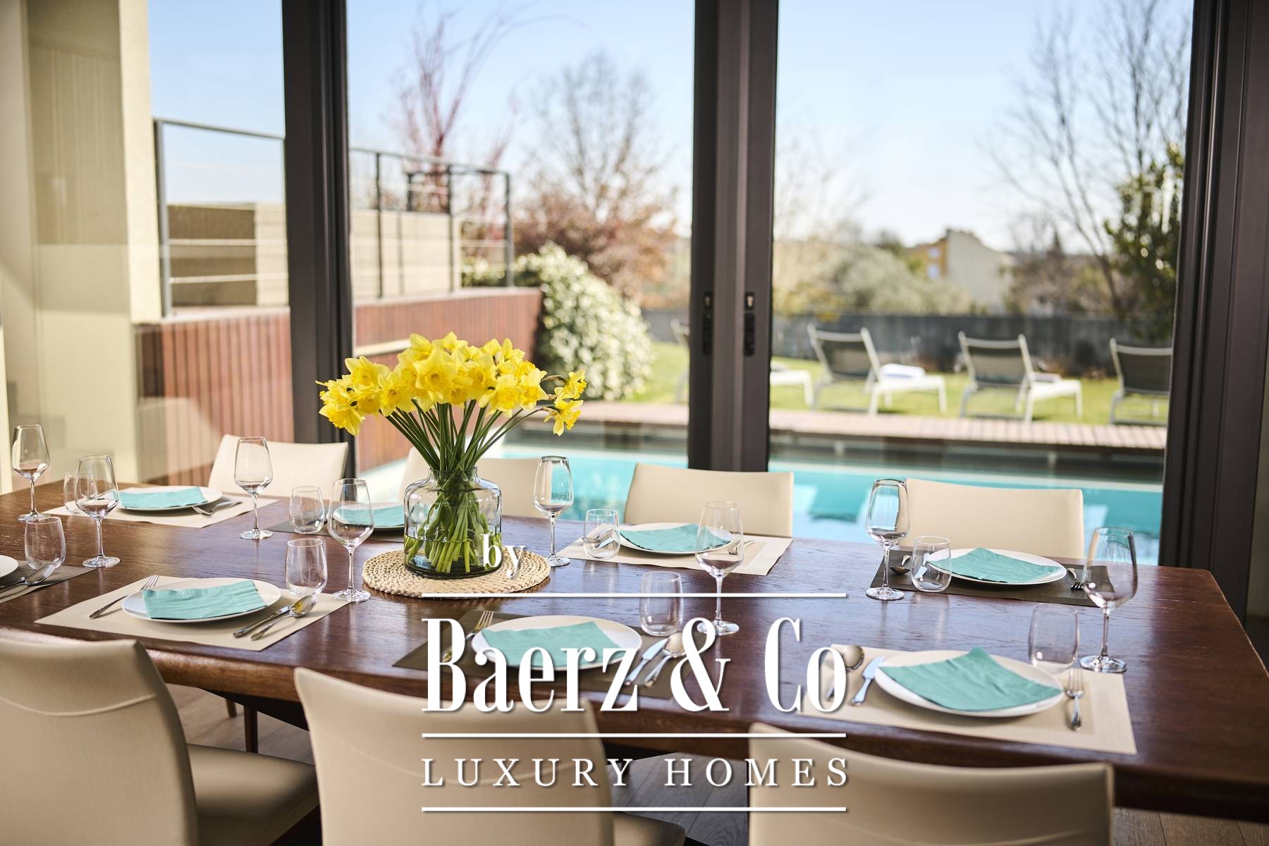 that is visible from the living room leads to the upper floor. It contains three bedrooms with bathrooms, a dressing room on the west side of the house and a common entrance hall. The roof of the living room is partly a passable fenced terrace, and partly a green roof.The roof above the first floor is a flat terrace, and above the living room on the ground floor is a flat walk-through terrace combined with a green roof.All windows and exterior doors are aluminum, glazed with IZO glass 4 + 12 + 4 mm.The number of storeys of the building is / P0 + Pr + 1K /, ie the basement, ground floor and first floor with a flat roof, partially passable.The building is fully finished and suitable for use or housing.It is located on a hill surrounded by olive groves. It has an arboretum in its environment on which 70 species of plants have been planted, of which very old olives stand out.In the spacious yard there are parking spaces for 5-6 cars and a garage for 4-5 cars.In this modern construction, attention is paid to quality so that internet cables are routed throughout the house. Modern technology is controlled via mobile phones, so it is a so-called "smart house".Special attention deserves a heated pool 5x9 m2 = 45 m2 which has a shutter that closes.This villa will satisfy the client who is looking for top quality.