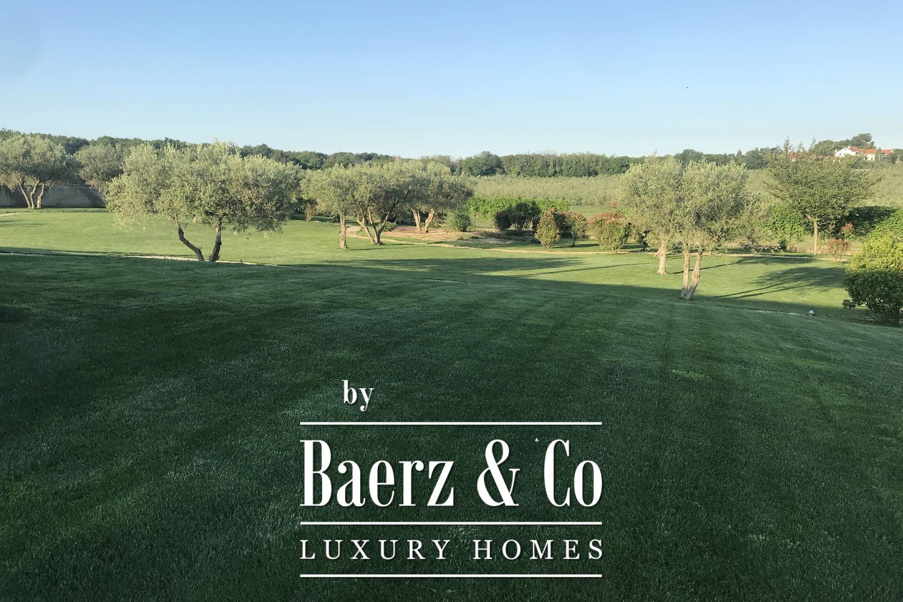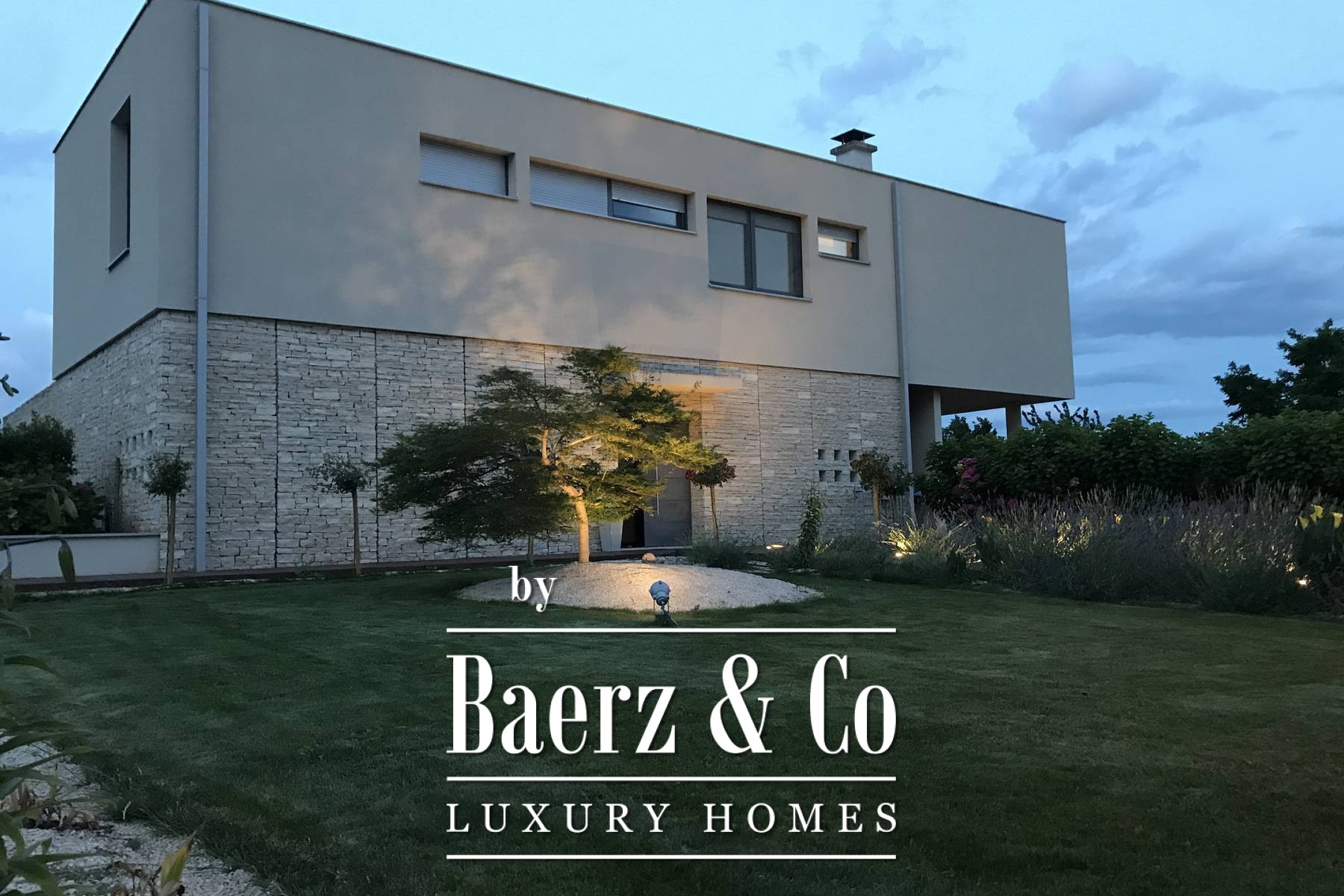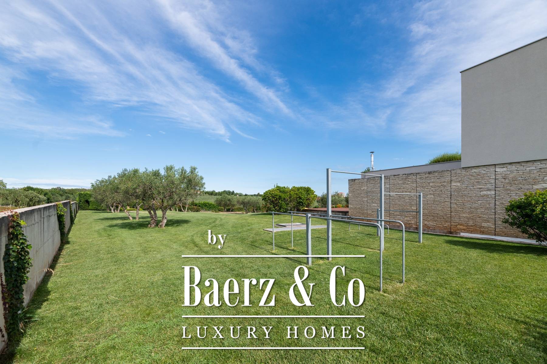 Modern smart house with 4.956 m2 land surrounded by olive groves just 400 meters from the favorite beaches of Umag. The architecture merges elegant design and stone as a traditional building element into an attractive villa with pool that provides the highest standards of modern living.The main entrance and driveway to the building are located on its west side, on the existing street, and the space for a garage with storage and a multimedia hall in the basement of the building.The ground floor consists of an entrance hall on the west side, a guest room with bathroom on the north side of the building and a unique living room, kitchen and dining room which is connected to the south facing terrace facing the sea, and north to the garden and outdoor terrace.In the entrance area, which is accessed west through the windshield, there is a garden on the north side of the house. The guest room is connected to the entrance area via an entrance hall from which one enters the bathroom. In the western part of the building, in addition to the mentioned windshield, there is a toilet to the north, and to the south there is an economic space related to the kitchen. On the west side of the south terrace, connected to the kitchen and the economic part, there is a summer kitchen covered with the volume of the upper floor.A staircase