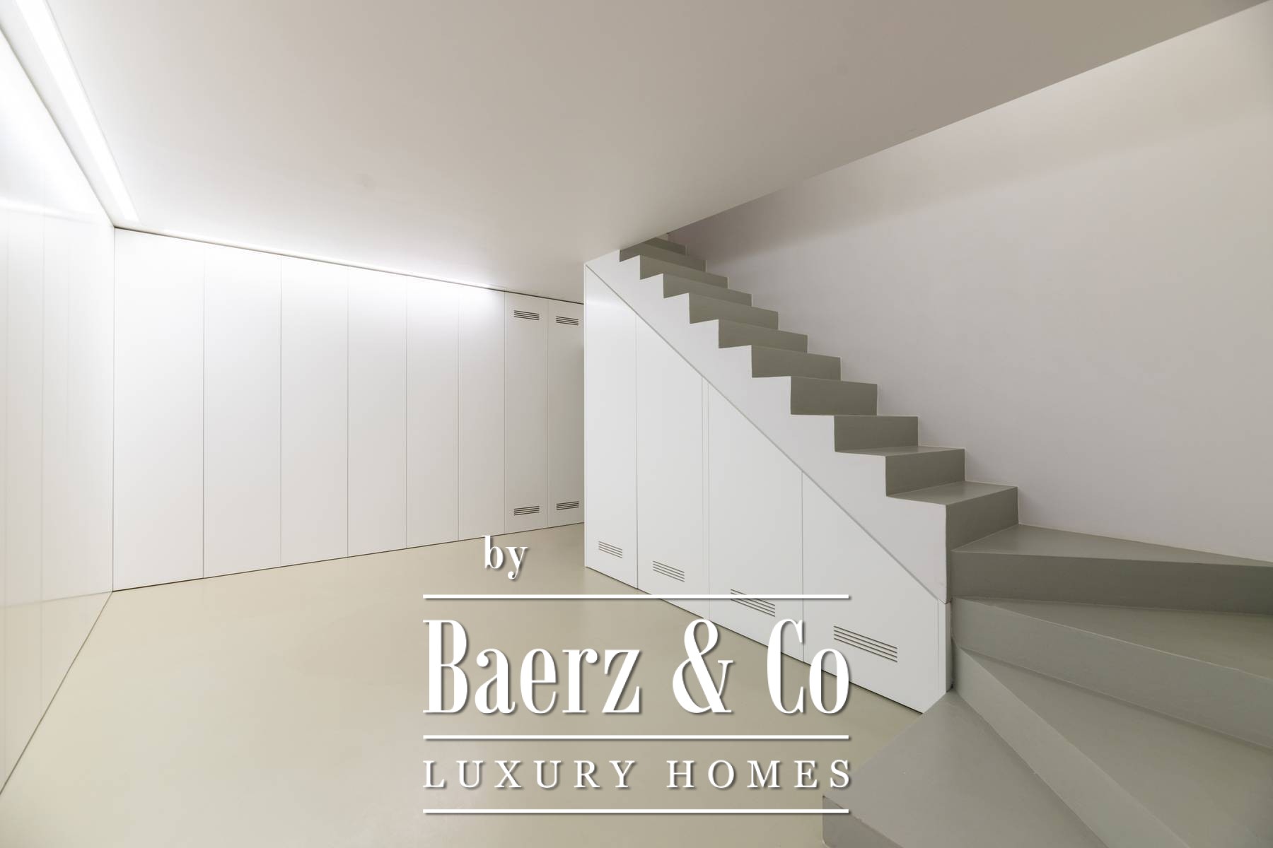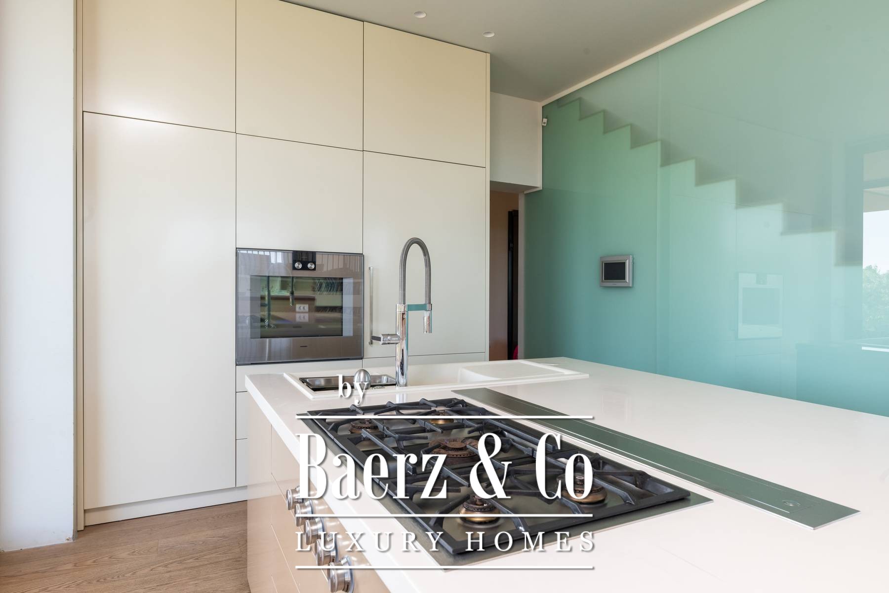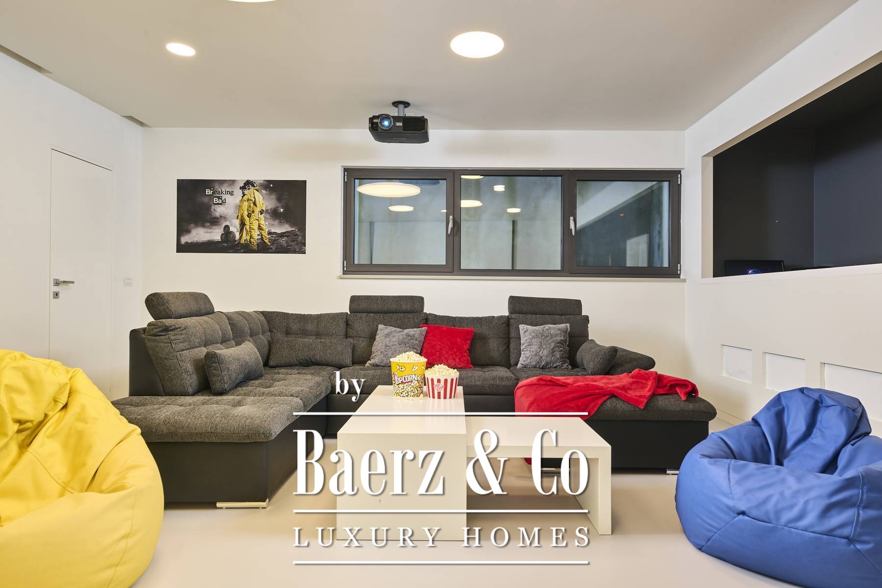 Modern smart house with 4.956 m2 land surrounded by olive groves just 400 meters from the favorite beaches of Umag. The architecture merges elegant design and stone as a traditional building element into an attractive villa with pool that provides the highest standards of modern living.The main entrance and driveway to the building are located on its west side, on the existing street, and the space for a garage with storage and a multimedia hall in the basement of the building.The ground floor consists of an entrance hall on the west side, a guest room with bathroom on the north side of the building and a unique living room, kitchen and dining room which is connected to the south facing terrace facing the sea, and north to the garden and outdoor terrace.In the entrance area, which is accessed west through the windshield, there is a garden on the north side of the house. The guest room is connected to the entrance area via an entrance hall from which one enters the bathroom. In the western part of the building, in addition to the mentioned windshield, there is a toilet to the north, and to the south there is an economic space related to the kitchen. On the west side of the south terrace, connected to the kitchen and the economic part, there is a summer kitchen covered with the volume of the upper floor.A staircase