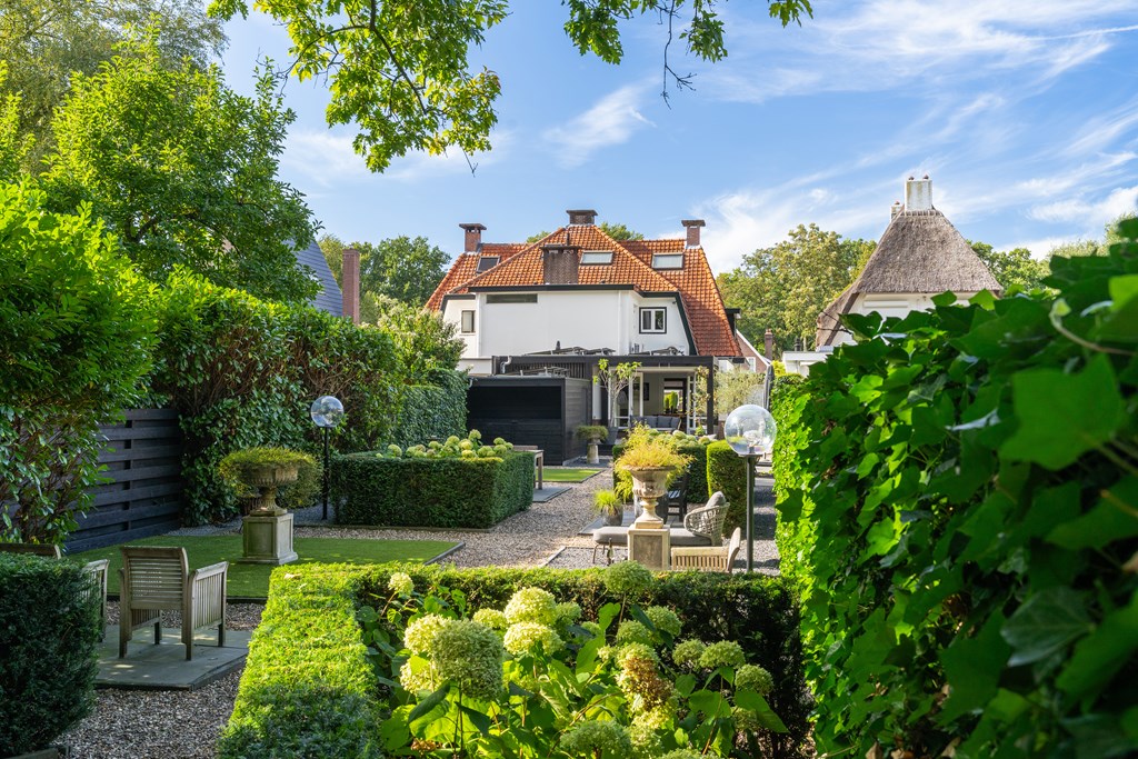 The back garden is beautifully maintained and generously sized—ideal for families and outdoor enthusiasts. With a depth of approximately 45 meters, it offers plenty of space to enjoy multiple seating areas, both in the sun and in the shade. The layout is elegant and functional, with artificial grass and colorful flowerbeds providing a low-maintenance yet charming atmosphere.