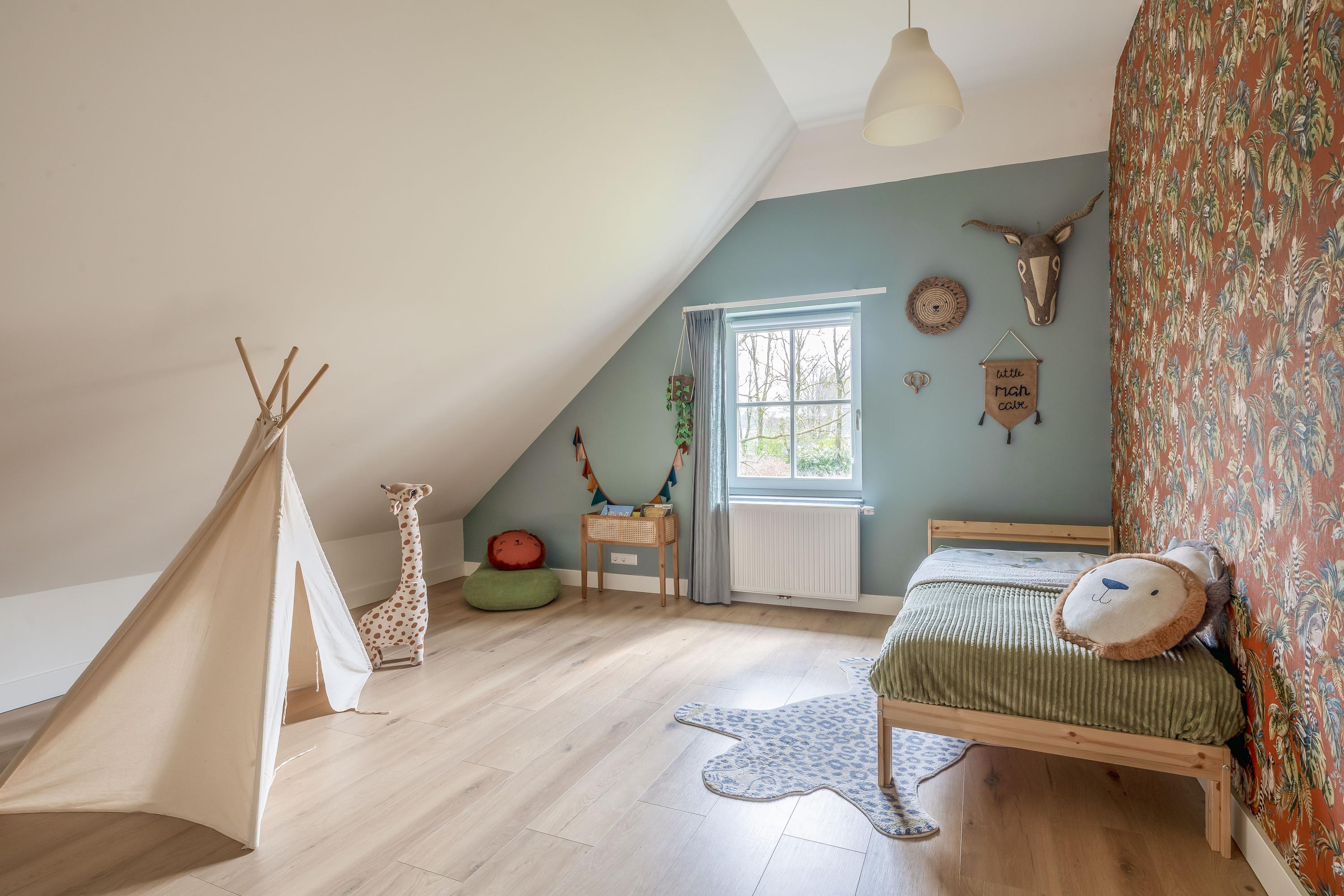 With a living area of 226 m², the property offers a comfortable and move-in ready living space. The living areas are spacious and light, flowing logically into one another. The layout is well thought-out, featuring, among other things, a kitchen-diner and a bedroom on the ground floor. Upstairs, there are three spacious bedrooms and a modern bathroom, where exposed timber structures contribute to the atmosphere and authentic character of the whole.