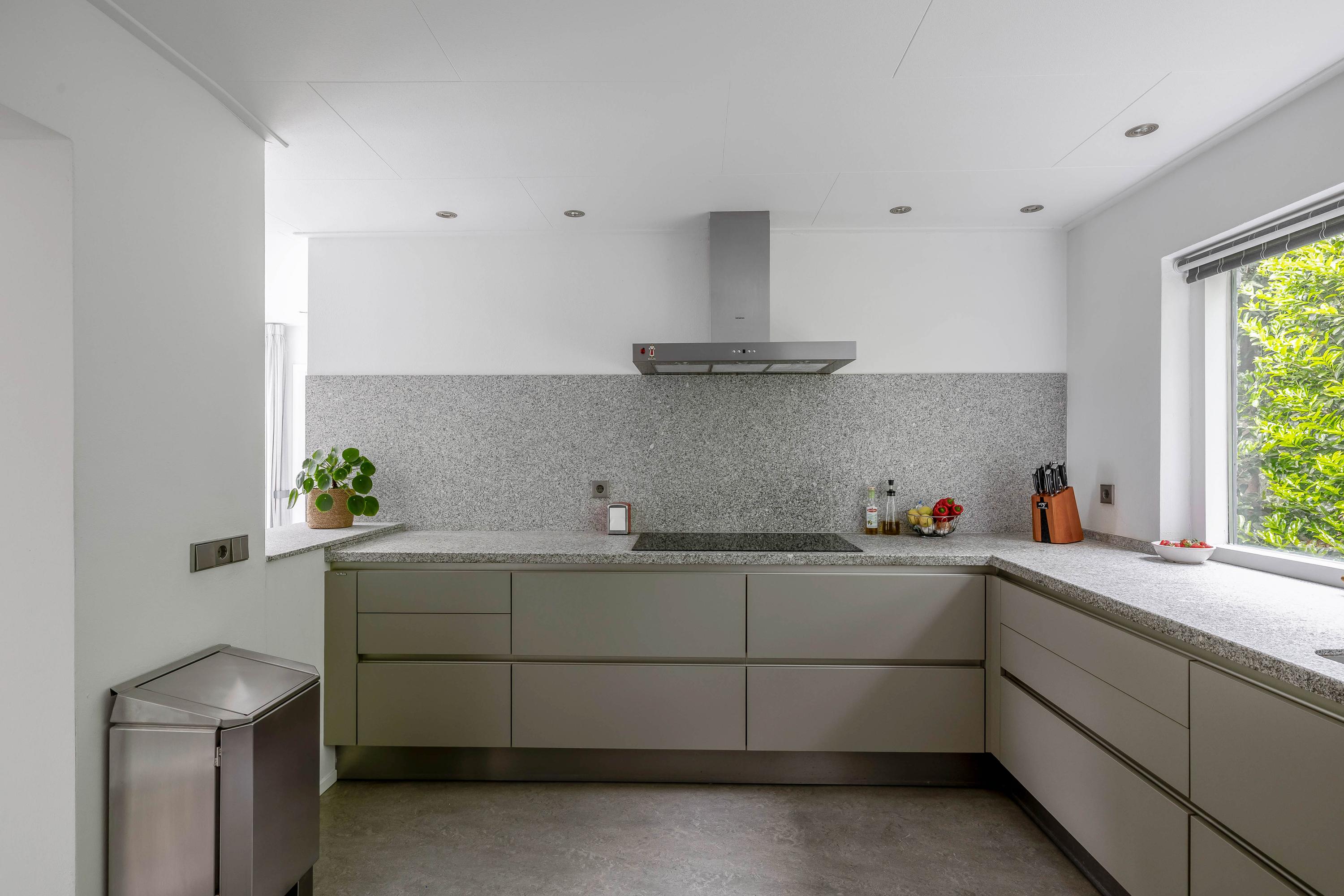 The open passageway from the entrance hall leads you to the bright and spacious living room. This is finished with sleek stucco on the walls and the large windows to floor level offer a view of the patio garden. The floors are equipped with underfloor heating and cooling, ensuring a pleasant climate in every season. An eye-catcher in the living room is the open staircase made of maple wood and steel leading to the upper floor.