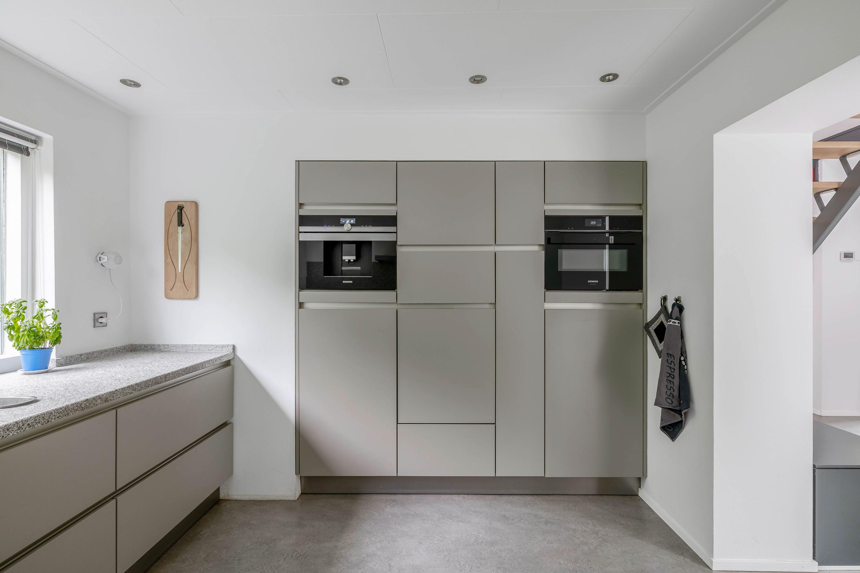 The semi-open, handle-free Siematic kitchen is a dream for any home cook. The kitchen is equipped with a burnt granite countertop, sink with a Fusion Quooker tap, extractor hood, a 5-burner induction hob (11kW), and a wall unit with Home Connect combi-oven, two refrigerators, a fully automatic coffee machine with many