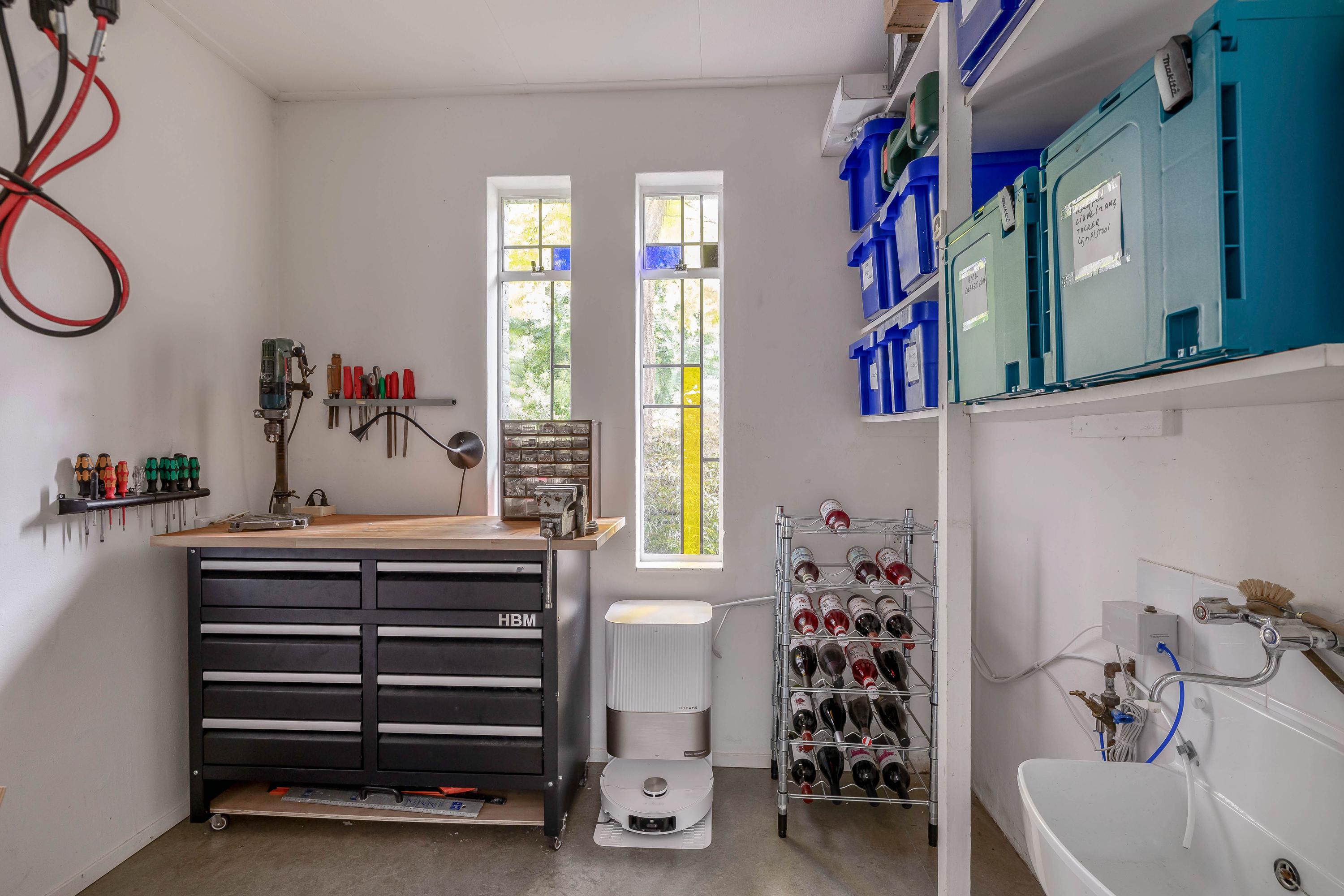The detached stone garage is a welcome addition; it is equipped with three-phase power and accessible via a separate door and an electric sectional door. The fiber optic connection is also located here. A unique feature is that the irrigation of both the front and back gardens is controlled by computer.