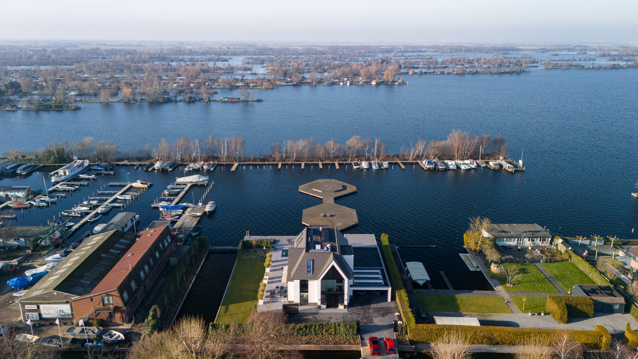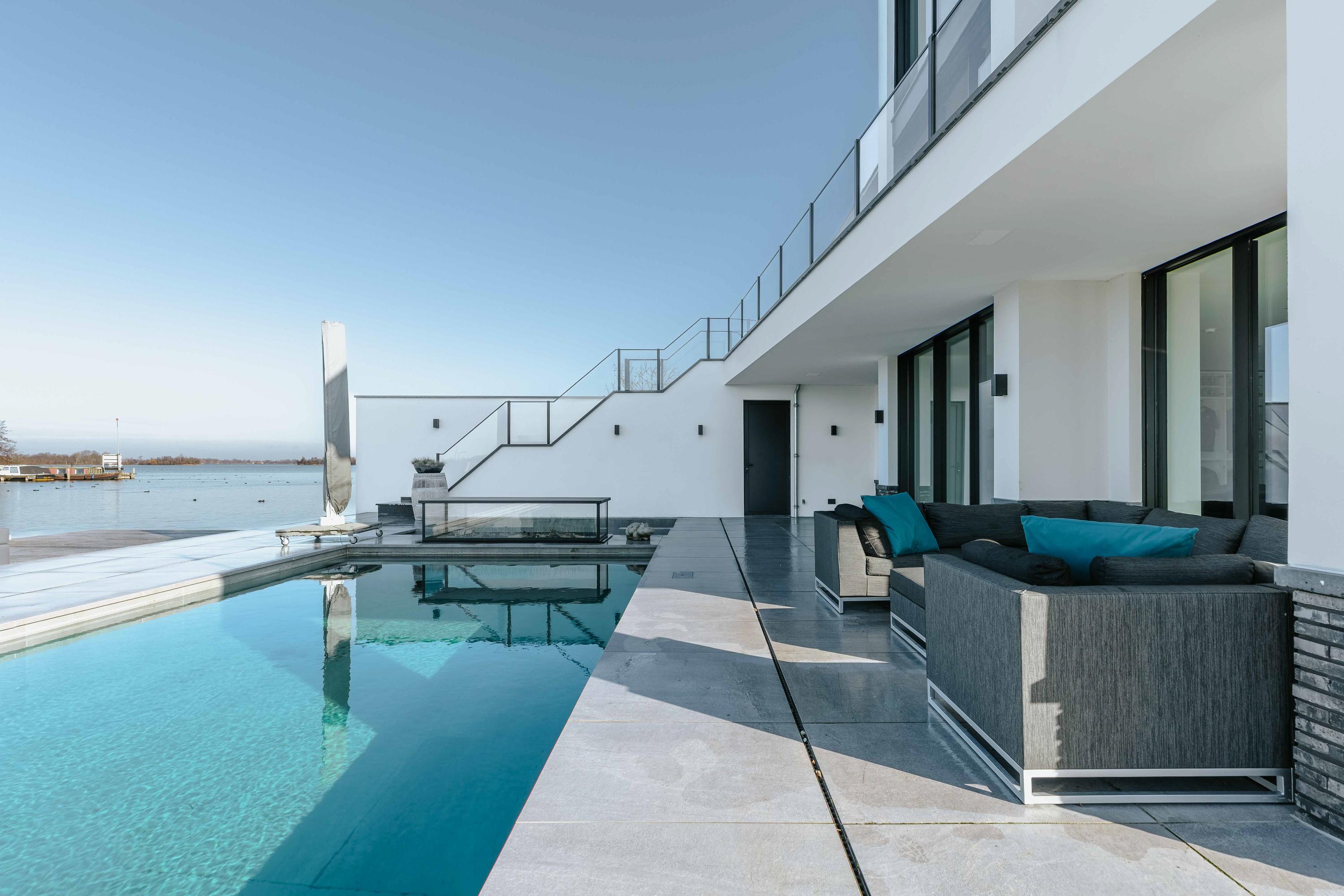 This recently built, modern villa, designed by Van Egmond Architects, is located directly on the Vinkeveense Plassen. With its own boathouse, swimming pool, jetty, and phenomenal unobstructed views across the water towards Amsterdam, this is a dream home offering a high level of living comfort.