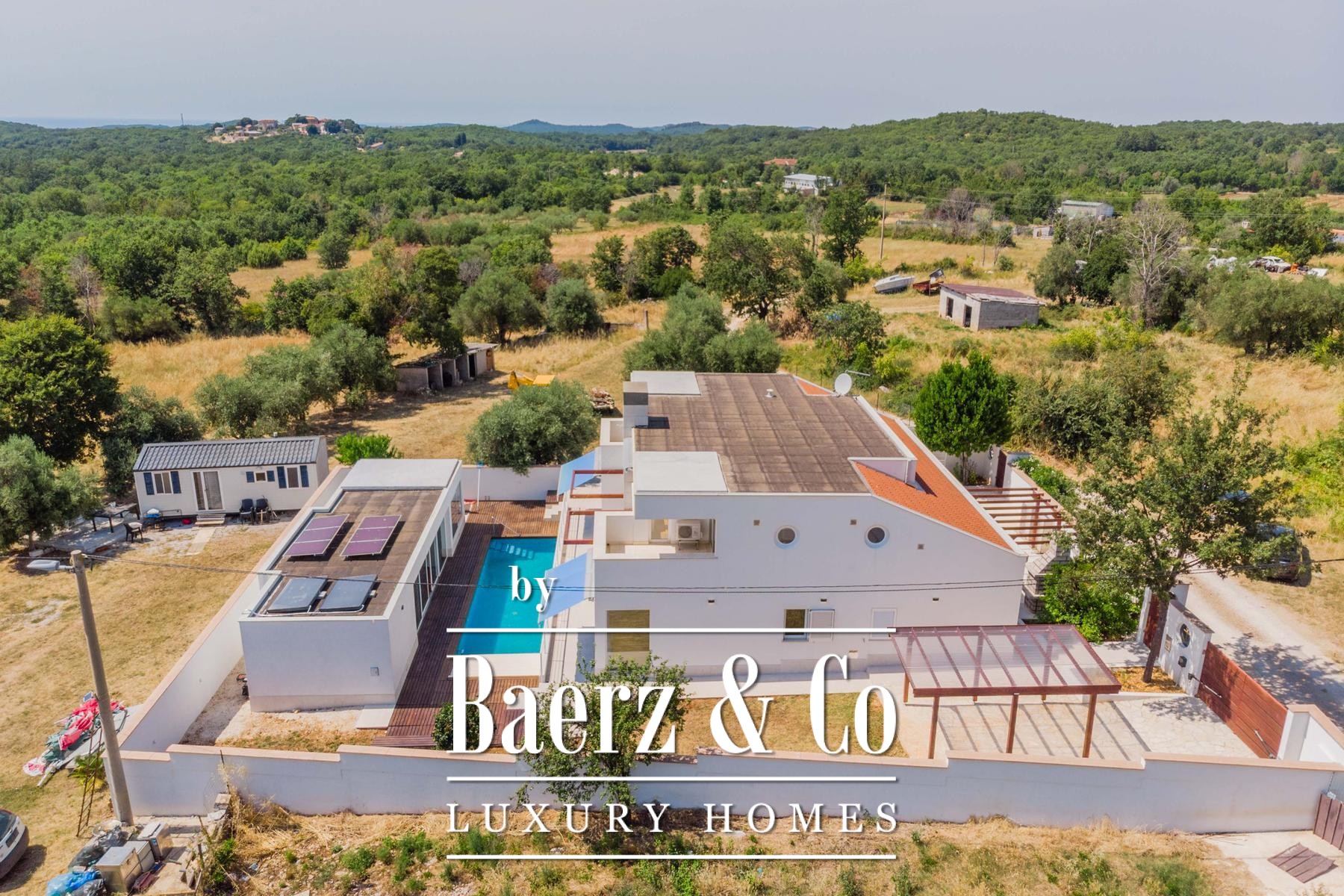 The landscaped, fenced garden of 777 m² is accessed via two automated entrance gates and features four parking spaces including one covered, a summer kitchen with fireplace, and ambient automated lighting, creating an inviting atmosphere for gatherings. Villa Vrsar’s focus on sustainability includes solar panels for pool heating and energy-efficient living.