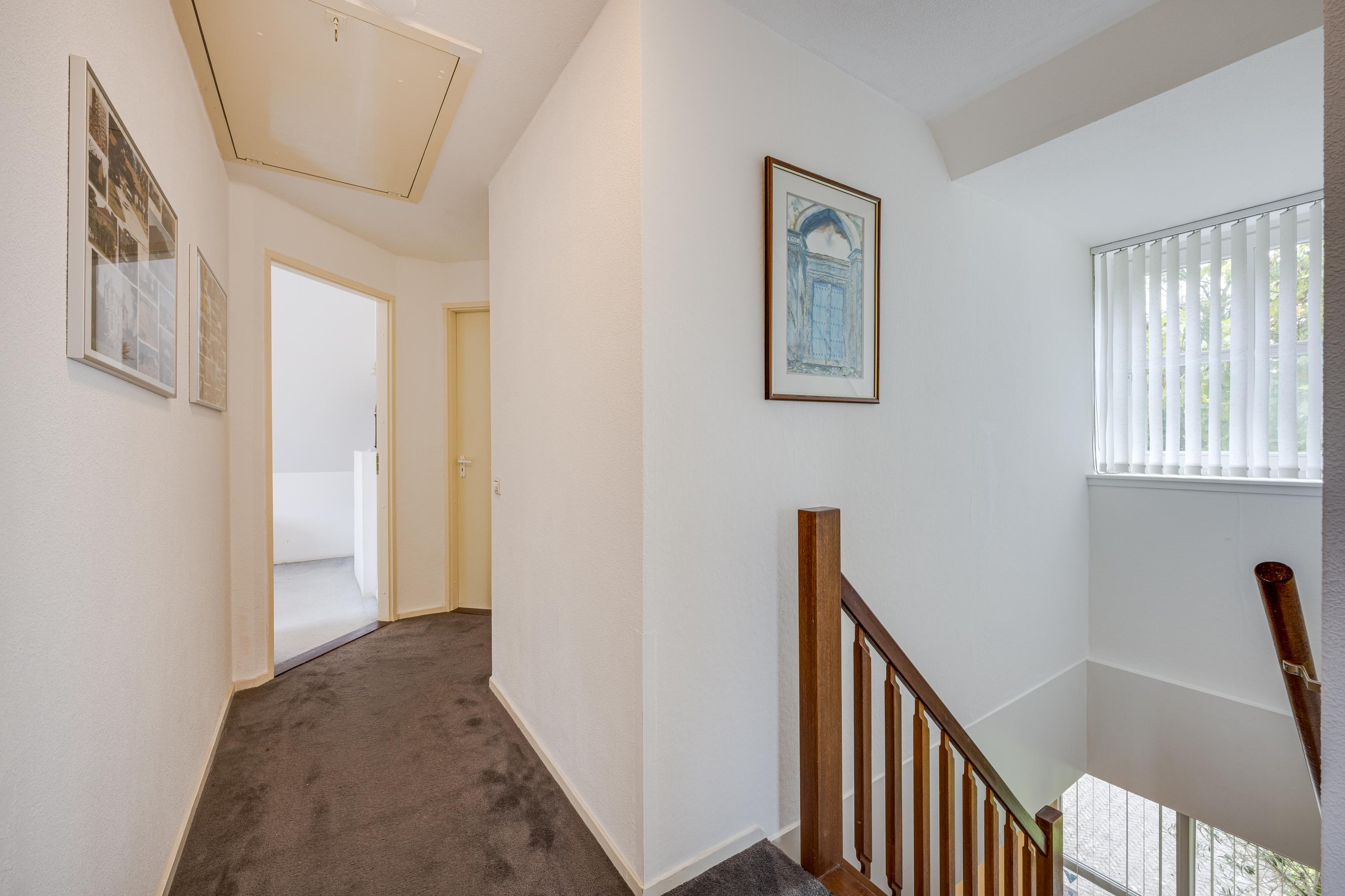 The kitchen, equipped with essential built-in appliances, adjoins a practical utility room, access to a cellar and an integrated garage of 5.4 by 3.1 meters. Upstairs, the principal suite is defined by a dormer window, balcony, and en-suite bath, accompanied by three further bedrooms, each with expansive natural light, and a second bathroom.