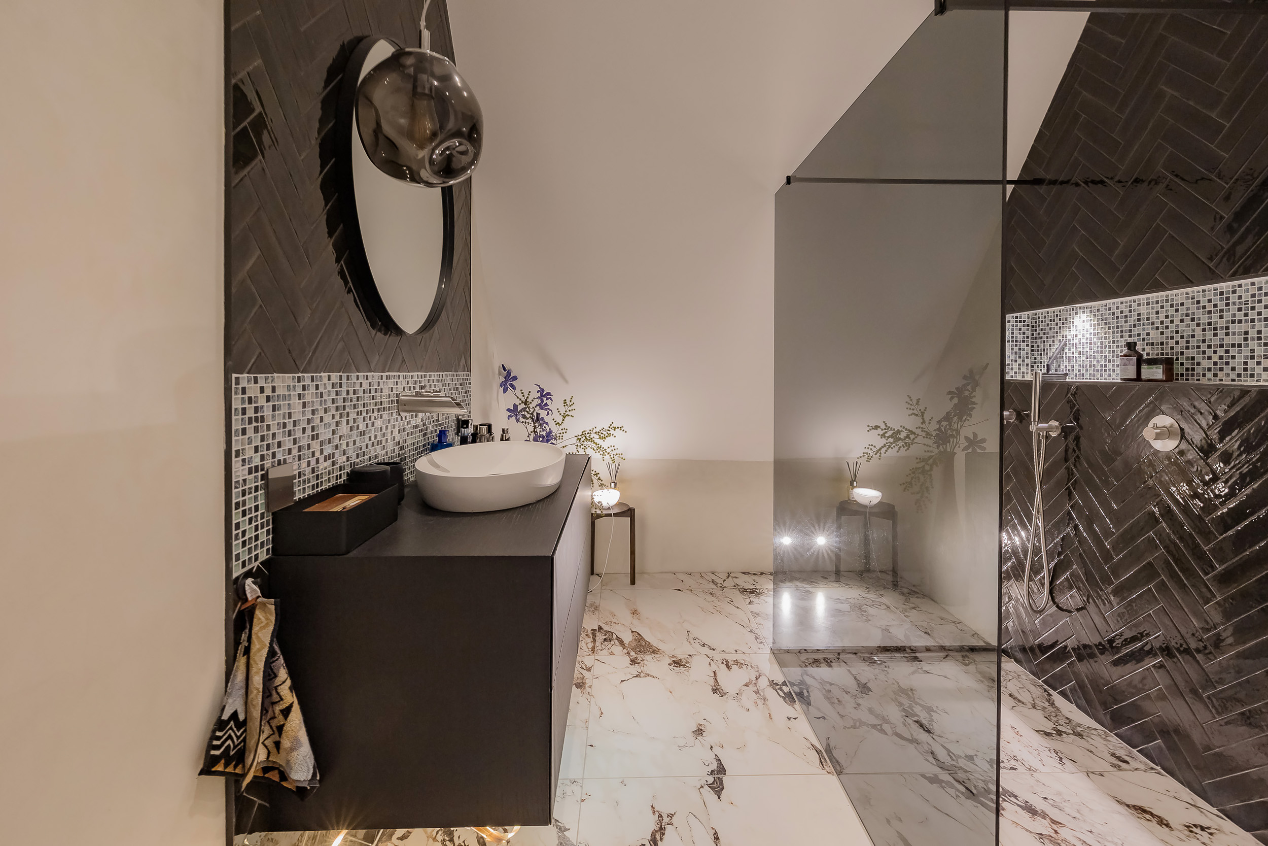 • Turkish limestone flooring on the ground level, oak on the first floor