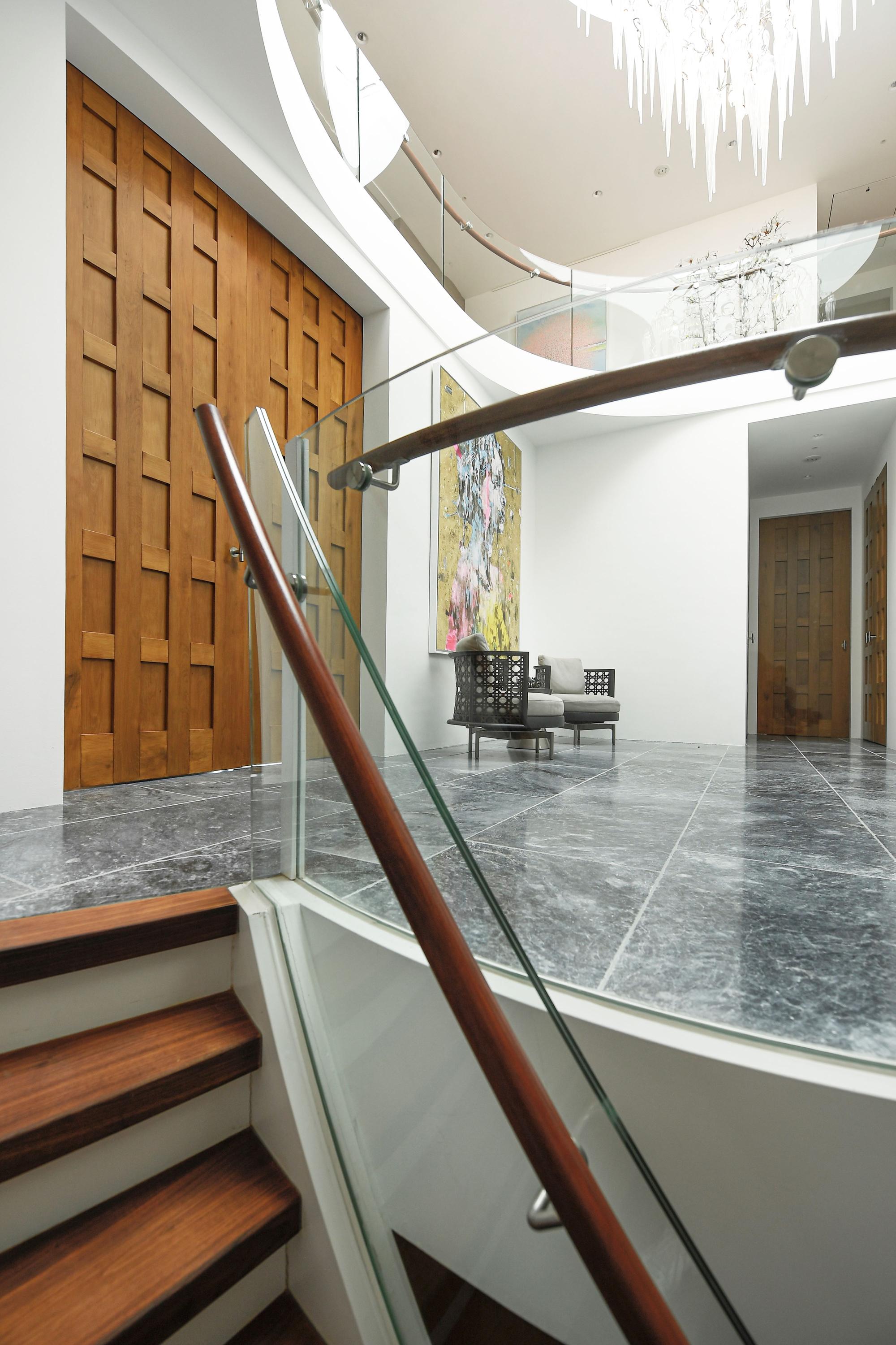 The sculptural staircase leads to a spacious landing with gallery.