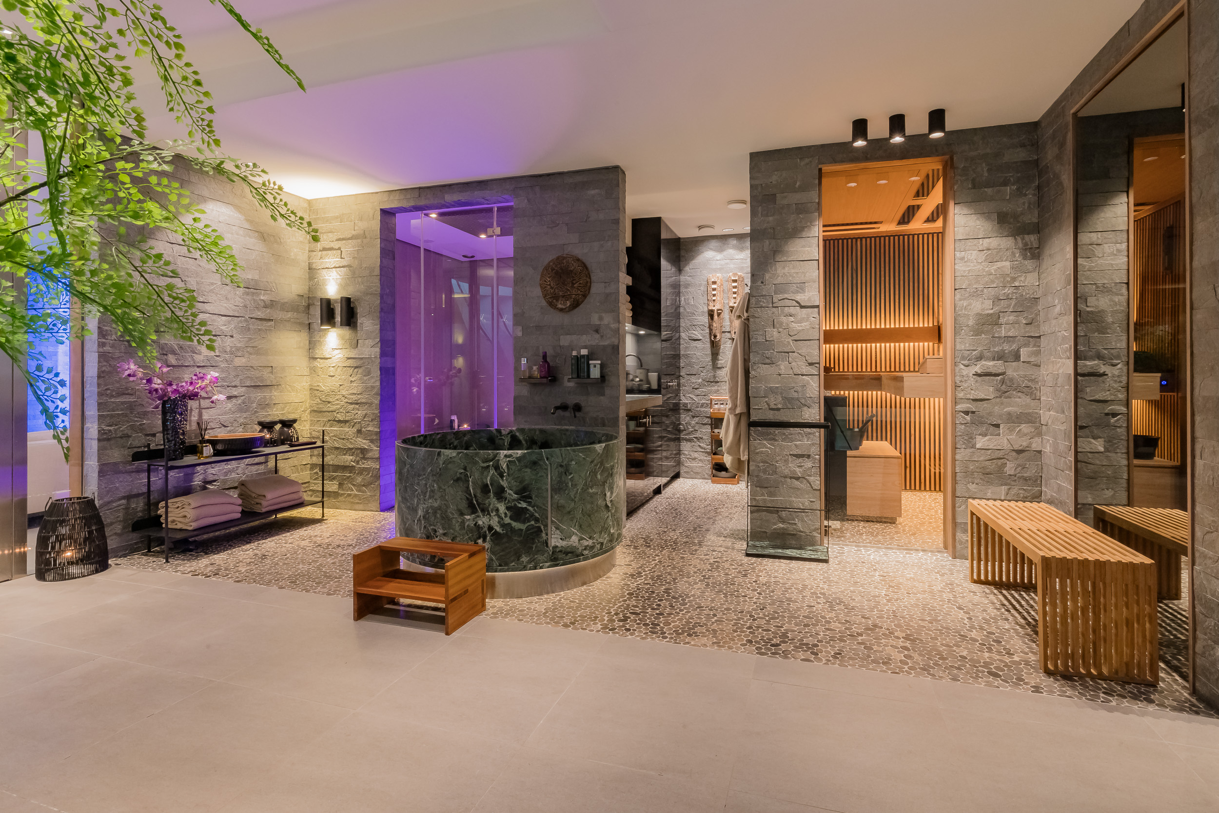 This level also features a modern fitness area, steam cabin, wet infrared sauna, and an exclusive private cinema.