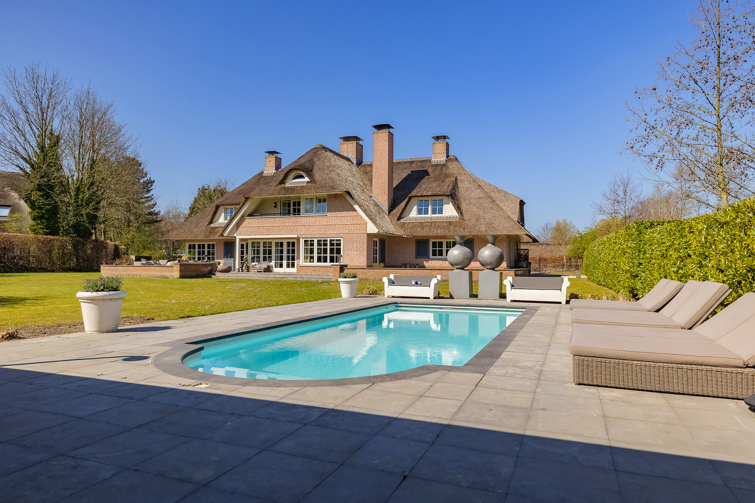 Step into the spacious hall with guest toilet and immediately feel the stylish atmosphere that continues throughout the house. The spacious living room with a beautiful sandstone fireplace and large windows offers a fantastic view of the surrounding garden. For cozy movie nights, there is a separate TV room directly to the right of the entrance. The beautiful concrete-look floor (hallway and living kitchen), luxury steel doors and the high-end kitchen with work island and high-quality appliances provide a modern, yet warm feel. In the living kitchen is further created a lovely sitting area, with access and view of the garden and a modern gas fireplace. Furthermore, on the first floor you will find a practical utility room, double garage, and have access to a spacious porch and a large terrace, where you can fully enjoy the outdoors.