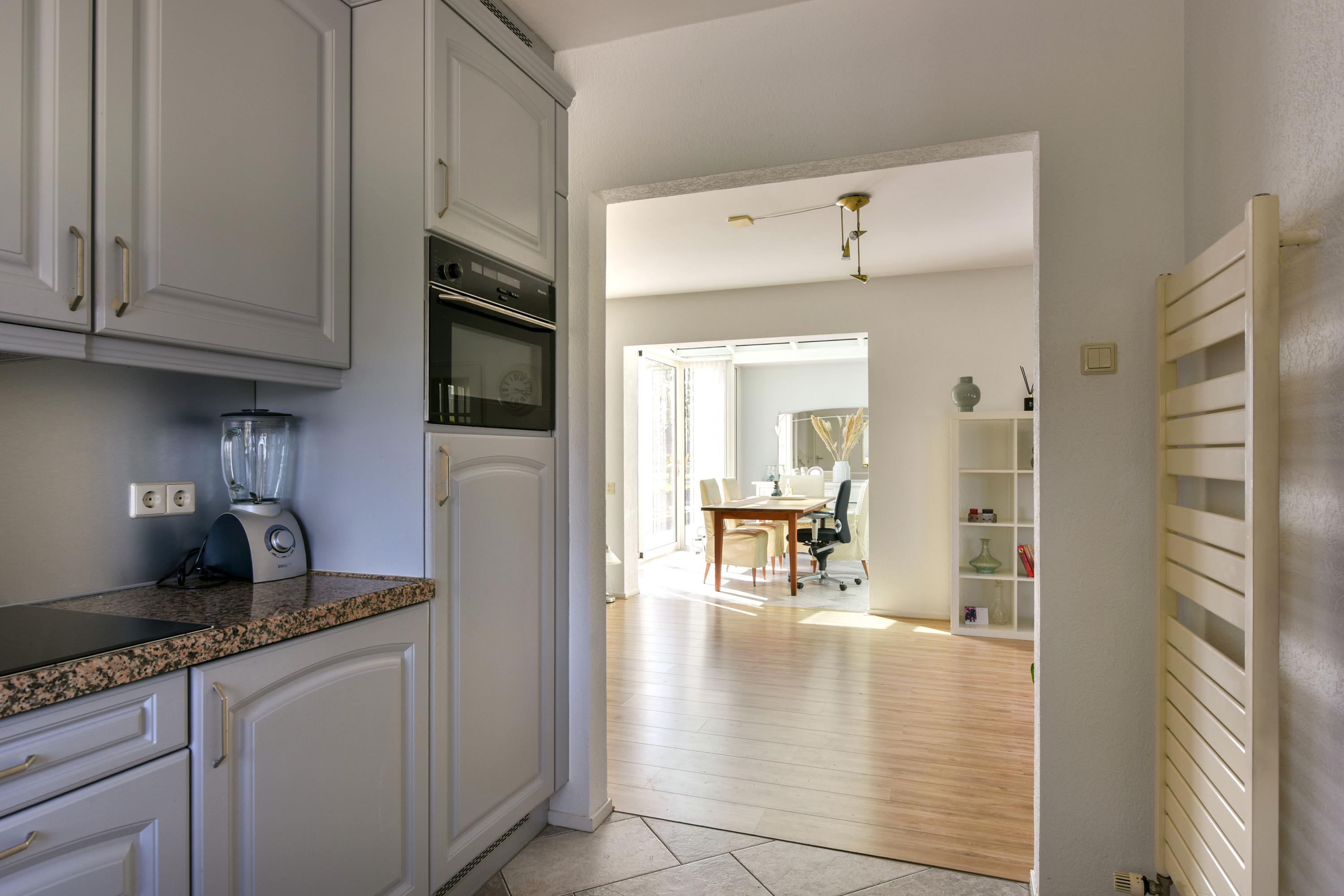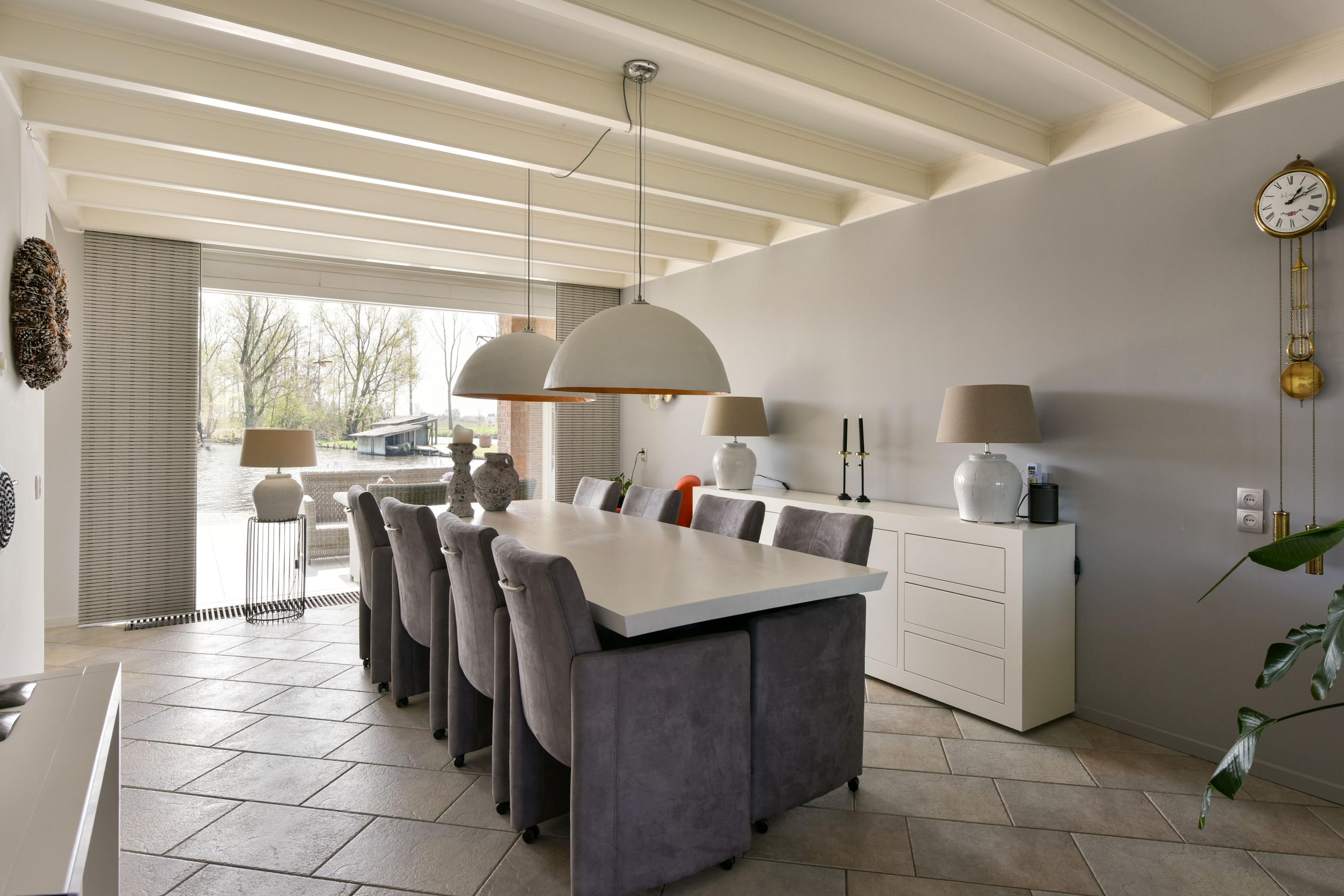 The main residence welcomes you with a light-filled hallway, spacious living area, and expansive views across the water. Large sliding doors, underfloor heating, and modern insulation create a sense of refined comfort. The open kitchen is fully equipped for both daily living and entertaining, while outdoor terraces and a well-kept garden provide tranquil vantage points across the water, with mooring access for your boat and sailing opportunities to the surrounding lakes.