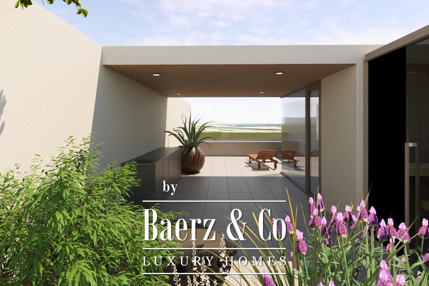 The ground floor welcomes with an entrance hall, living space, kitchen and dining area, leading by internal stair to the private quarters above. The first floor is composed of a master bedroom, two children’s rooms and two bathrooms, ensuring both privacy and flow for family life. The second floor extends outward, offering a covered and uncovered terrace, a swimming pool and technical spaces. Frameless glass walls, chevron oak parquet and Corten steel railings reflect a restrained sense of quality throughout.