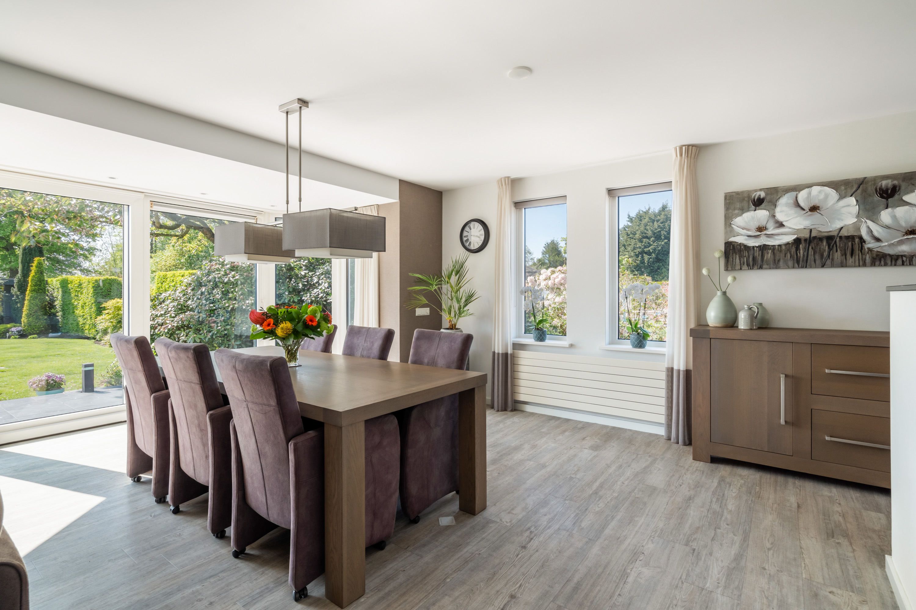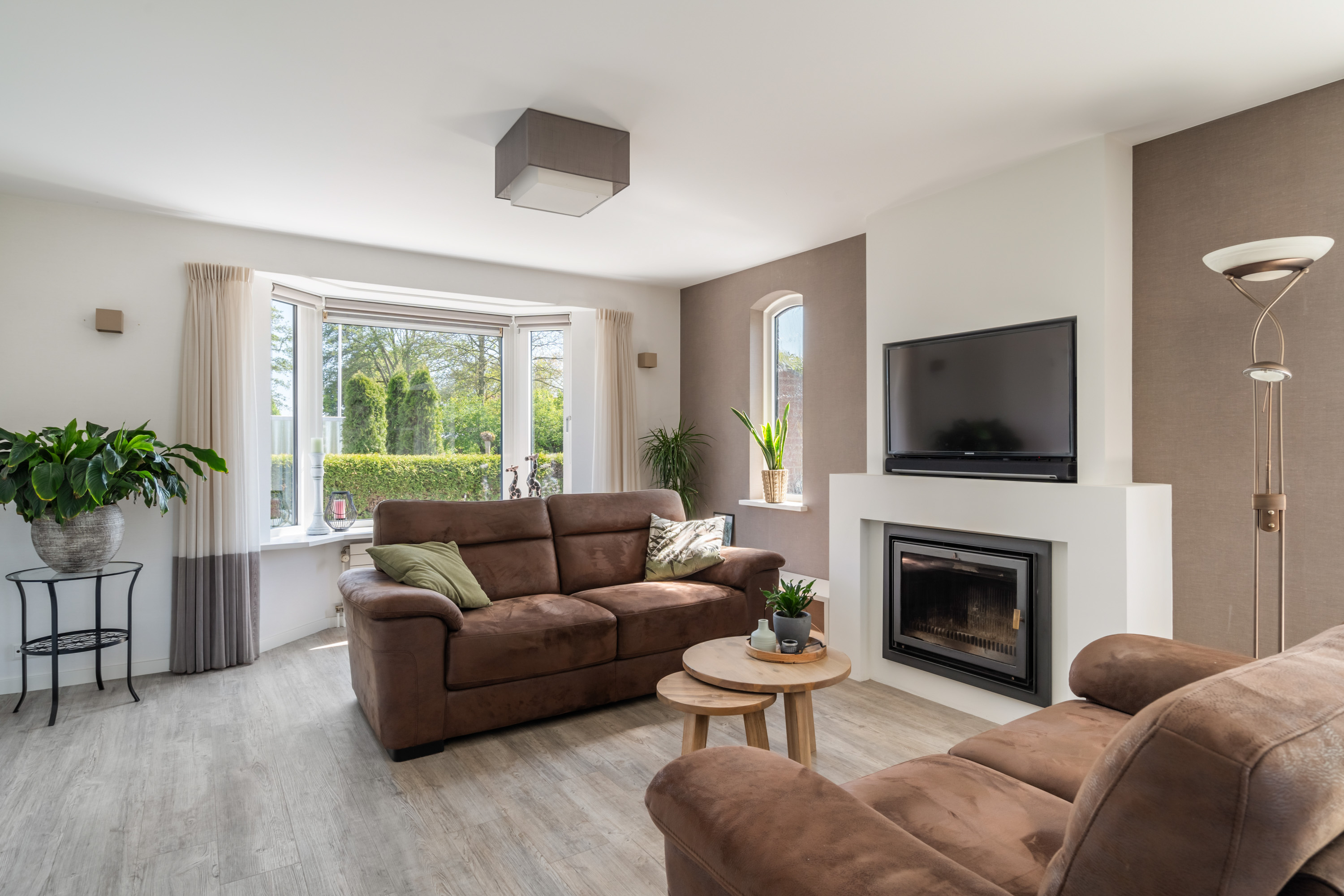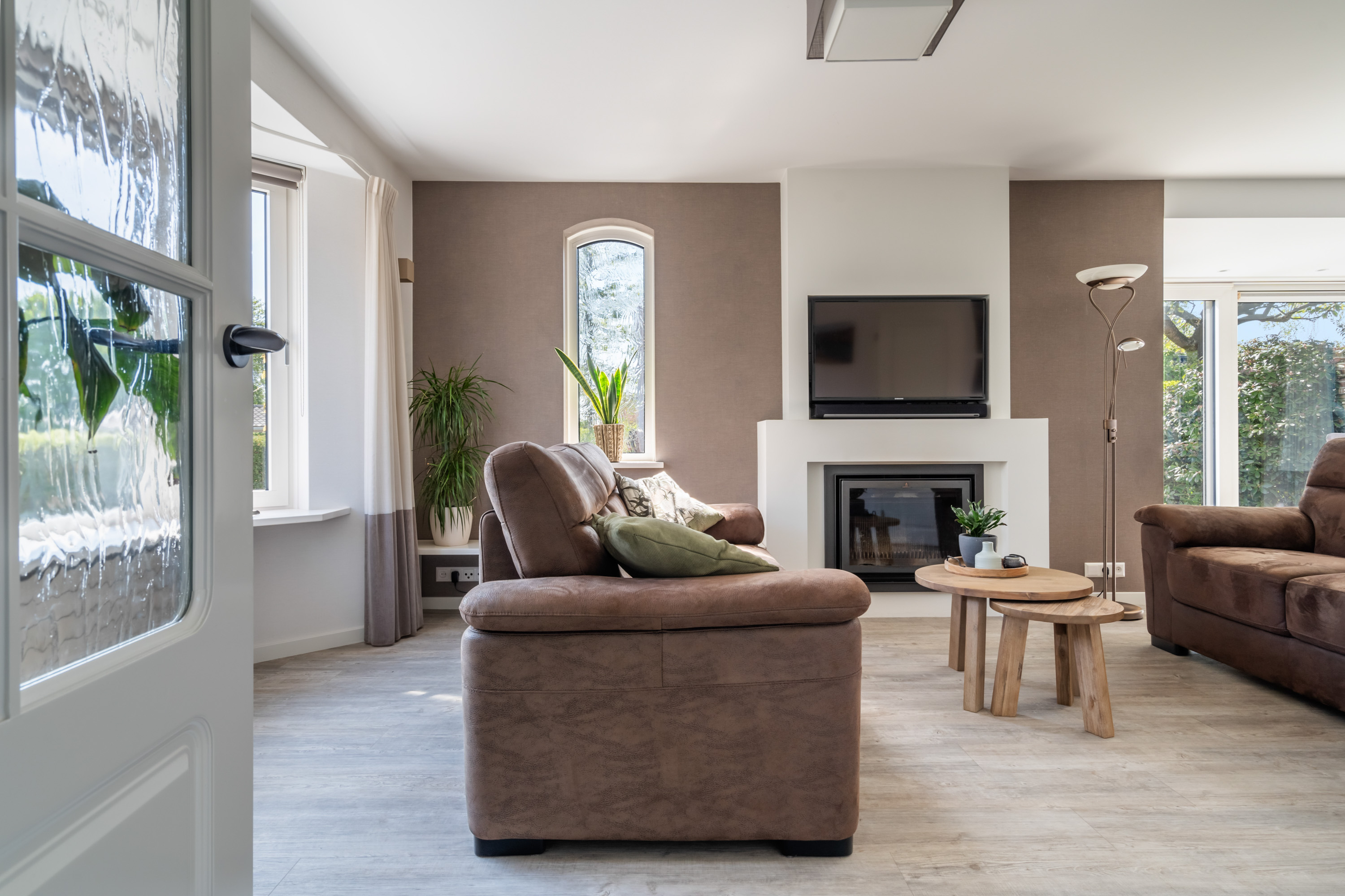 The living room is spacious and bright, with large windows, a side window, a cozy bay window, and sliding doors (with screen) opening to the garden. Around the charming wood-burning fireplace, there’s room for a generous seating area. The PVC floor with underfloor heating adds comfort and a modern feel.