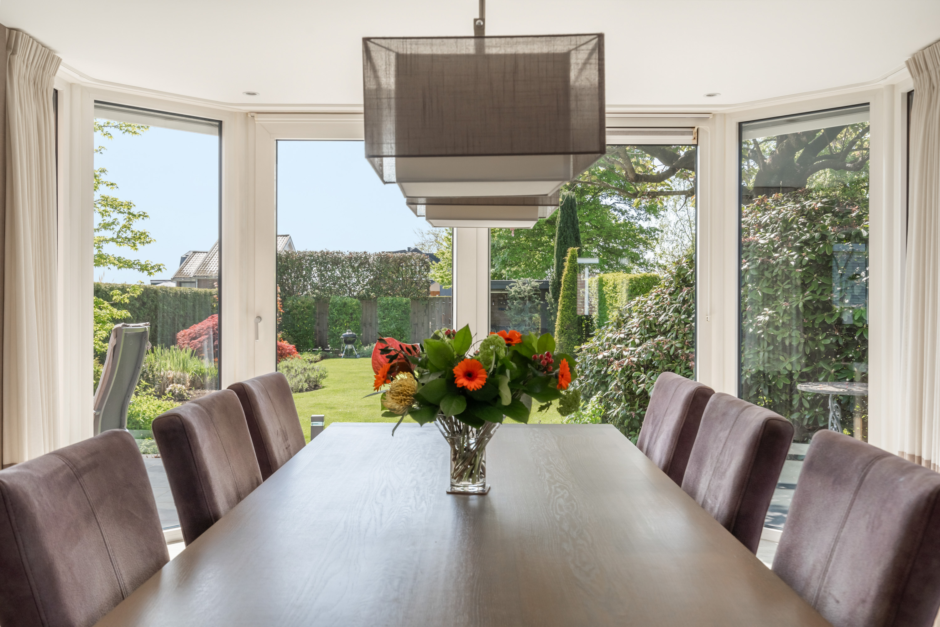 Cook in style: the open U-shaped kitchen is equipped with high-end Siemens appliances, including an induction cooktop with warming zone, steam oven, combi microwave, dishwasher, recirculating hood, pull-out pantry, and a Quooker. The bay window offers space for a large dining table with views of the garden and water.