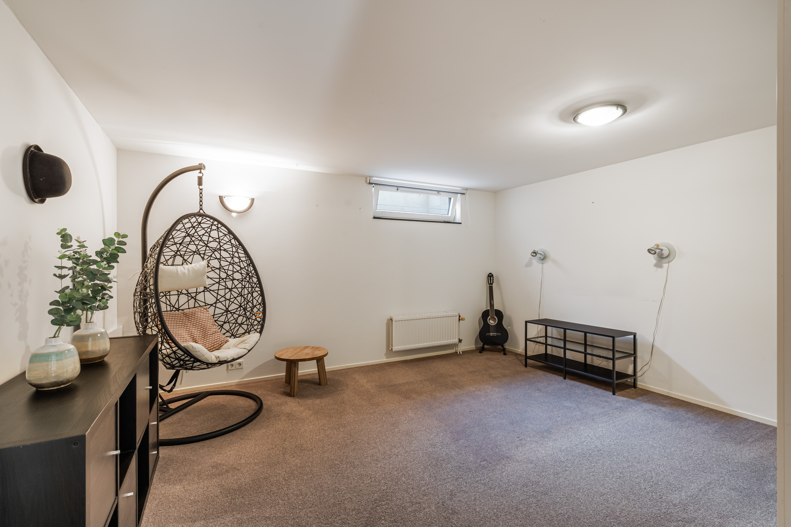 A fixed staircase (in the same style as the main stairway) leads to the basement. Here you’ll find a large laundry area with tiled floor, connections for washer and dryer, a kitchenette, and a freezer. There’s also a lounge with carpet and a spacious bedroom with washbasin, radiator, and window. This level offers many possibilities – ideal for guests, teenagers, or as a self-contained studio.