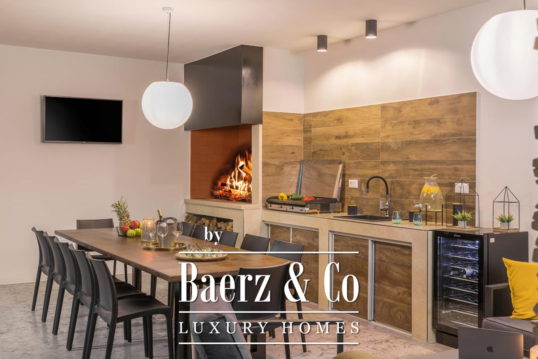 The main building’s two floors create a natural rhythm for living. The ground floor features a bedroom with private bathroom, while the open-plan living area sweeps seamlessly from kitchen through dining space into a relaxing lounge. An additional building sits discreetly within the 1,136 m² plot, housing a bedroom with en suite, sauna, and a jacuzzi that invites calm and tactile restoration after long days.